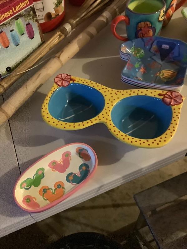 Plastic Picnic plates and serving dishes. Colorful plastic pots. 2 new tiki torches with tiki oil.