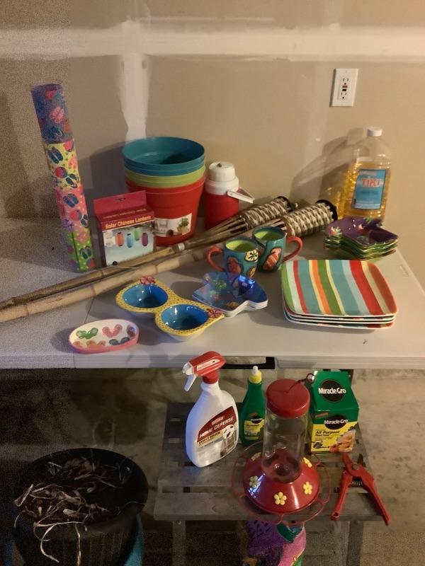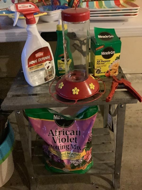 Humming Bird Feeder, lantern lights, thermos, Miracle Gro and other garden sprays. This is an assortment of things you need for your yard, patio, bbq, or picnic. Great lot, perfect timing!
