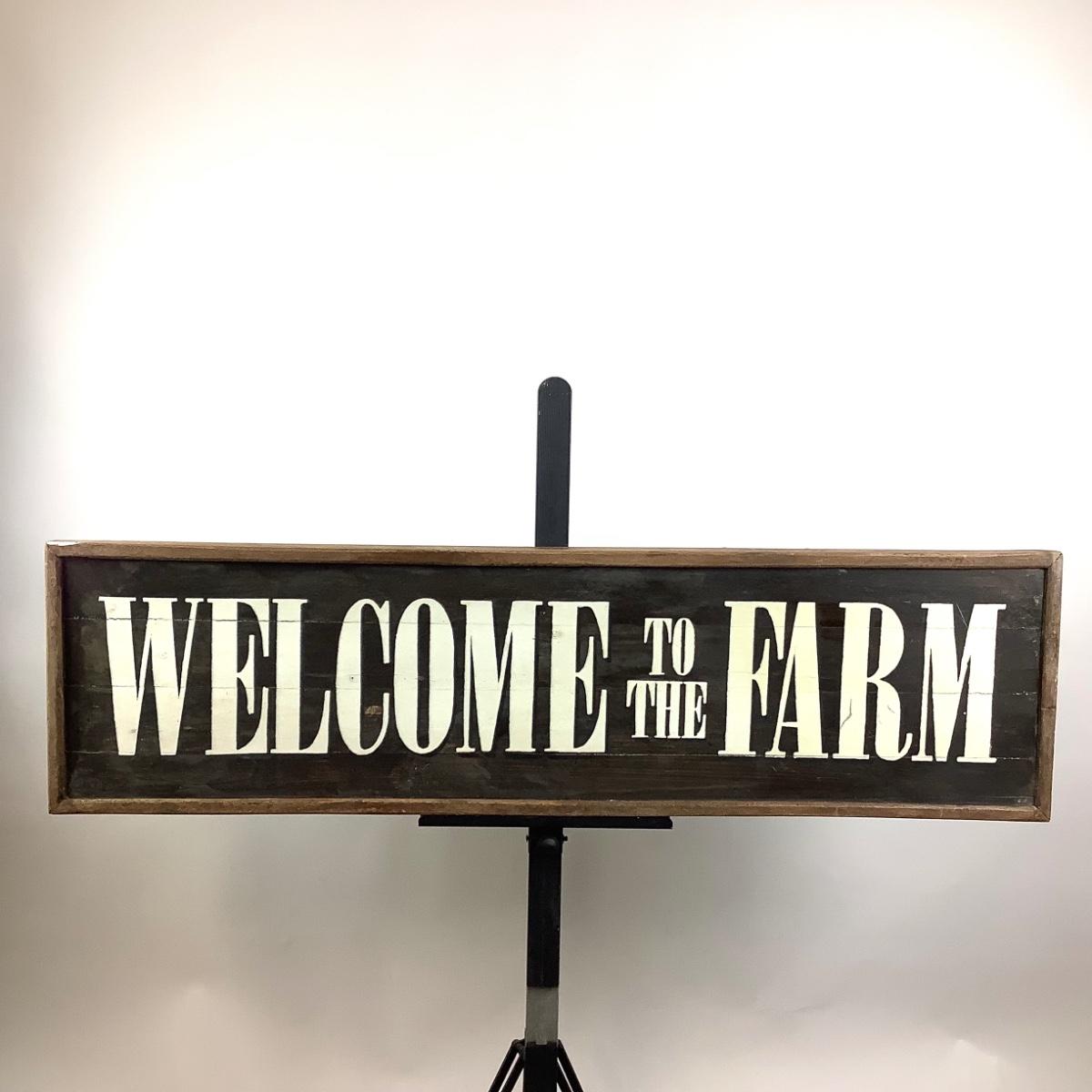 "Welcome to the Farm" white letters painted on black background in wood frame. Intentionally distressed, ready to hang. Measures 44"L, 12"H, 1"D.