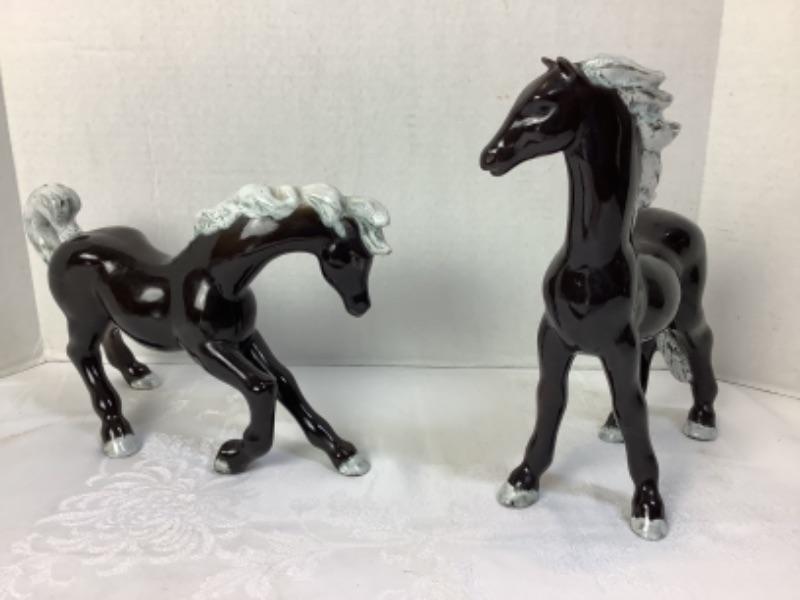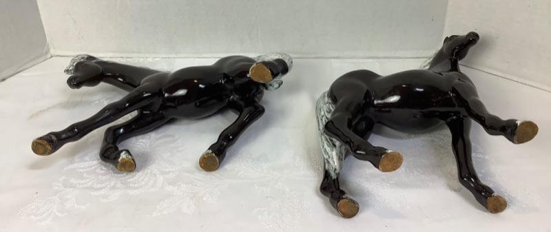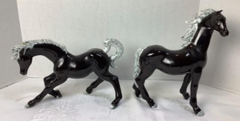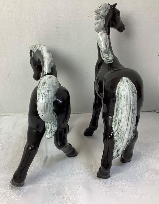 Beautiful pair of mid century ceramic horse figurines measuring 8-1/3” high x 11” and 11” high x 8-1/2”. Excellent condition