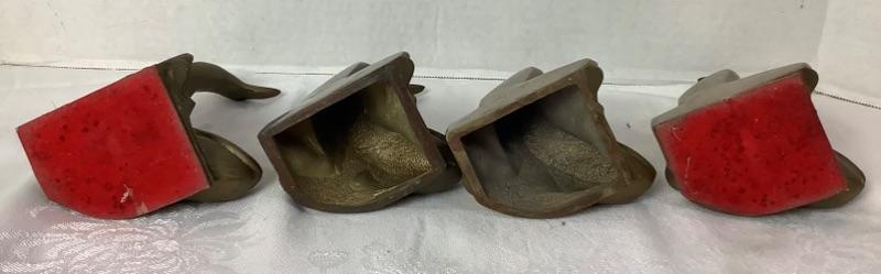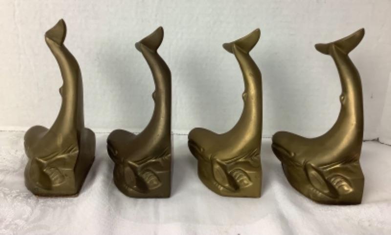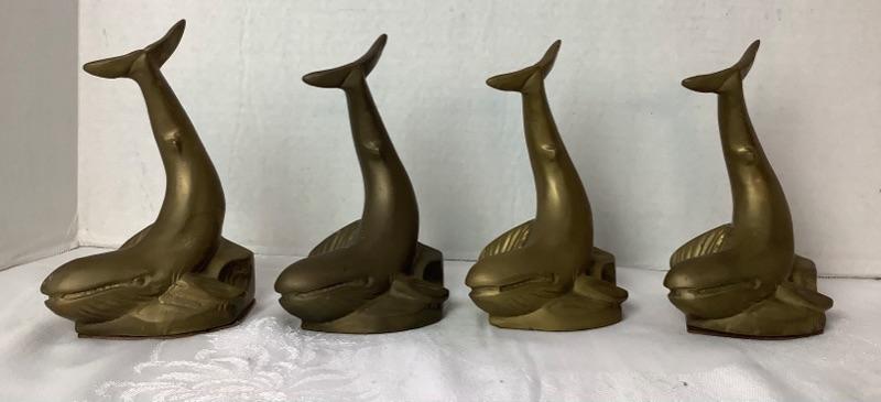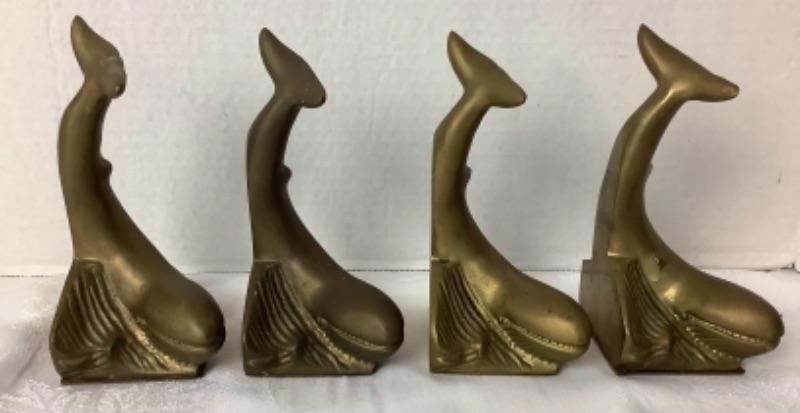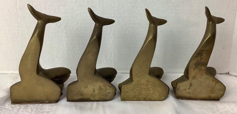 Four brass whale bookends measuring approximately 7” tall, two have felt on the bottom and two do not