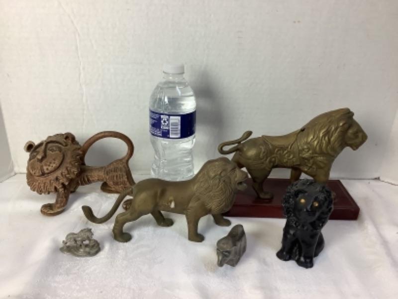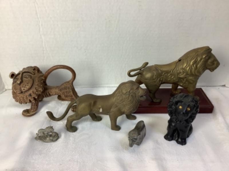 Dr. Harold Mantz mid century modern lion sculpture #1759, Handcrafted Penna Coal Lion figurine, small Dansk lion figurine and two brass lion figurines