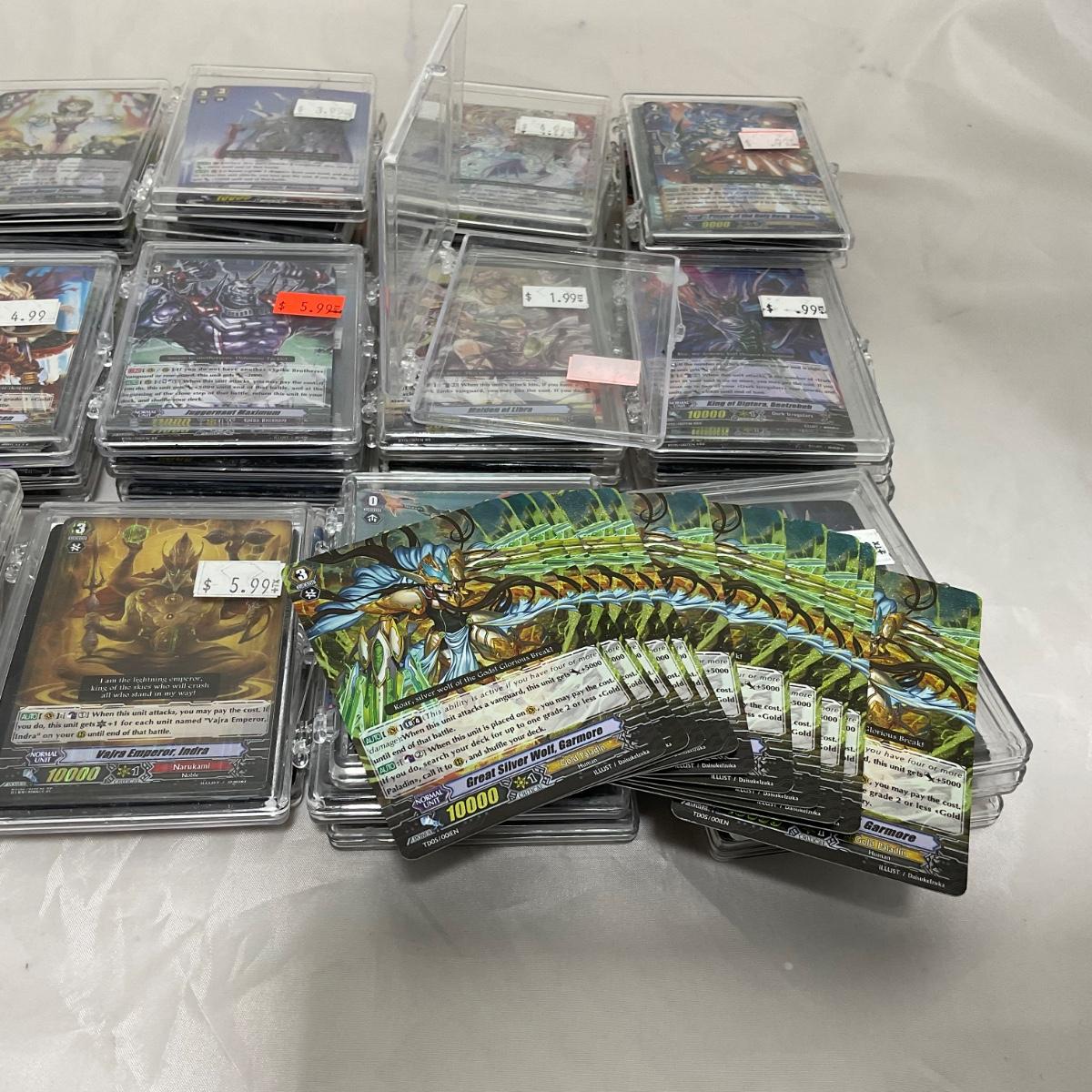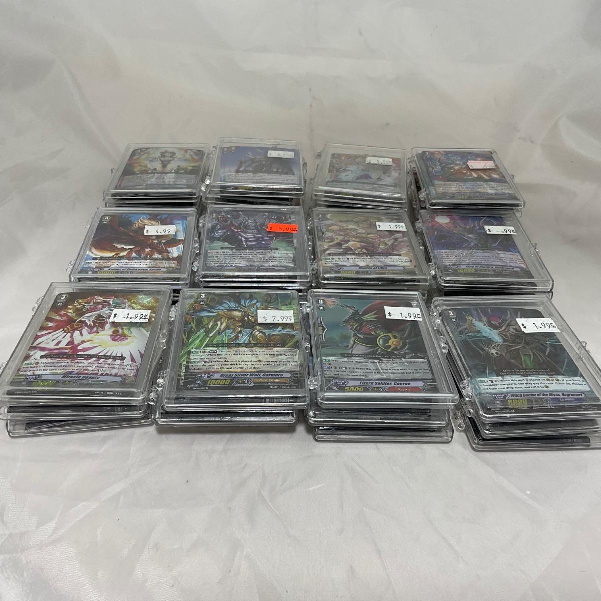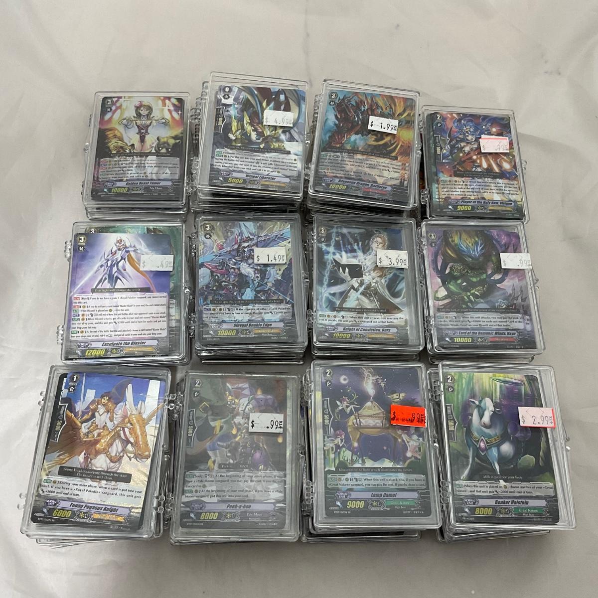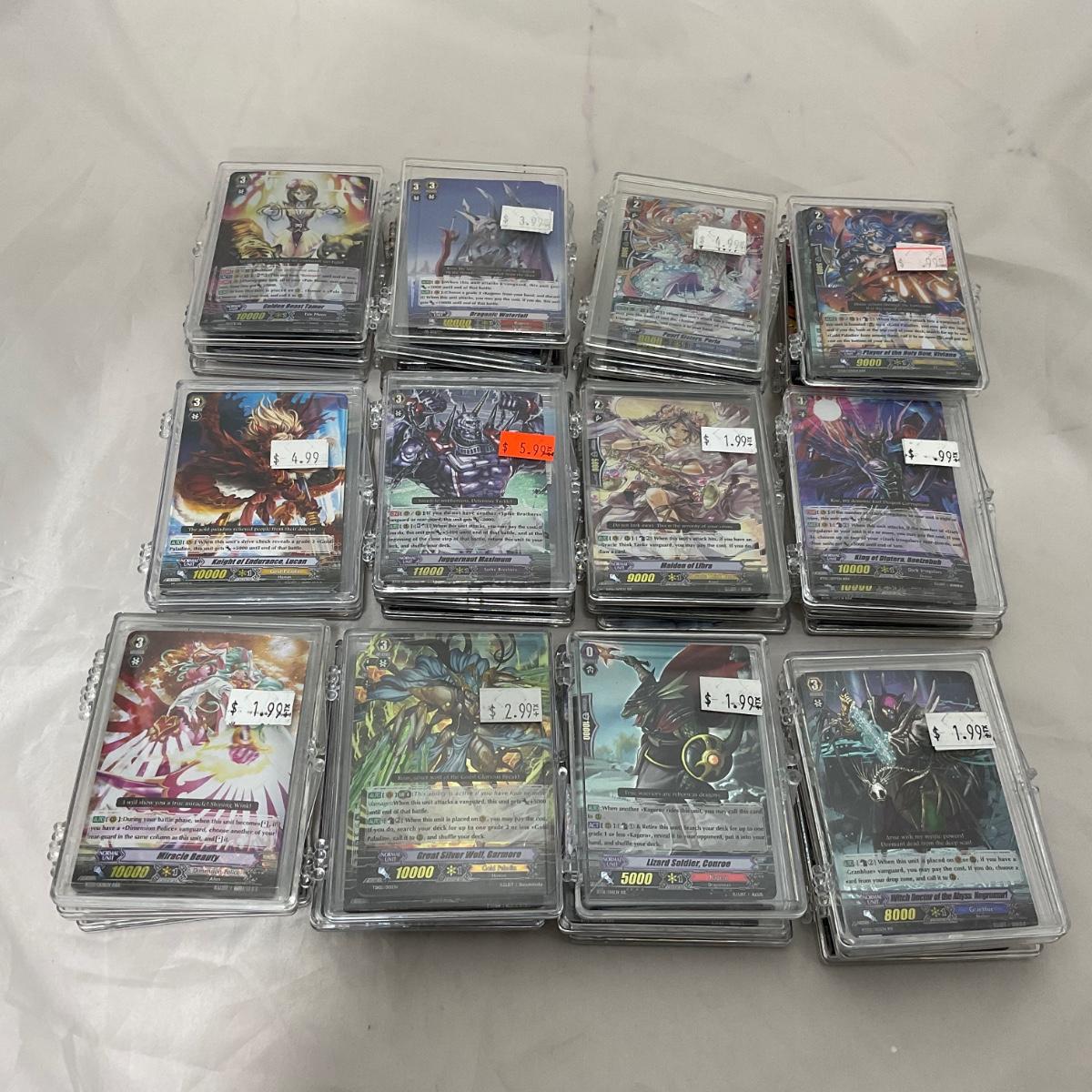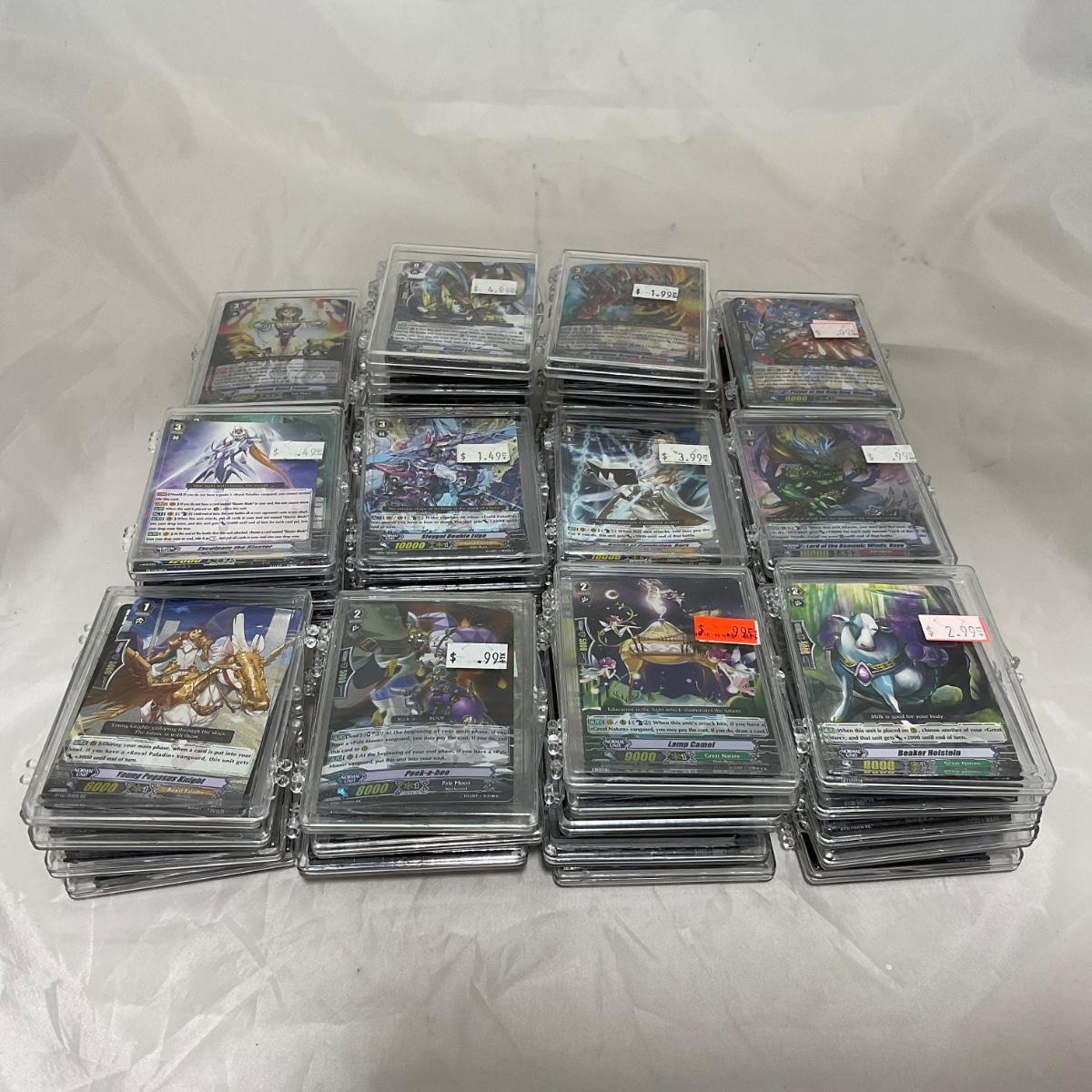 Large lot of cardfight vangaurd gaming cards. Comes with plastic hard covers, there are some covers with more than 5 cards inside each. Please see photos for details and condition. ::: Shipping is available on this lot. If you require shipping you must let us know at the close of the auction. We will coordinate with you after the item has been won. Shipping fees will include insurance up to or exceeding the value of all items being mailed. If you have any questions regarding this lot please contact the auctioneer either via this website, by direct email or by phone. PICK UP TIMES and other important information can be found in the TERMS and DESCRIPTION of the auction. Please take a look for pertinent information. Thanks!