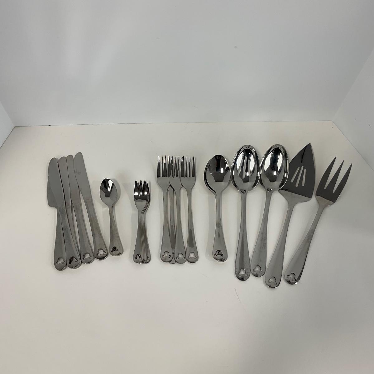 Mickey Mouse 25 piece set of silverware. In used well loved condition. Please see photos for details and condition. Any condition statement is given as a courtesy to a client, is an opinion, and should not be treated as a statement of fact. Reference to condition written, oral or within a condition report shall not be regarded as a full account of condition and may not include all defects, alterations, or restorations. Absence of a condition report does not imply a lot is flawless or lacking imperfections or damage. Katherine’s Auction & Appraisal Service shall have no responsibility for any error or omission. Returns shall not be accepted on the basis of condition. ::: Shipping is available on this lot. If you require shipping you must let us know at the close of the auction. We will coordinate with you after the item has been won. Shipping fees will include insurance up to or exceeding the value of all items being mailed. If you have any questions regarding this lot please contact the auctioneer either via this website, by direct email or by phone. PICK UP TIMES and other important information can be found in the TERMS and DESCRIPTION of the auction. Please take a look for pertinent information. Thanks!