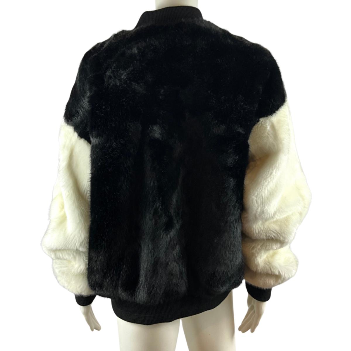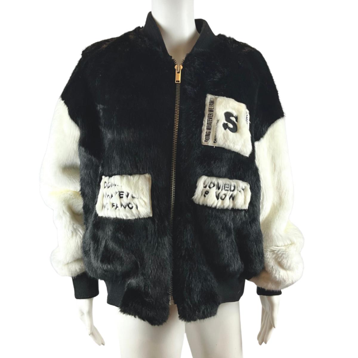 219. SJYP Black and White Faux Fur Coat with Embroidered Patches