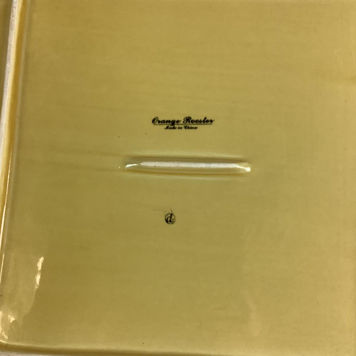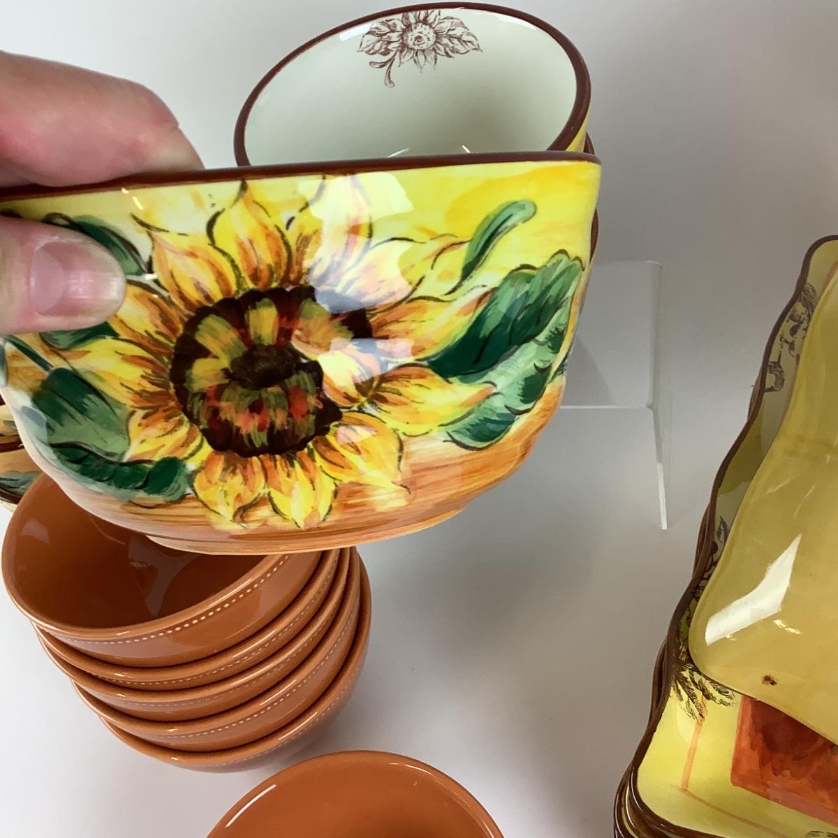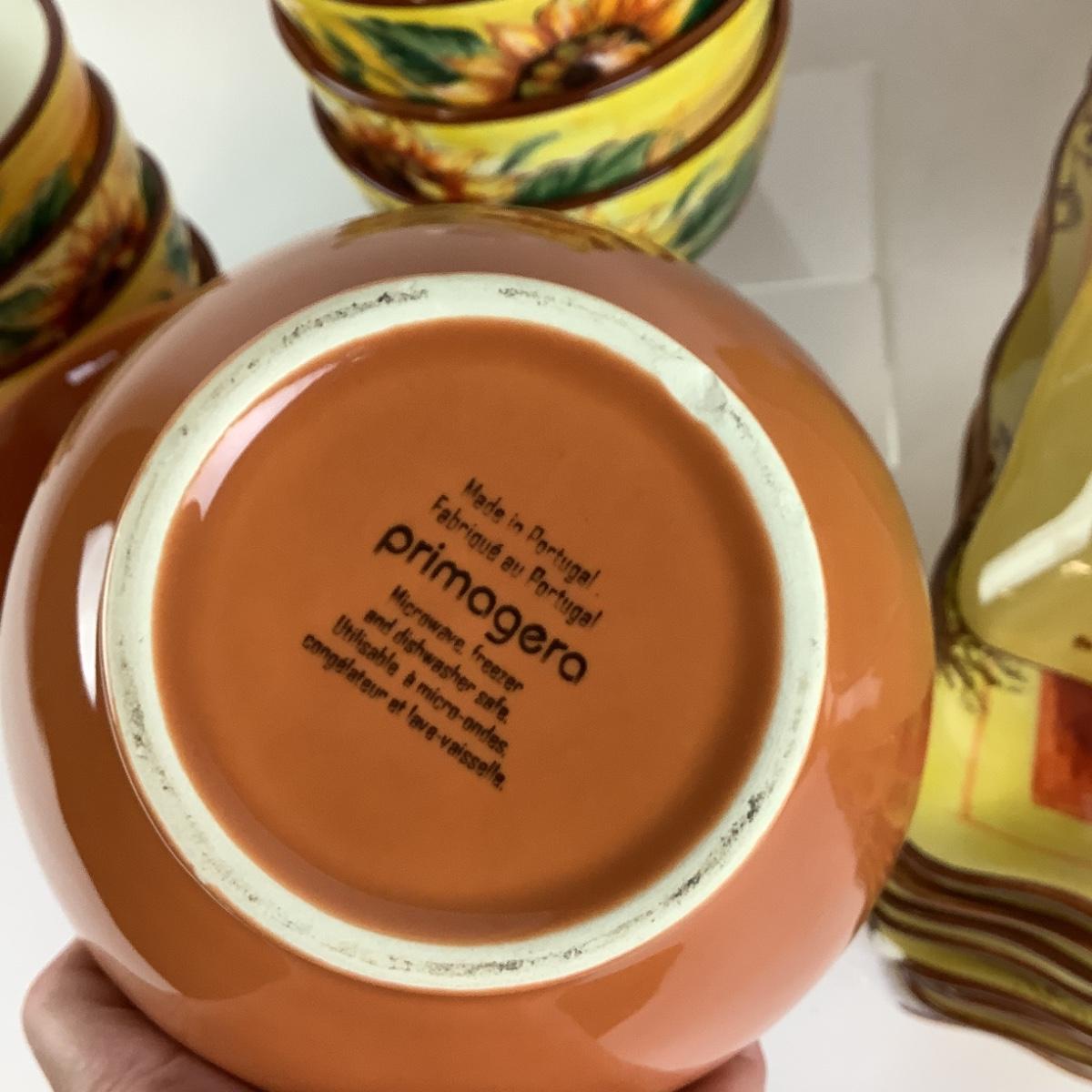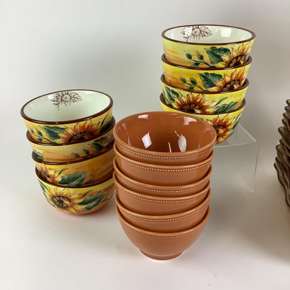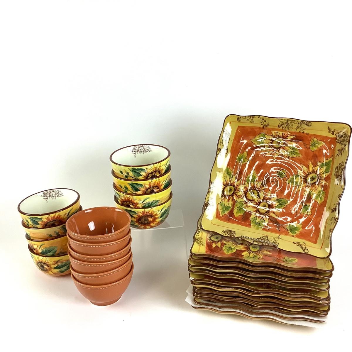 Set of ceramic sunflower and terracotta mix-match tableware. Twelve large 11.5" square sunflower plates and eight sunflower 5.5" x 4" bowls. Six terracotta glaze 5.5" x 4" "Primagero" bowls made in Portugal.