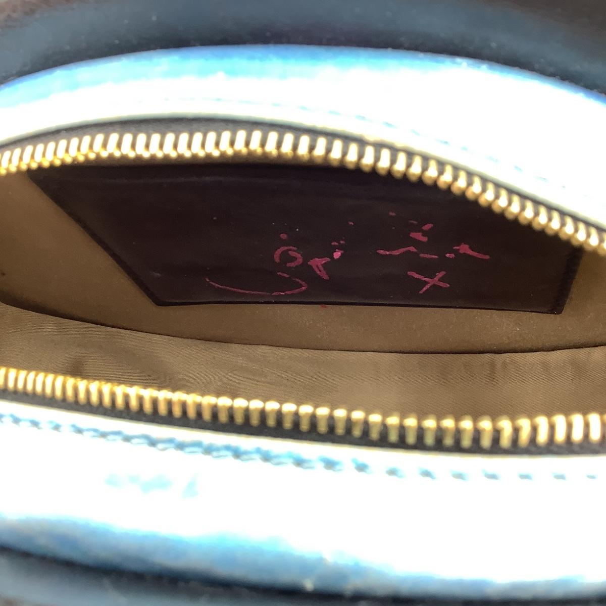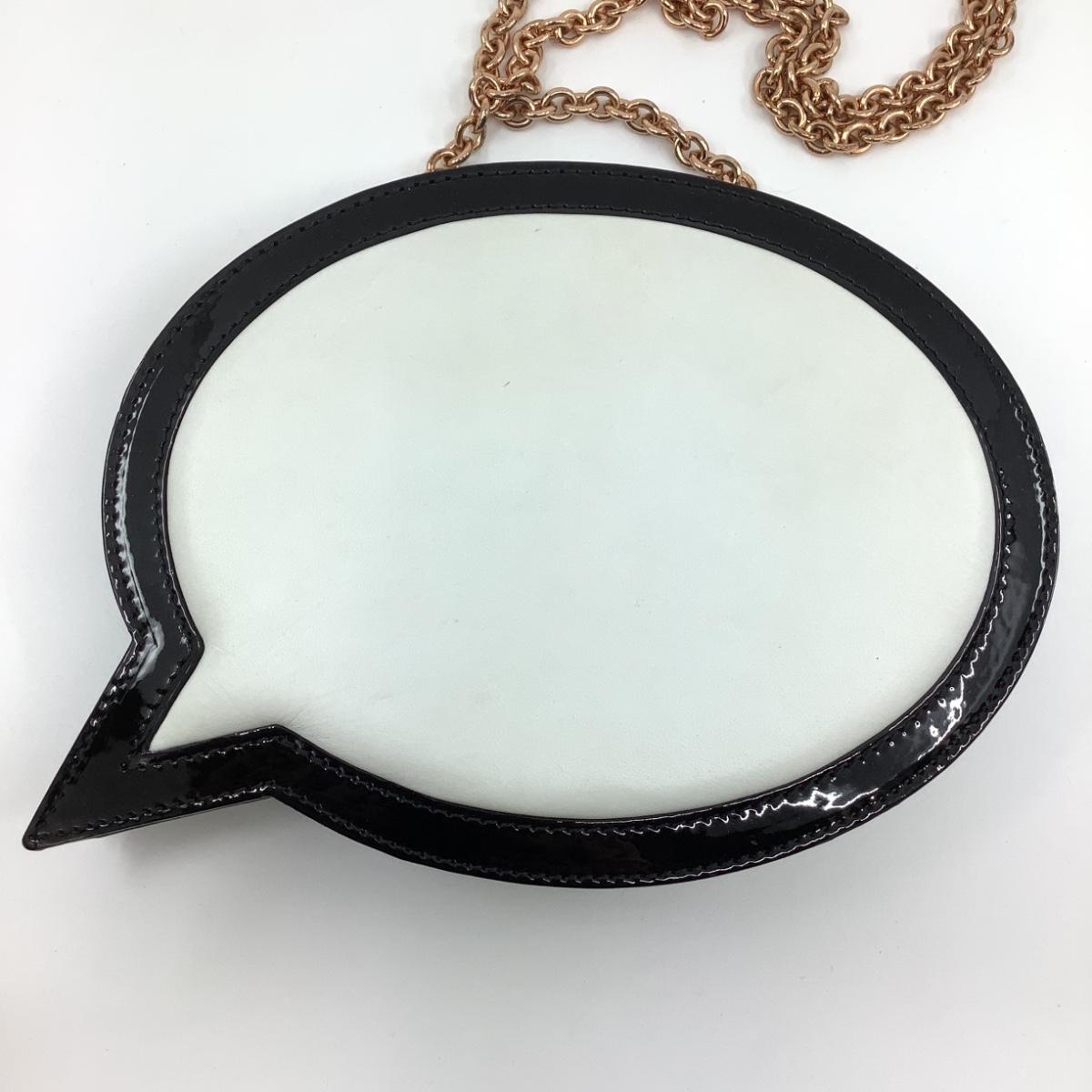 Gently Used with rose gold tone chain strap. Has some imperfection marks to white leather due to wear .