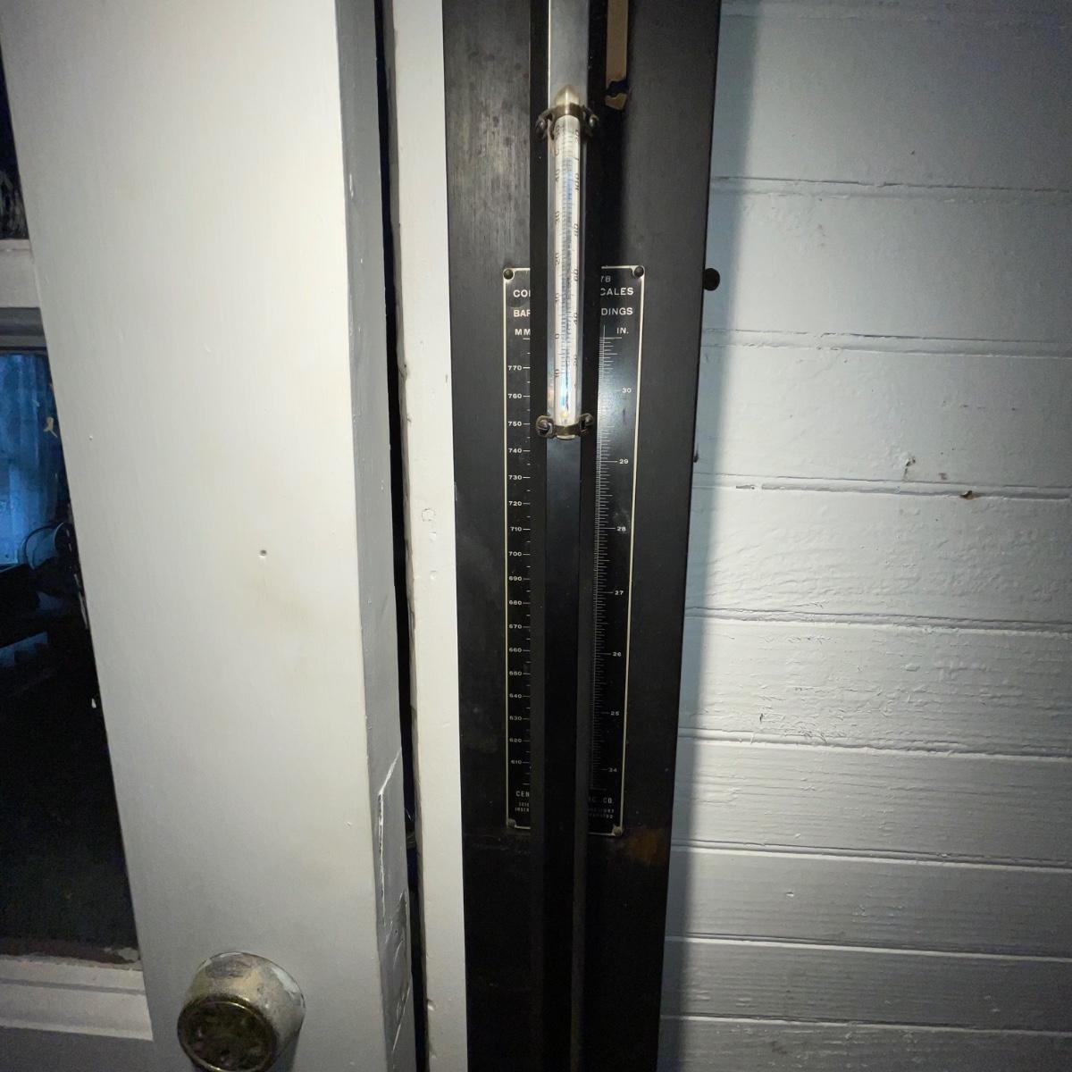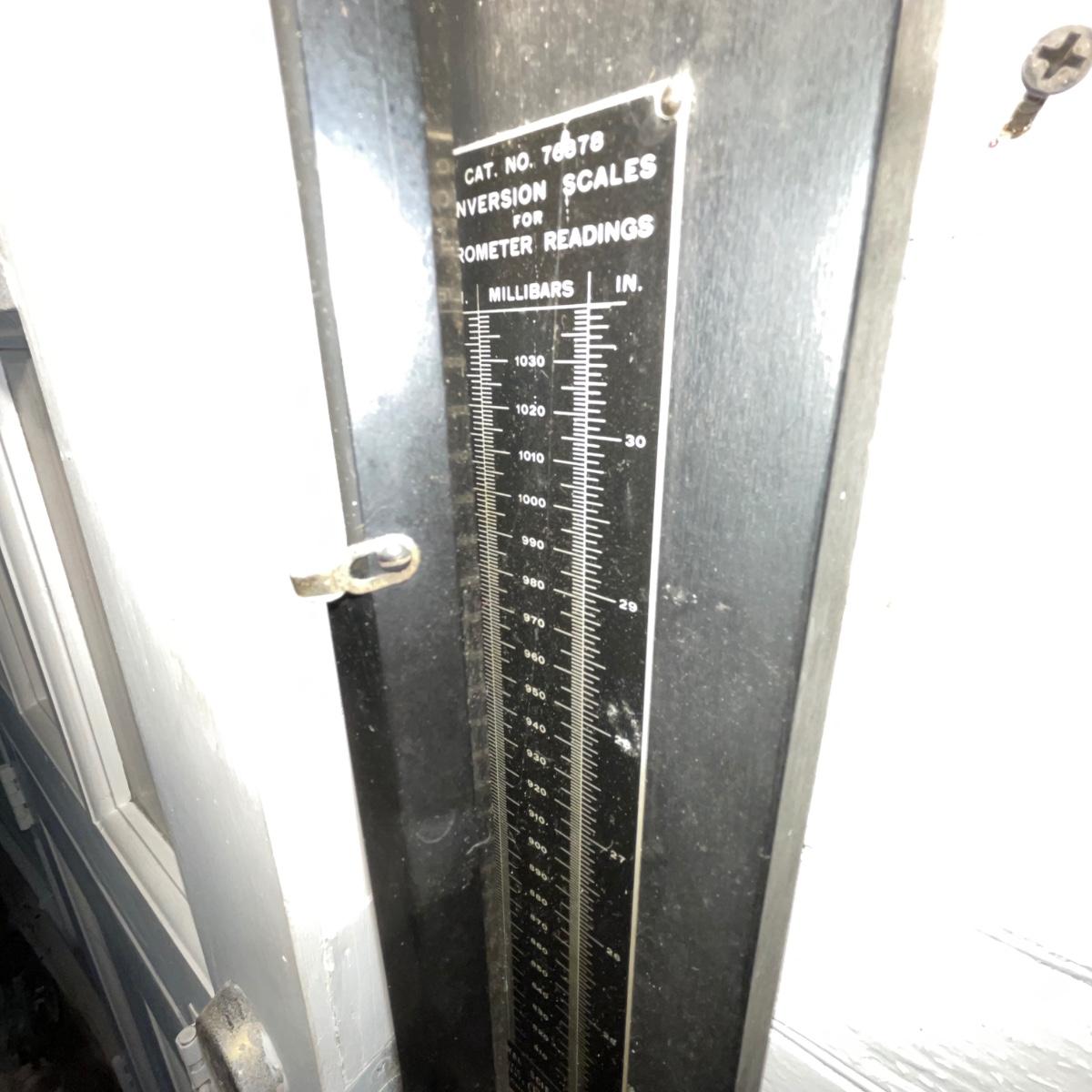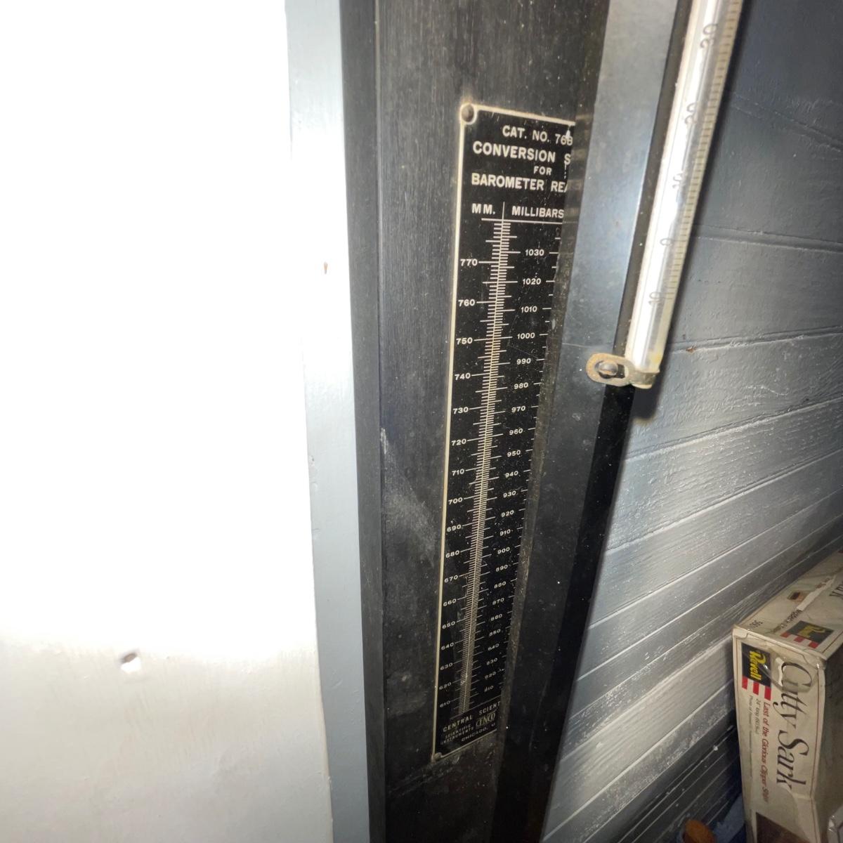 Vintage Central Scientific barometer. The thermometer lower portion is broken and missing. The internal vertical glass two for the barometer appears to be intact. The bottom glass reservoir that holds the mercury is full. Measures