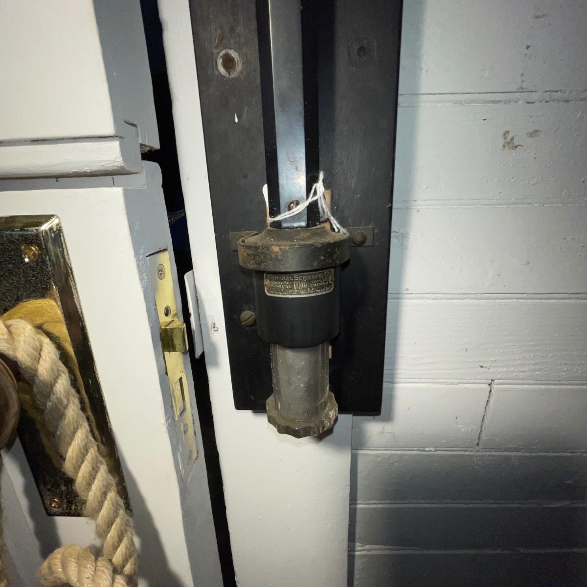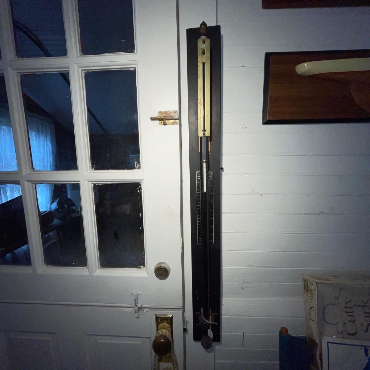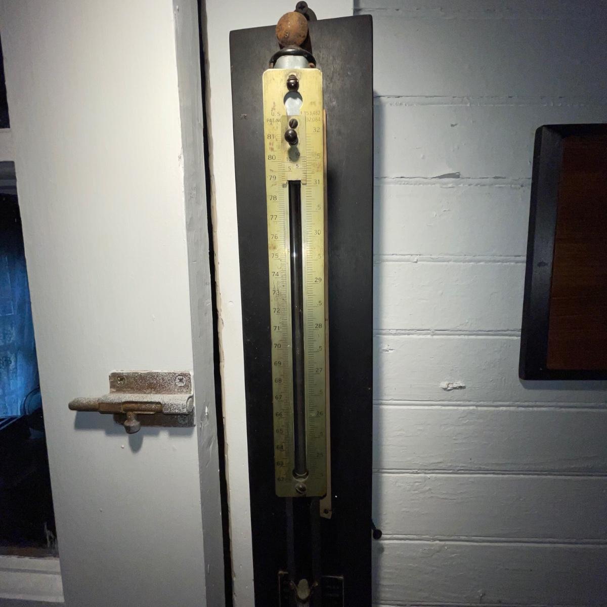 Vintage Central Scientific barometer. The thermometer lower portion is broken and missing. The internal vertical glass two for the barometer appears to be intact. The bottom glass reservoir that holds the mercury is full. Measures