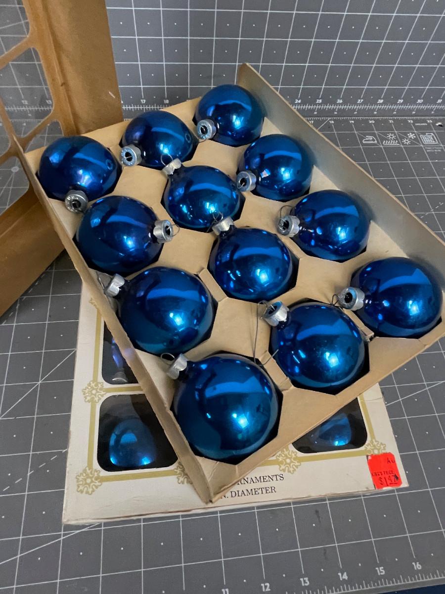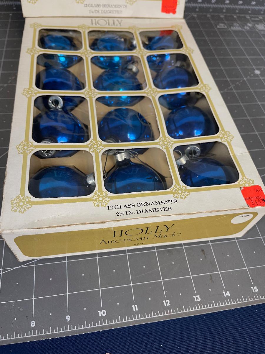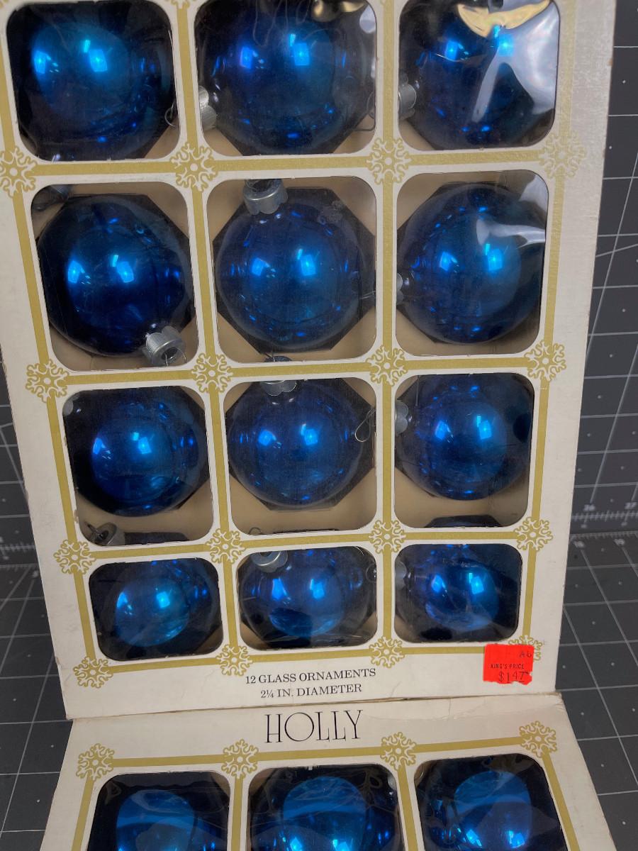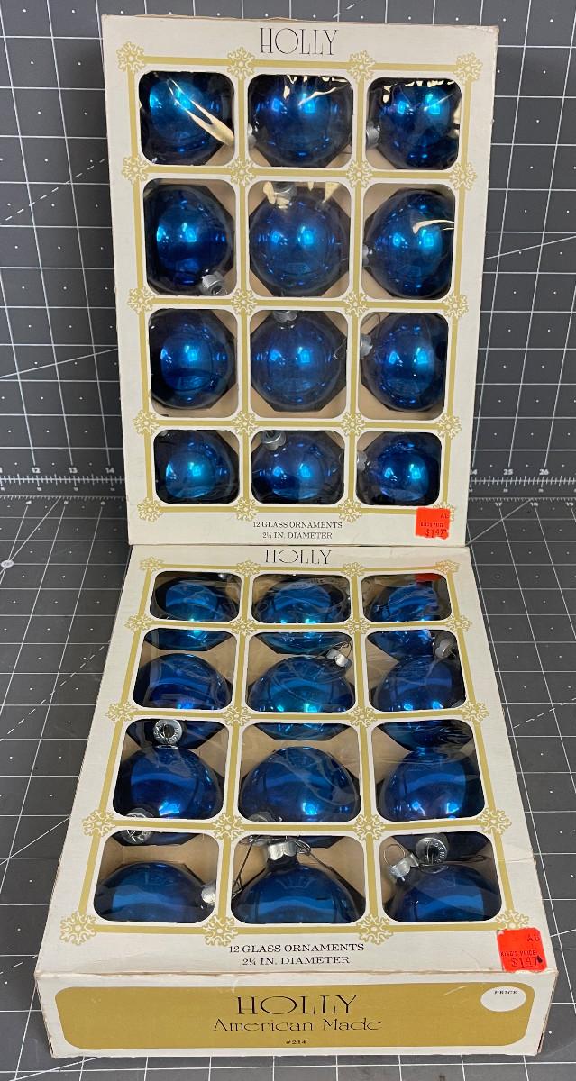#22 24 Blue Christmas Holly Glass Ornaments 2-1/4 Size