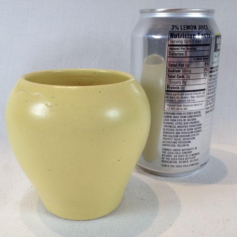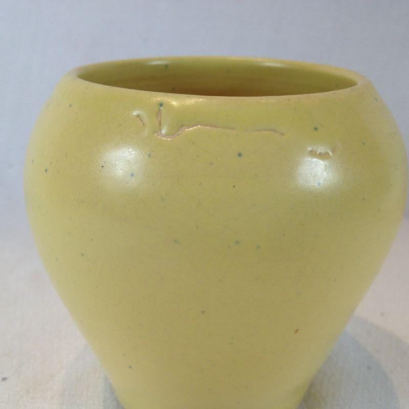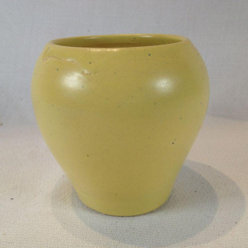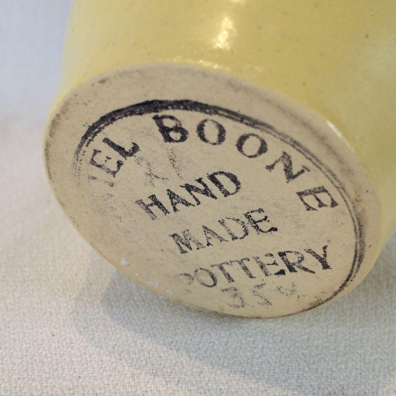 This lot is a for an Arts & Crafts Style Vase, marked Daniel Boone Hand Made Pottery and produced in the mellow yellow coloration. Daniel Boone Pottery was a line of tourist ware made and distributed for souvenir sales to gift shops at locals such as Lincoln Homestead, Cumberland Falls and Mammoth Cave, by the Louisville Pottery Company which operated until around 1955 This piece measures about 4.5-inches in diameter X 4-inches high.