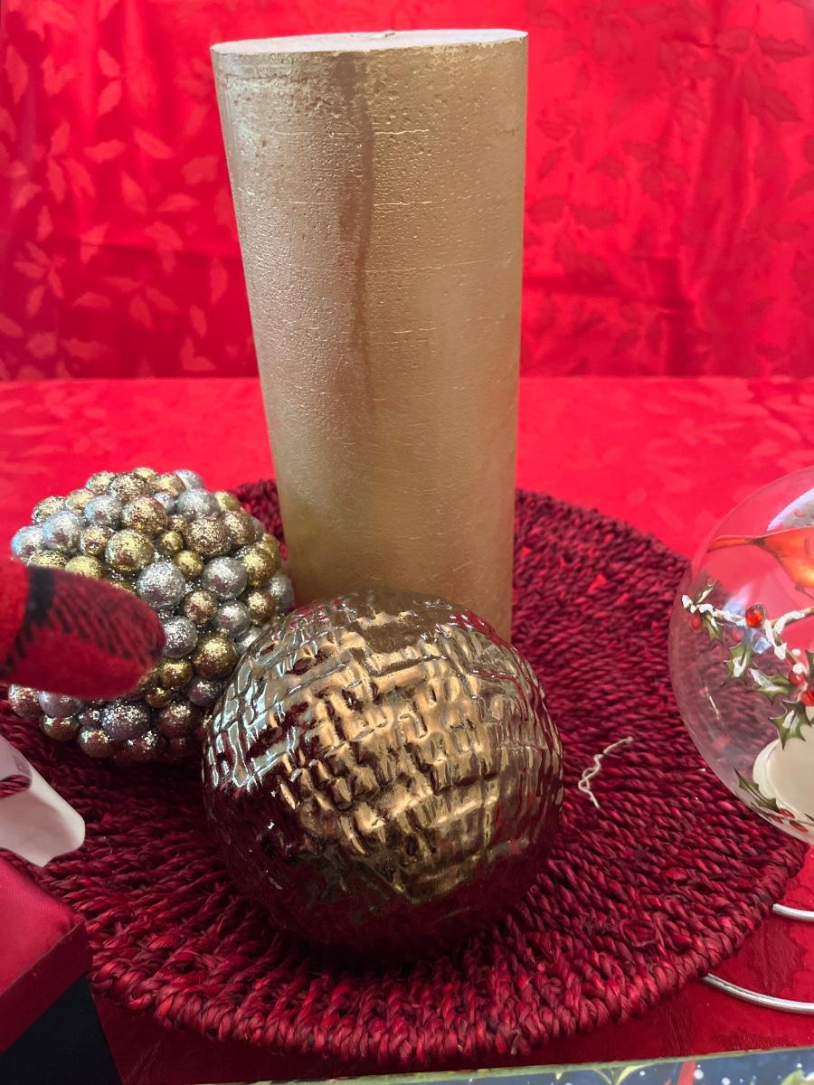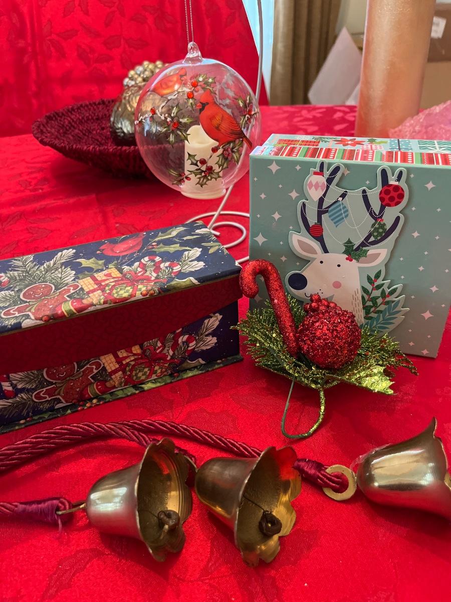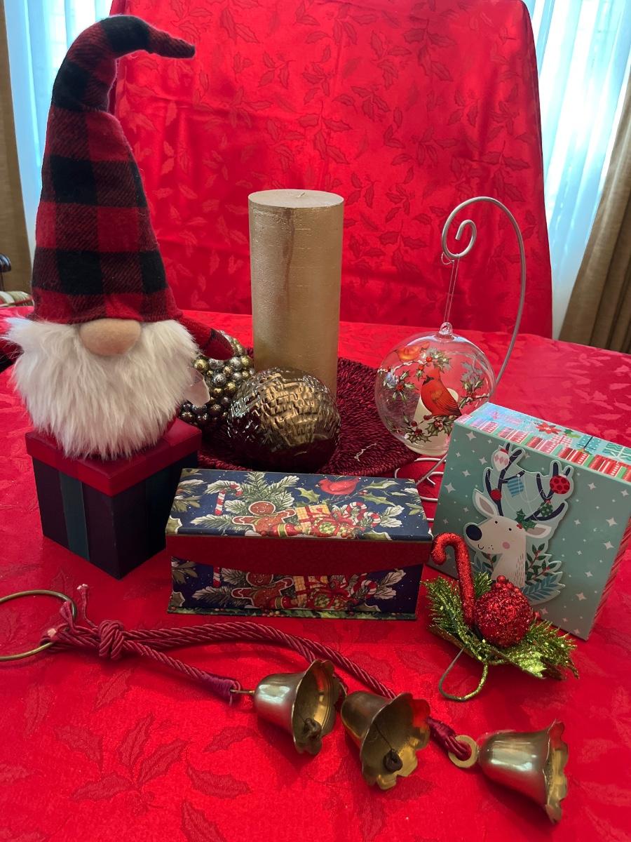22- basket, decorative balls, brass door, bells, cardinal, ornament, boxes