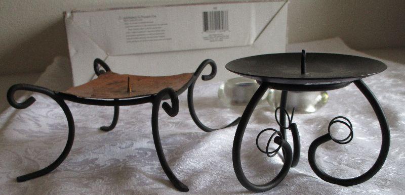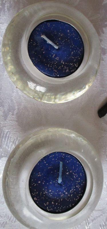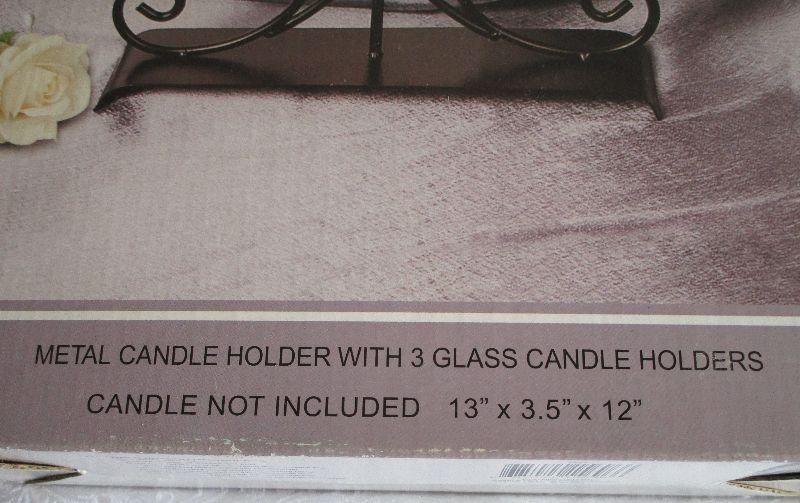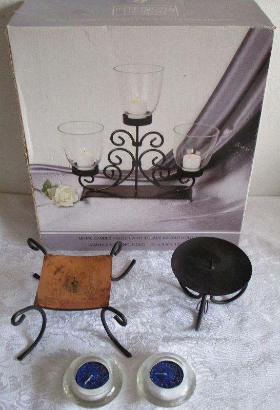 Brand new in box three candle holder; two small candle holders; and two tea light candles