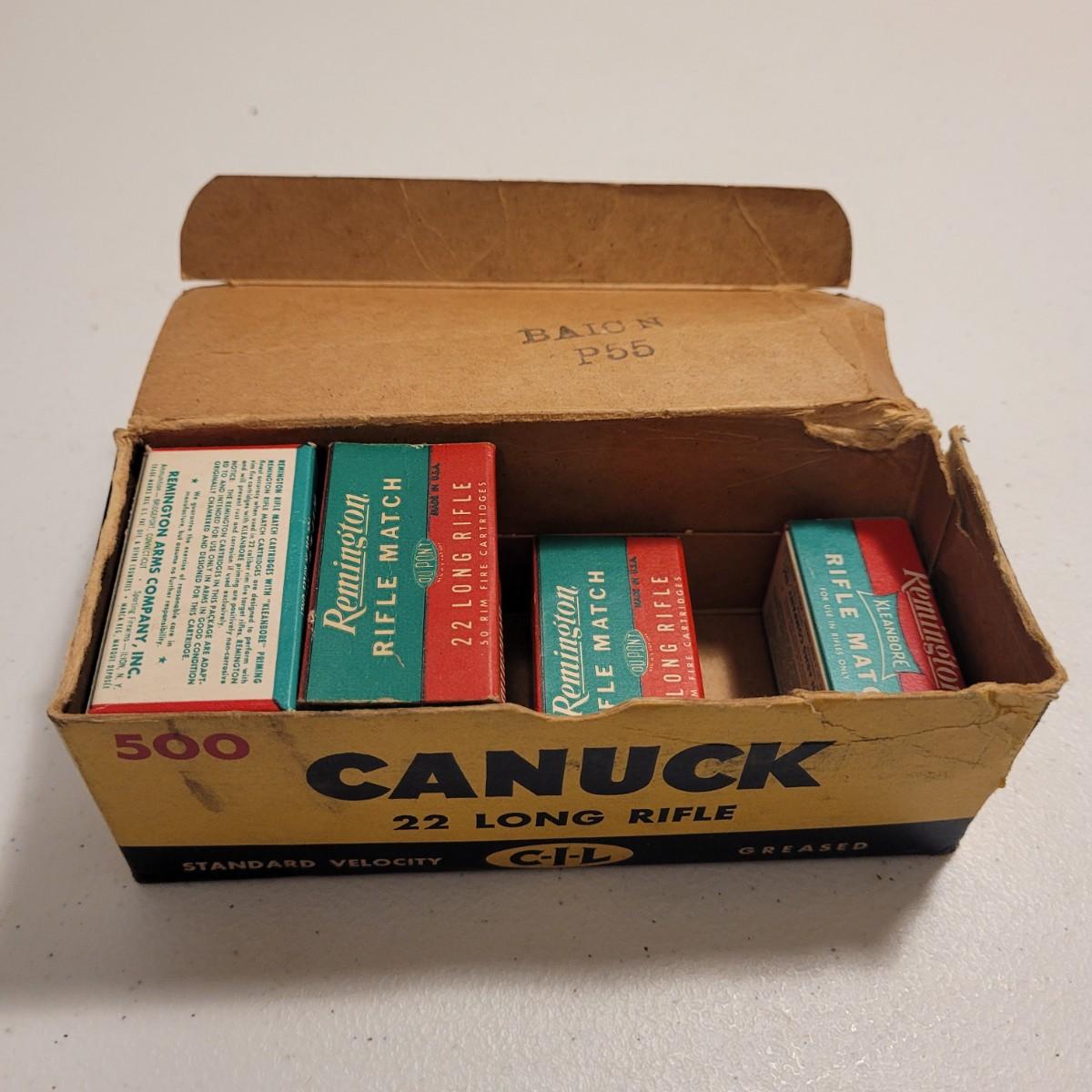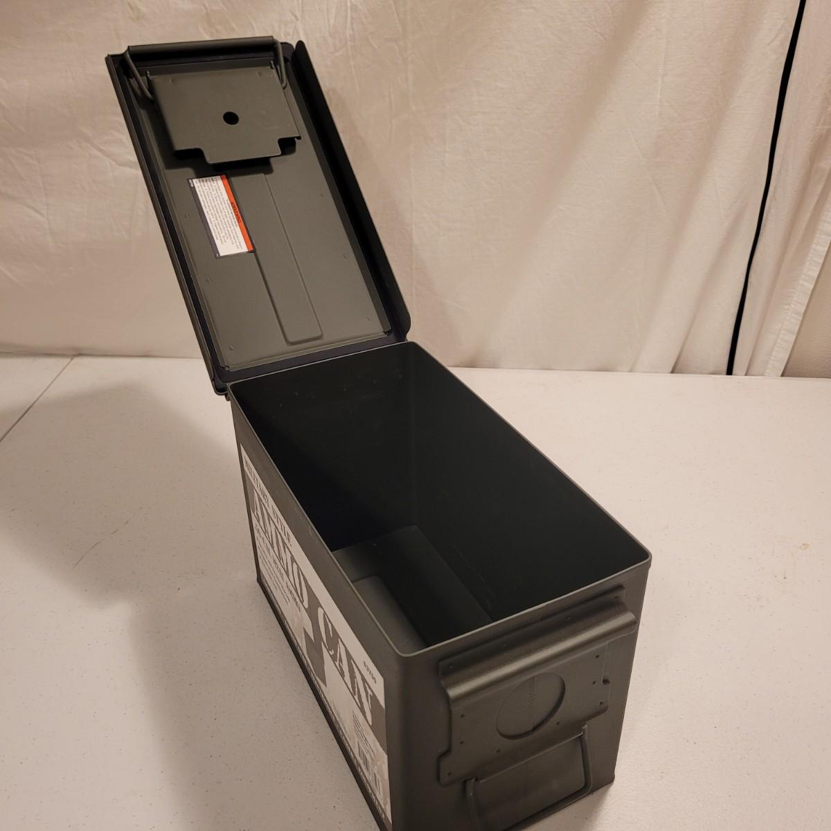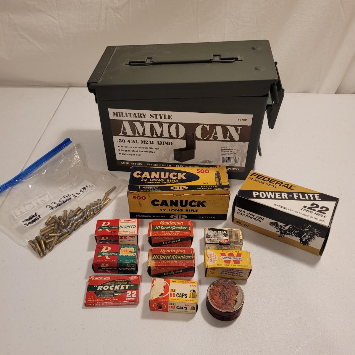 This lot includes over 800 .22 cartridges and one ammo box. There is a sealed box of Federal .22 LR cartridges, an open box of Canuck .22 LR rounds, and a few miscellaneous boxes and bags of .22 cartridges. This ammunition is dated and may need inspection before use. There is also a like new steel military style ammo can for ammunition storage.