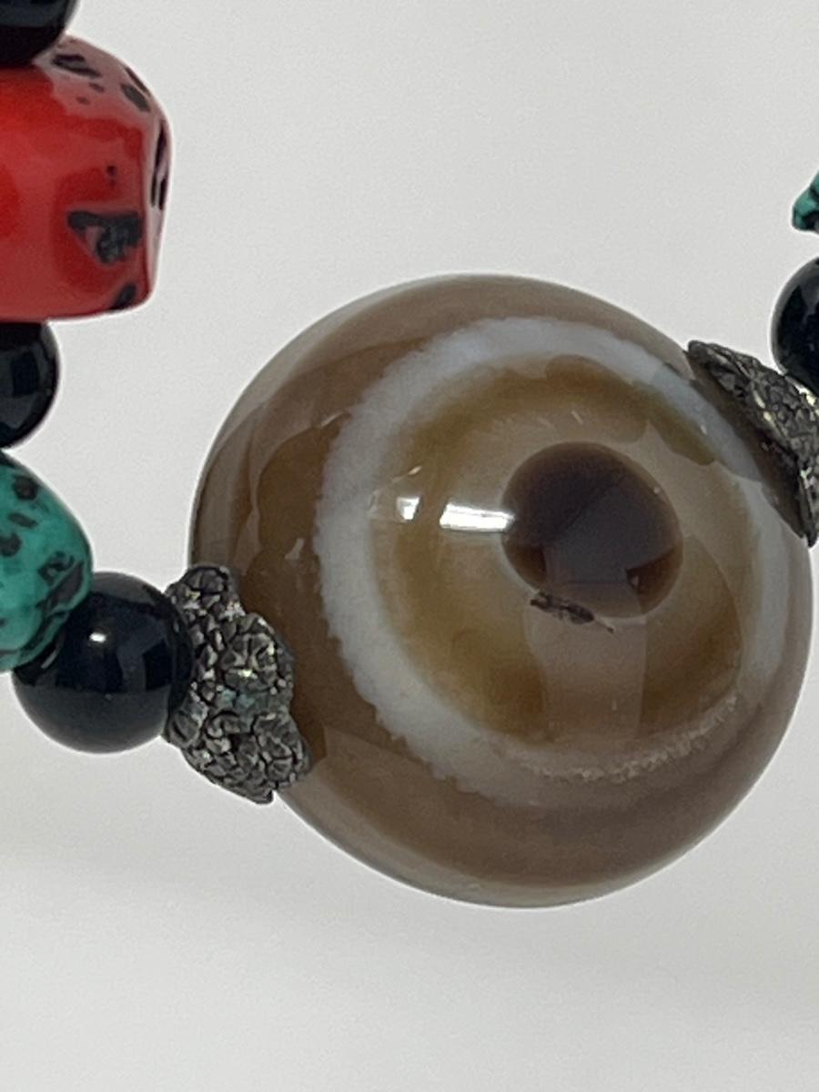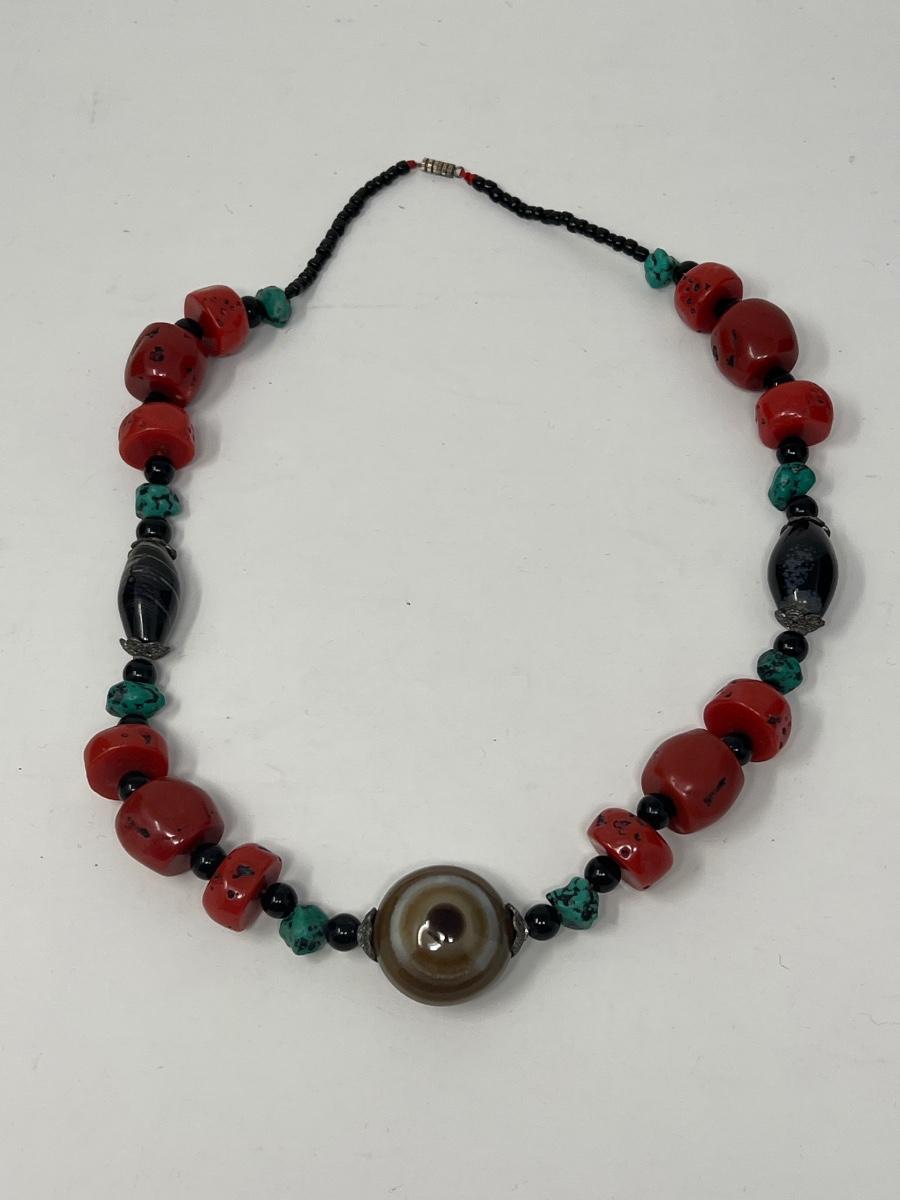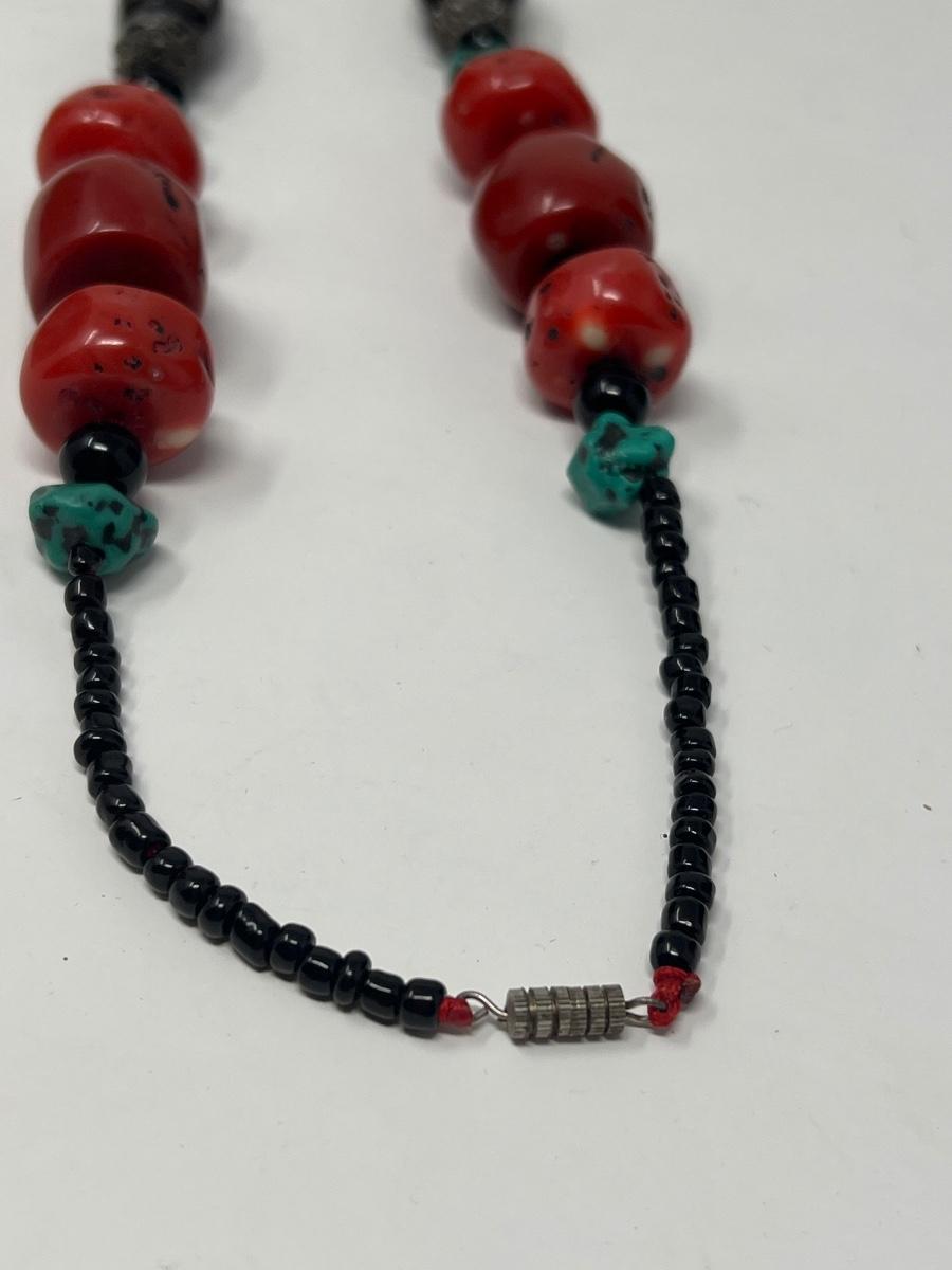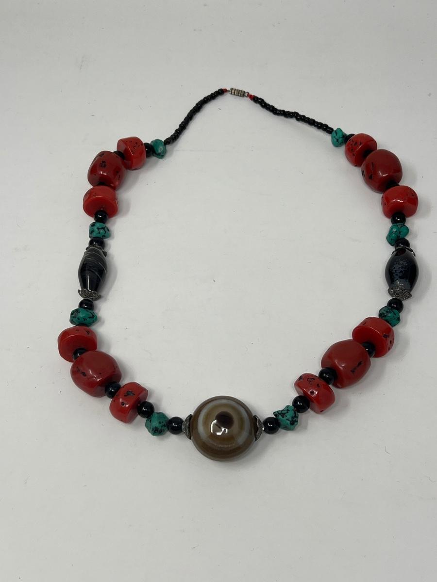 Exquisite beaded necklaces with genuine coral and turquoise stones and a center tiger eye. Vintage