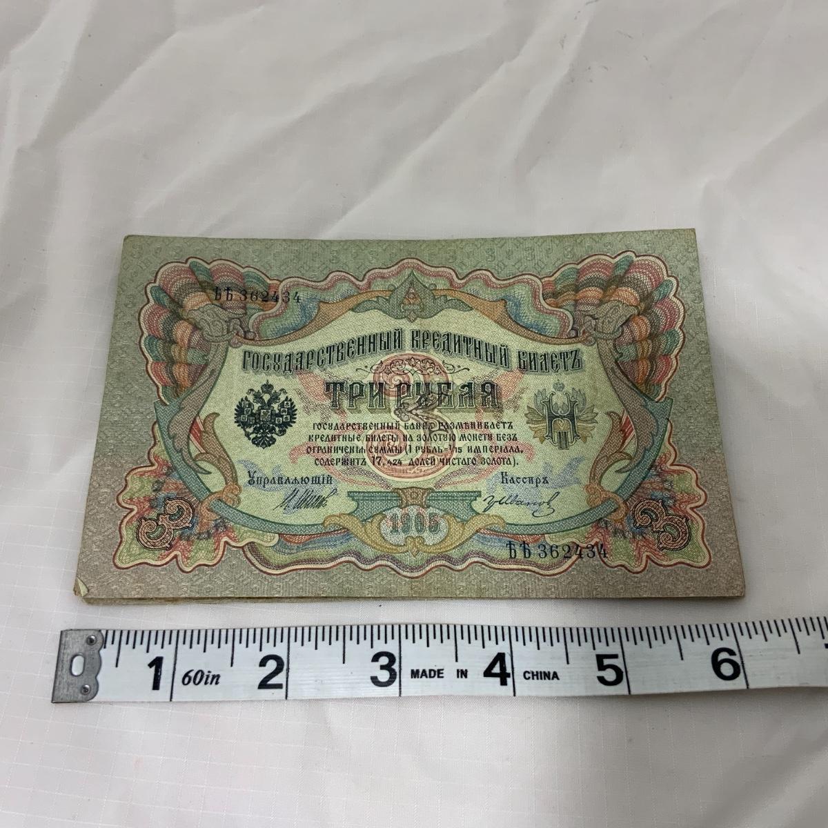 From the Estate of Peter Radovanovich: Nine Notes of Russian Currency dated 1905, all 3 Rubles. In various states of condition and circulation. Comes with Copy of Certificate of Authenticity. Please see photos for details and condition. ::: Shipping is available on this lot. If you require shipping you must let us know at the close of the auction. We will coordinate with you after the item has been won. Shipping fees will include insurance up to or exceeding the value of all items being mailed. If you have any questions regarding this lot please contact the auctioneer either via this website, by direct email or by phone. PICK UP TIMES and other important information can be found in the TERMS and DESCRIPTION of the auction. Please take a look for pertinent information. Thanks!