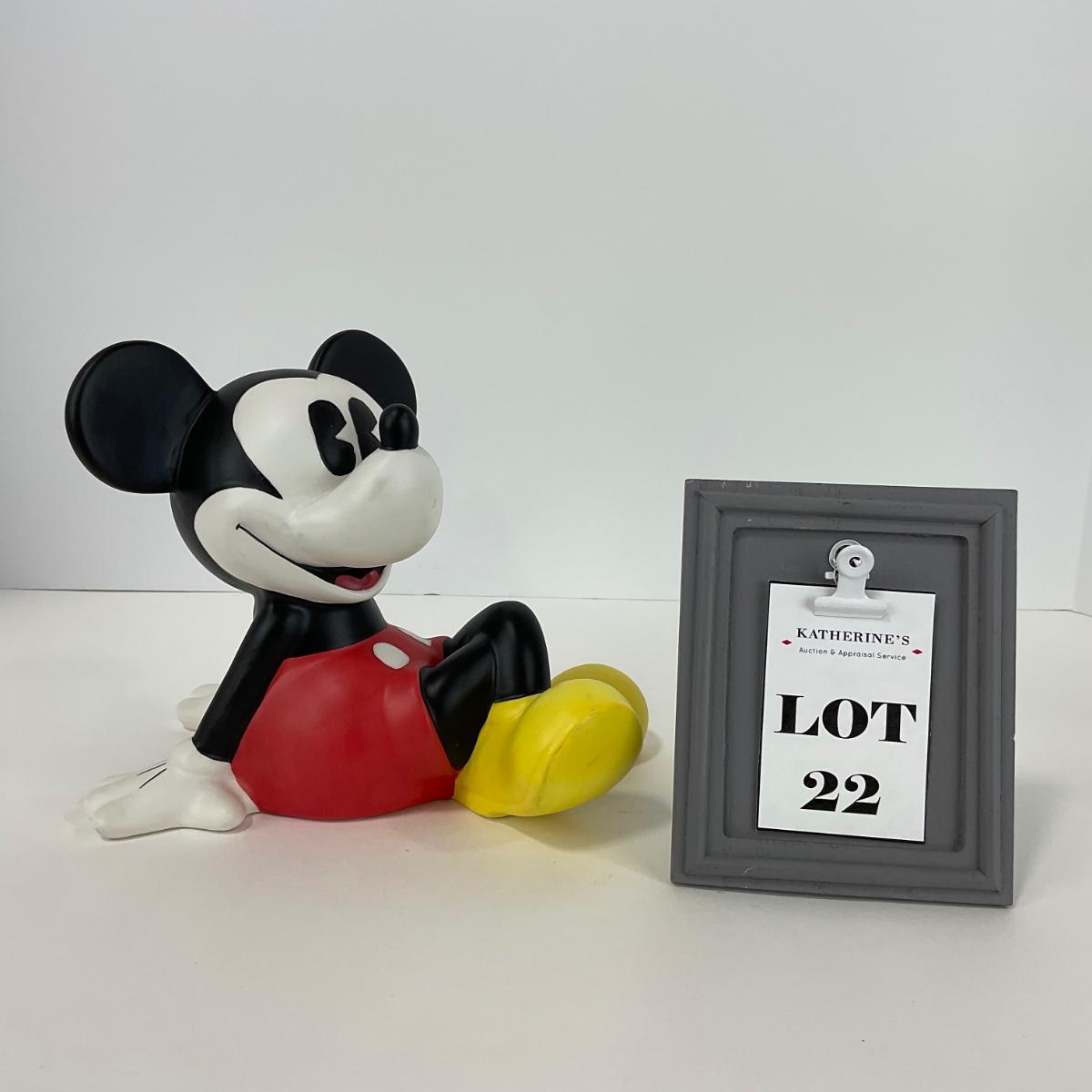 One Enesco Disney Mickey Mouse ceramic coin bank. Appears to be in good shape. Please see photos for details and condition. Any condition statement is given as a courtesy to a client, is an opinion, and should not be treated as a statement of fact. Reference to condition written, oral or within a condition report shall not be regarded as a full account of condition and may not include all defects, alterations, or restorations. Absence of a condition report does not imply a lot is flawless or lacking imperfections or damage. Katherine’s Auction & Appraisal Service shall have no responsibility for any error or omission. Returns shall not be accepted on the basis of condition. ::: Shipping is available on this lot. If you require shipping you must let us know at the close of the auction. We will coordinate with you after the item has been won. Shipping fees will include insurance up to or exceeding the value of all items being mailed. If you have any questions regarding this lot please contact the auctioneer either via this website, by direct email or by phone. PICK UP TIMES and other important information can be found in the TERMS and DESCRIPTION of the auction. Please take a look for pertinent information. Thanks!