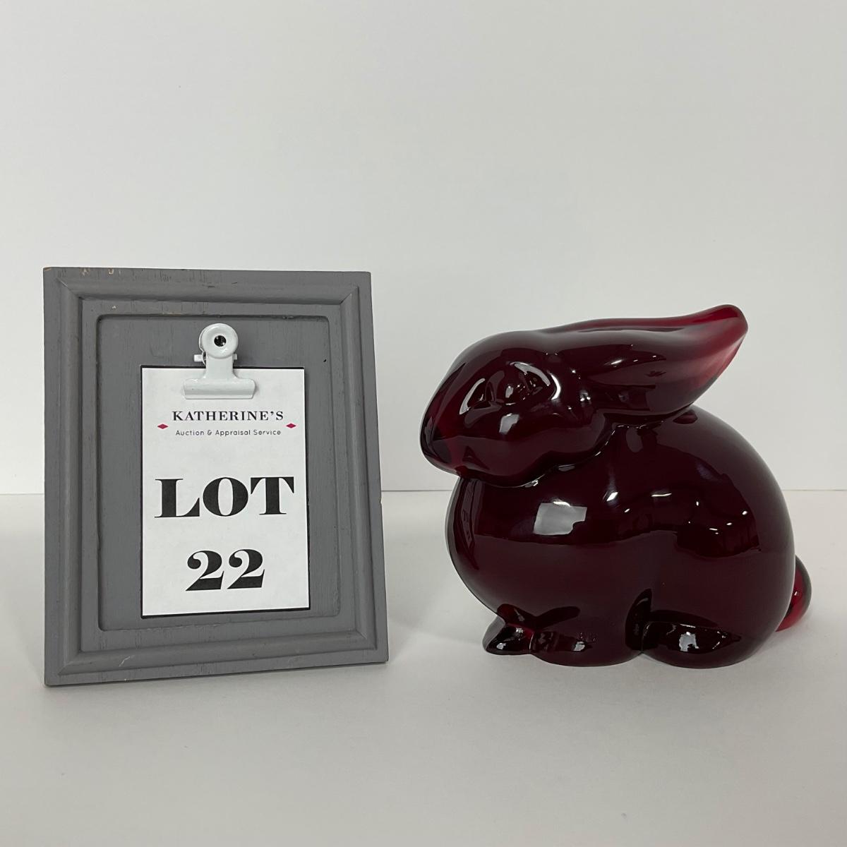 One Heisey by Dalzell Imperial ruby red mother rabbit marked. A few small chips at the bottom edge of this piece but in otherwise very good condition. 4 1/2 inches tall by 5 1/2 inches long. Please see photos for details and condition. Any condition statement is given as a courtesy to a client, is an opinion, and should not be treated as a statement of fact. Reference to condition written, oral or within a condition report shall not be regarded as a full account of condition and may not include all defects, alterations, or restorations. Absence of a condition report does not imply a lot is flawless or lacking imperfections or damage. Katherine’s Auction & Appraisal Service shall have no responsibility for any error or omission. Returns shall not be accepted on the basis of condition. ::: Shipping is available on this lot. If you require shipping you must let us know at the close of the auction. We will coordinate with you after the item has been won. Shipping fees will include insurance up to or exceeding the value of all items being mailed. If you have any questions regarding this lot please contact the auctioneer either via this website, by direct email or by phone. PICK UP TIMES and other important information can be found in the TERMS and DESCRIPTION of the auction. Please take a look for pertinent information. Thanks!