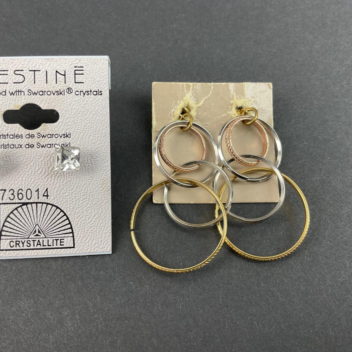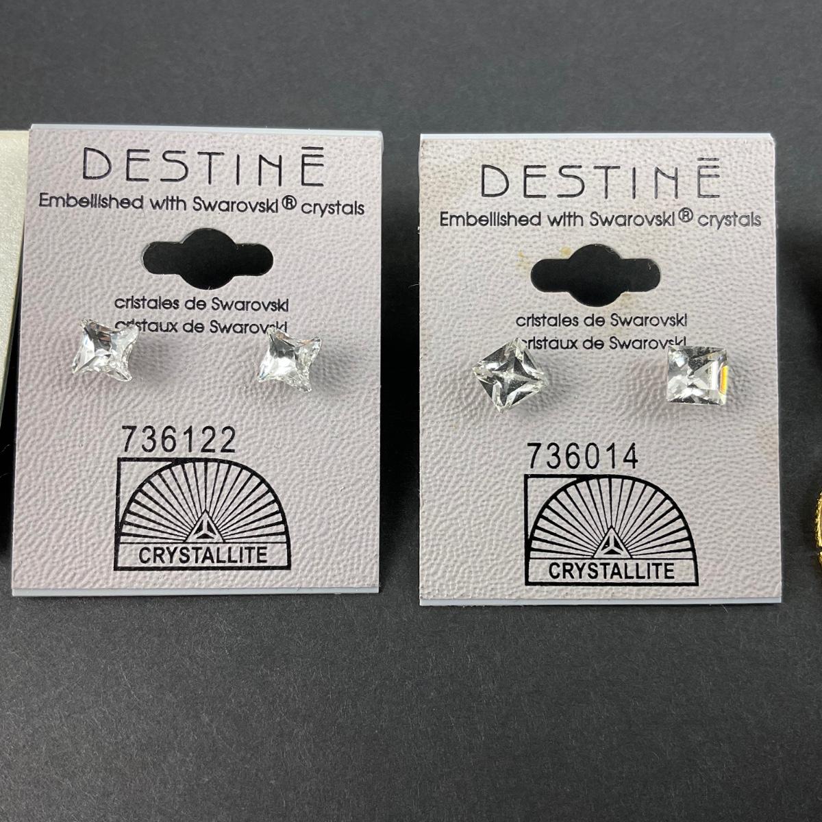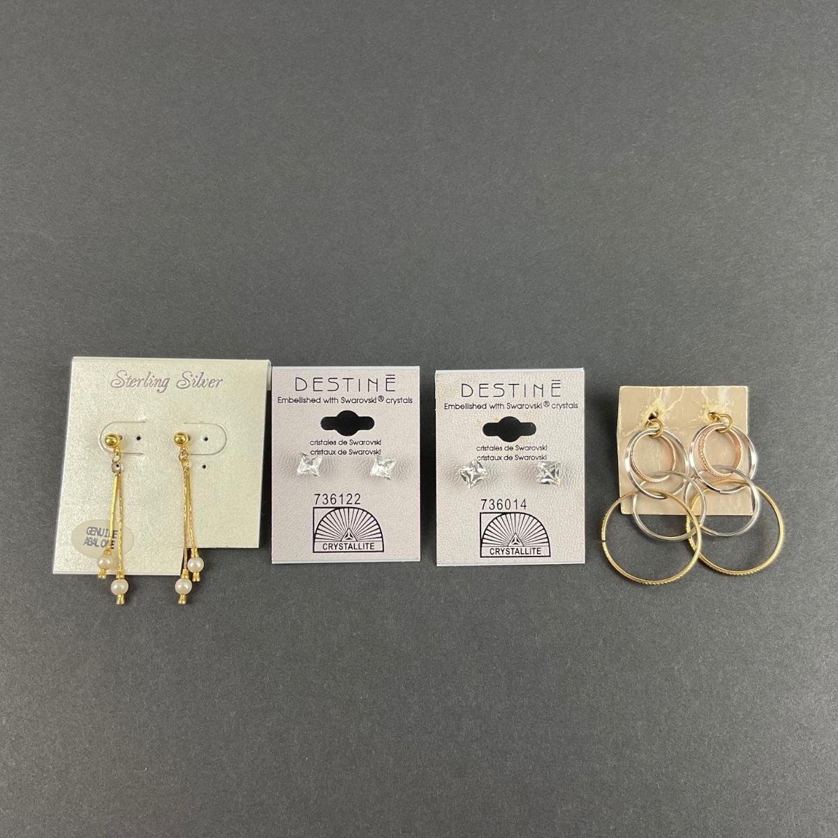 four pair of like new earrings on there cards. Two Swarovski crystal earrings. Please see photos for details and condition. Any condition statement is given as a courtesy to a client, is an opinion, and should not be treated as a statement of fact. Reference to condition written, oral or within a condition report shall not be regarded as a full account of condition and may not include all defects, alterations, or restorations. Absence of a condition report does not imply a lot is flawless or lacking imperfections or damage. Katherine’s Auction & Appraisal Service shall have no responsibility for any error or omission. Returns shall not be accepted on the basis of condition. ::: Shipping is available on this lot. If you require shipping you must let us know at the close of the auction. We will coordinate with you after the item has been won. Shipping fees will include insurance up to or exceeding the value of all items being mailed. If you have any questions regarding this lot please contact the auctioneer either via this website, by direct email or by phone. PICK UP TIMES and other important information can be found in the TERMS and DESCRIPTION of the auction. Please take a look for pertinent information. Thanks!