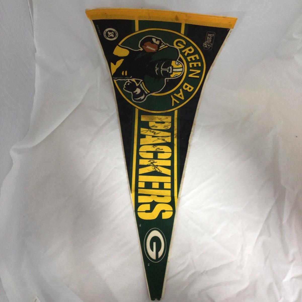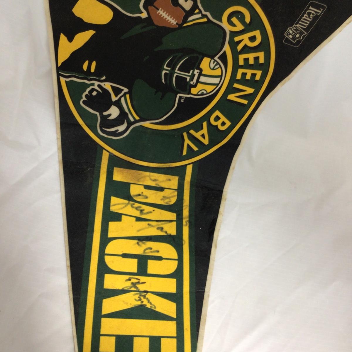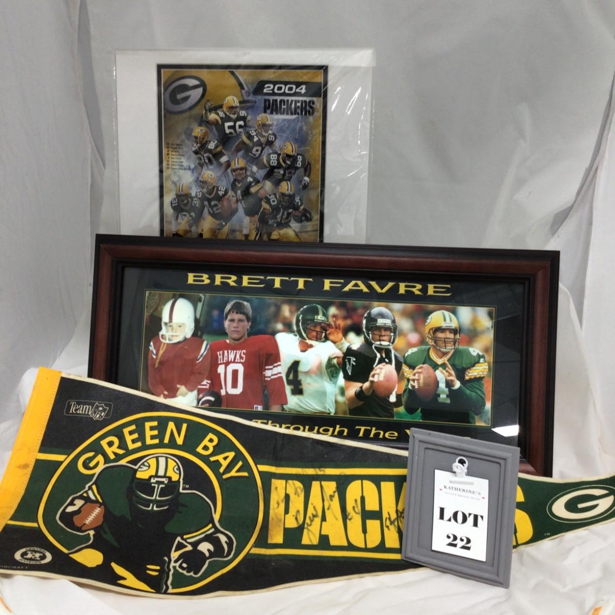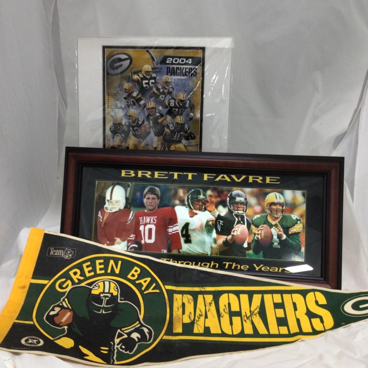 Signed Pennant with no certificate of authenticity, it is assumed authentic but not guaranteed. Pennant is in rough shape, 27 inches long. Framed Brett Farve thought the years, 10 inches by 20.5 inches. Matted 2004 Packers photograph 12 inches by 16 inches.