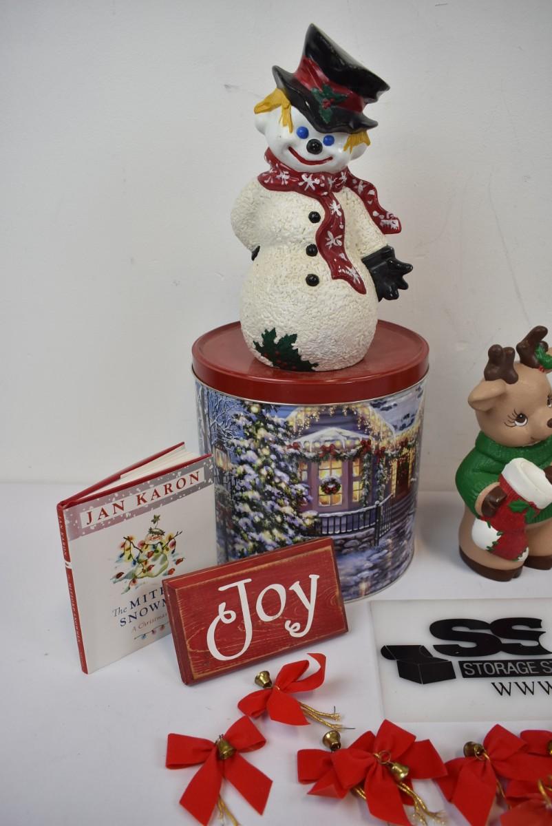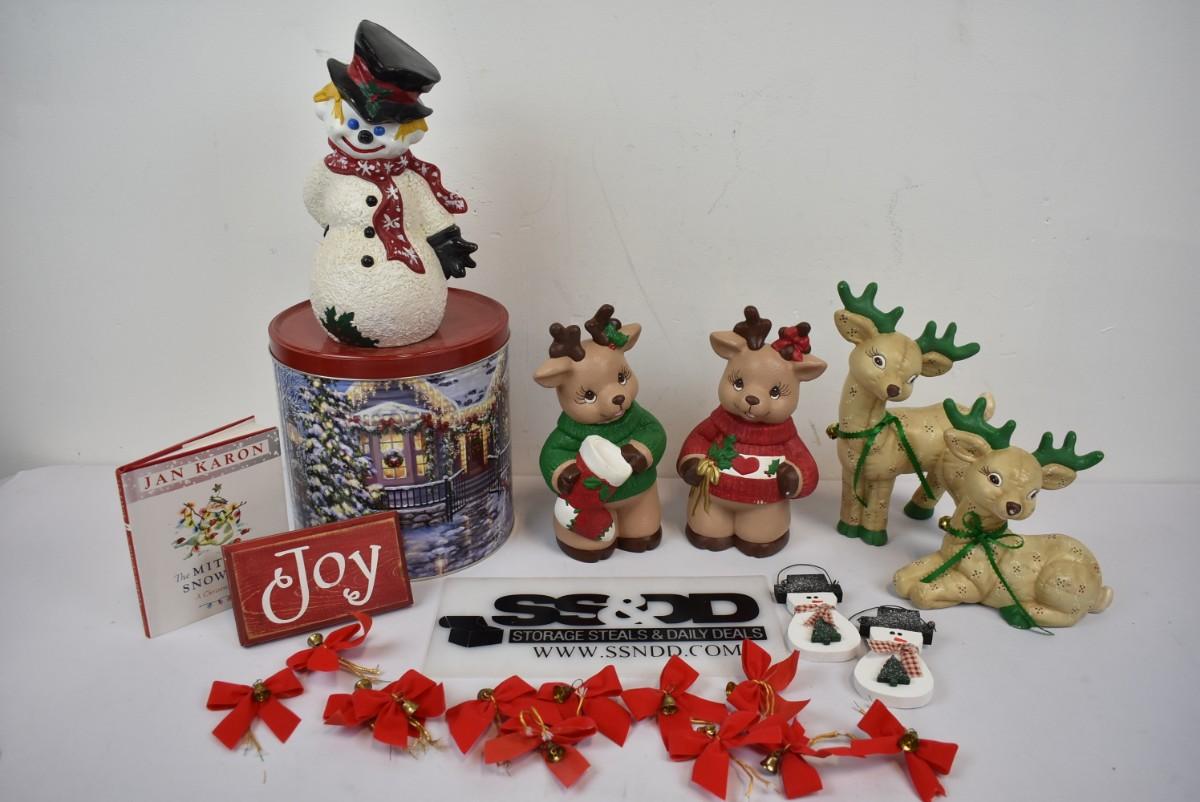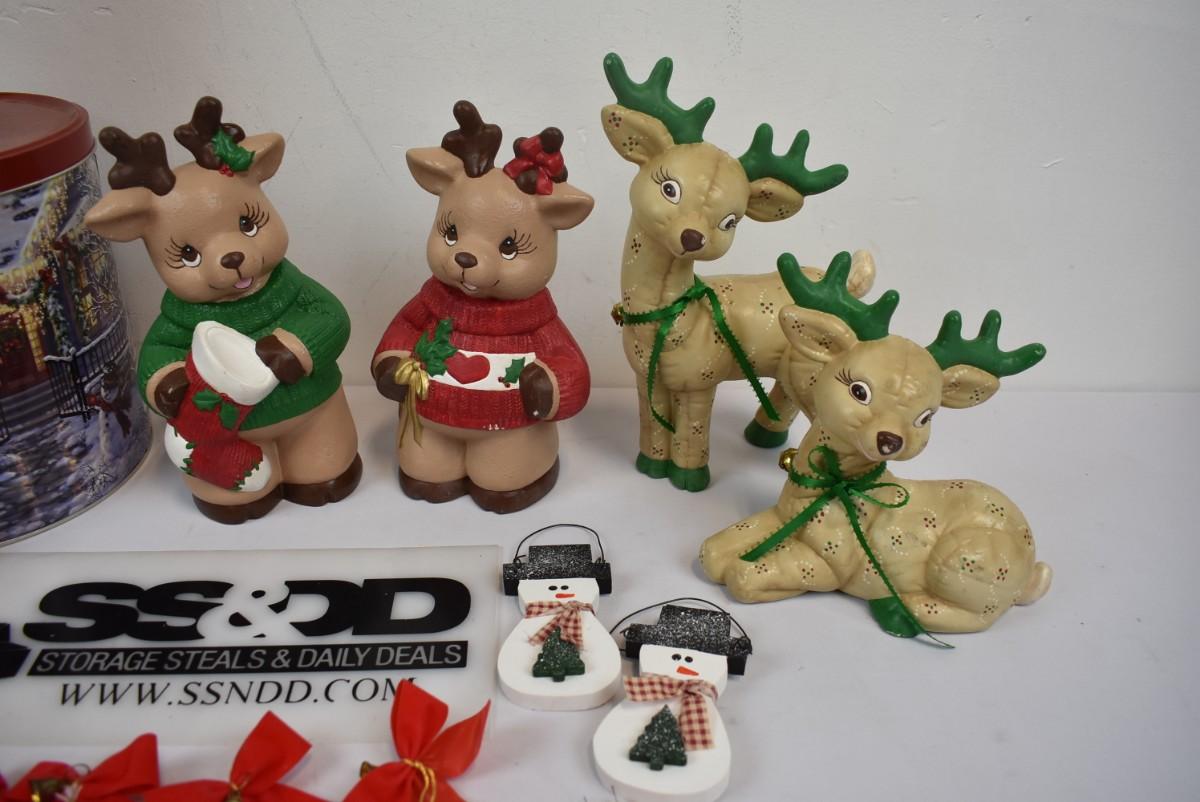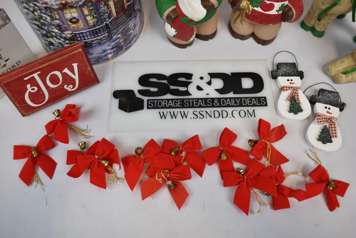 22 pc Holiday Decor: 1 Tin, 5 Painted Figures, 1 book, 1 sign, 2 ornaments, 12 bows w/ bells
