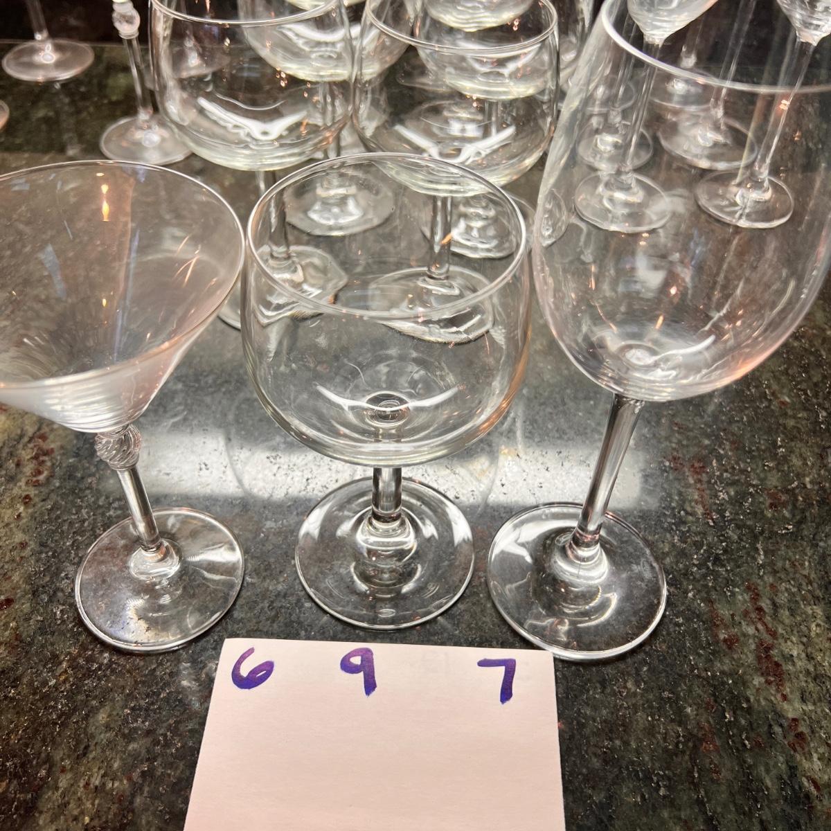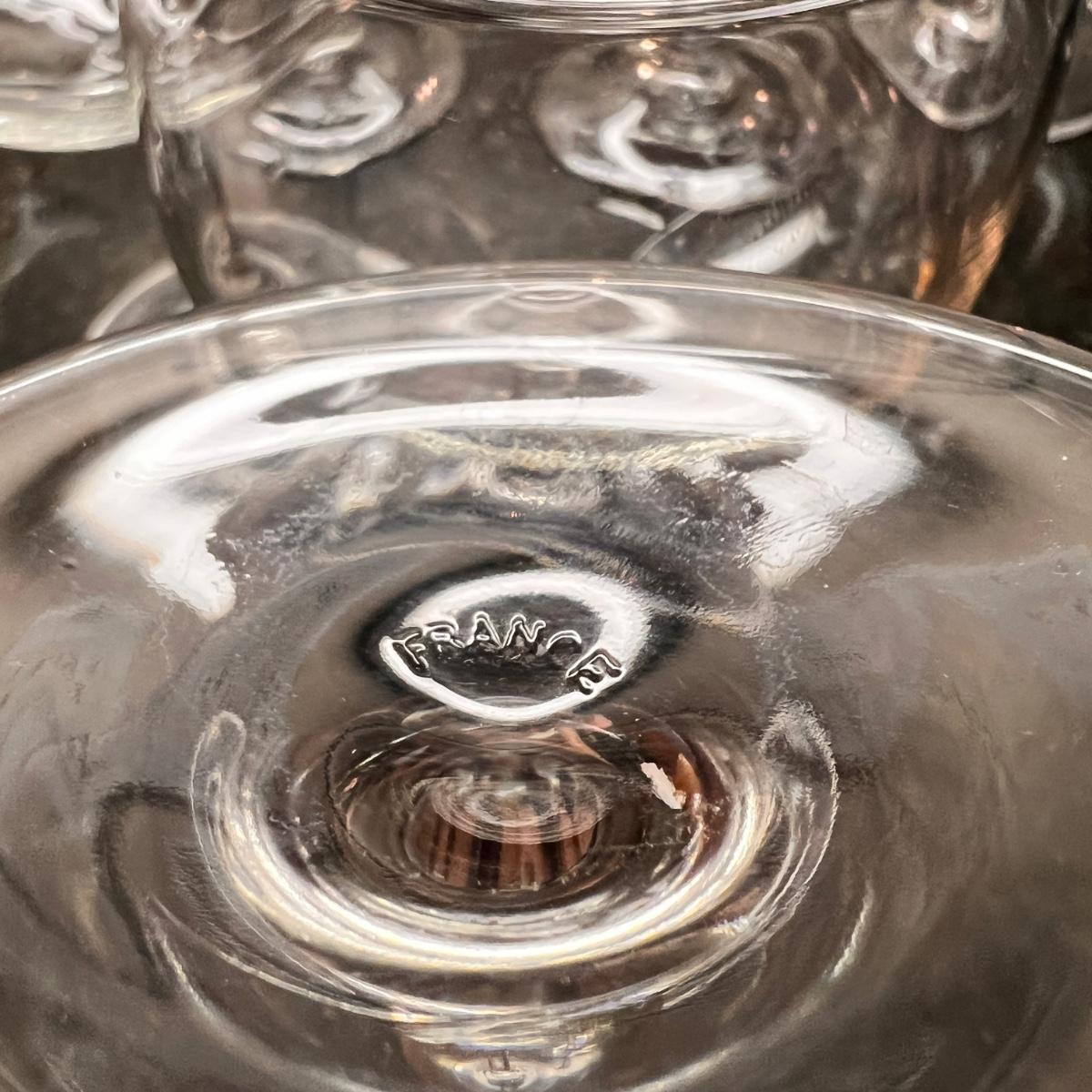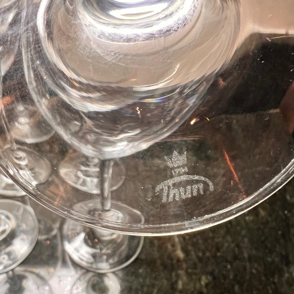 6 martini glasses, 9 wine glasses stamped France and 7 Thun wine glasses. Very good quality stemware.