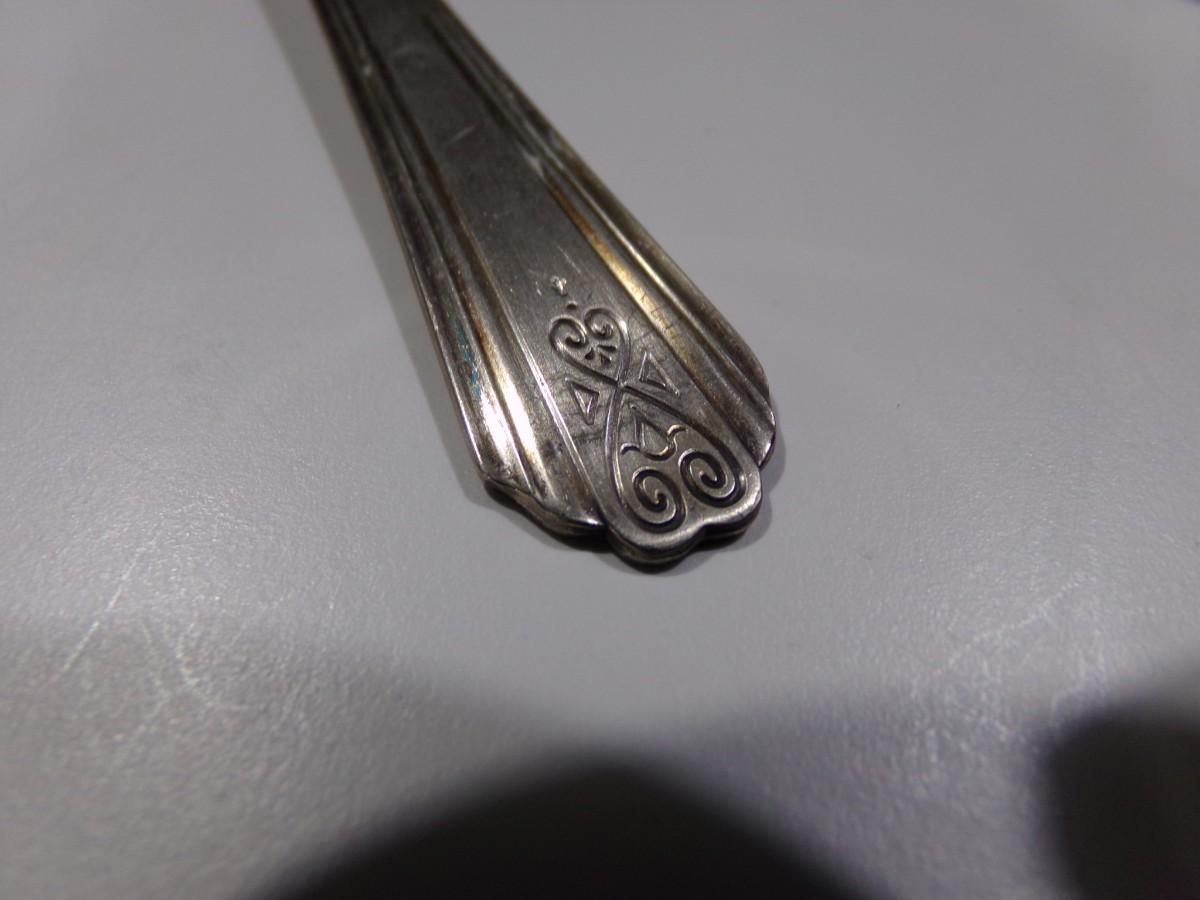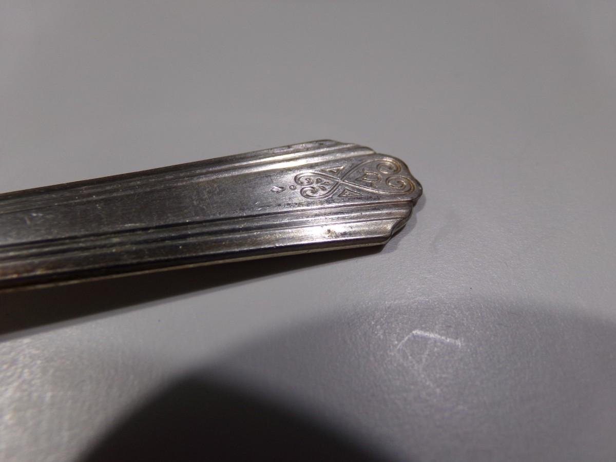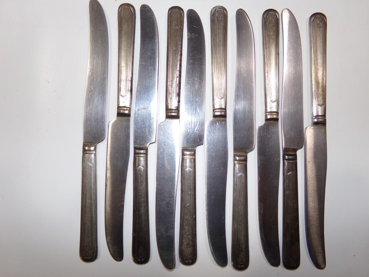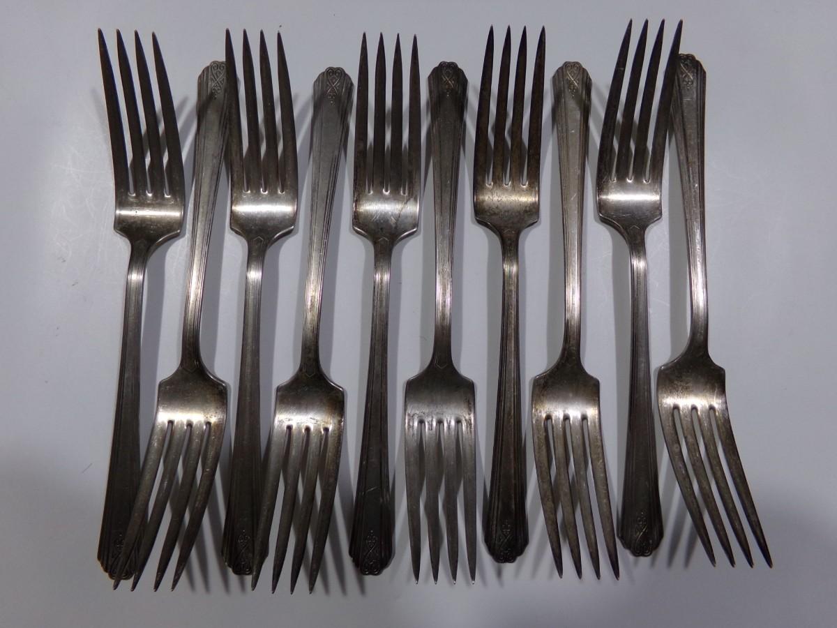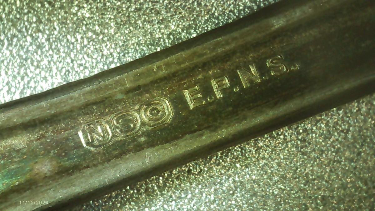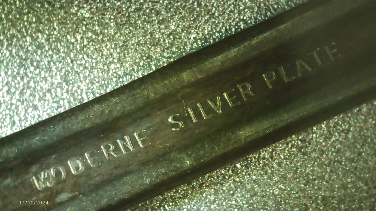 lot of 22 pcs. all same pattern, 10 forks, 6 marked Moderne Silver Plate and 4 marked NSCo E.P.N.S., Not typical silver plate but shows tarnish?? Unusual, magnetic, 2 newer style tea spoons, labeled NSCo E.P.N.S. Same pattern as the forks.10 dinner knives, not labeled but same pattern as the forks & spoons. Some knife handles are in very bad shape
