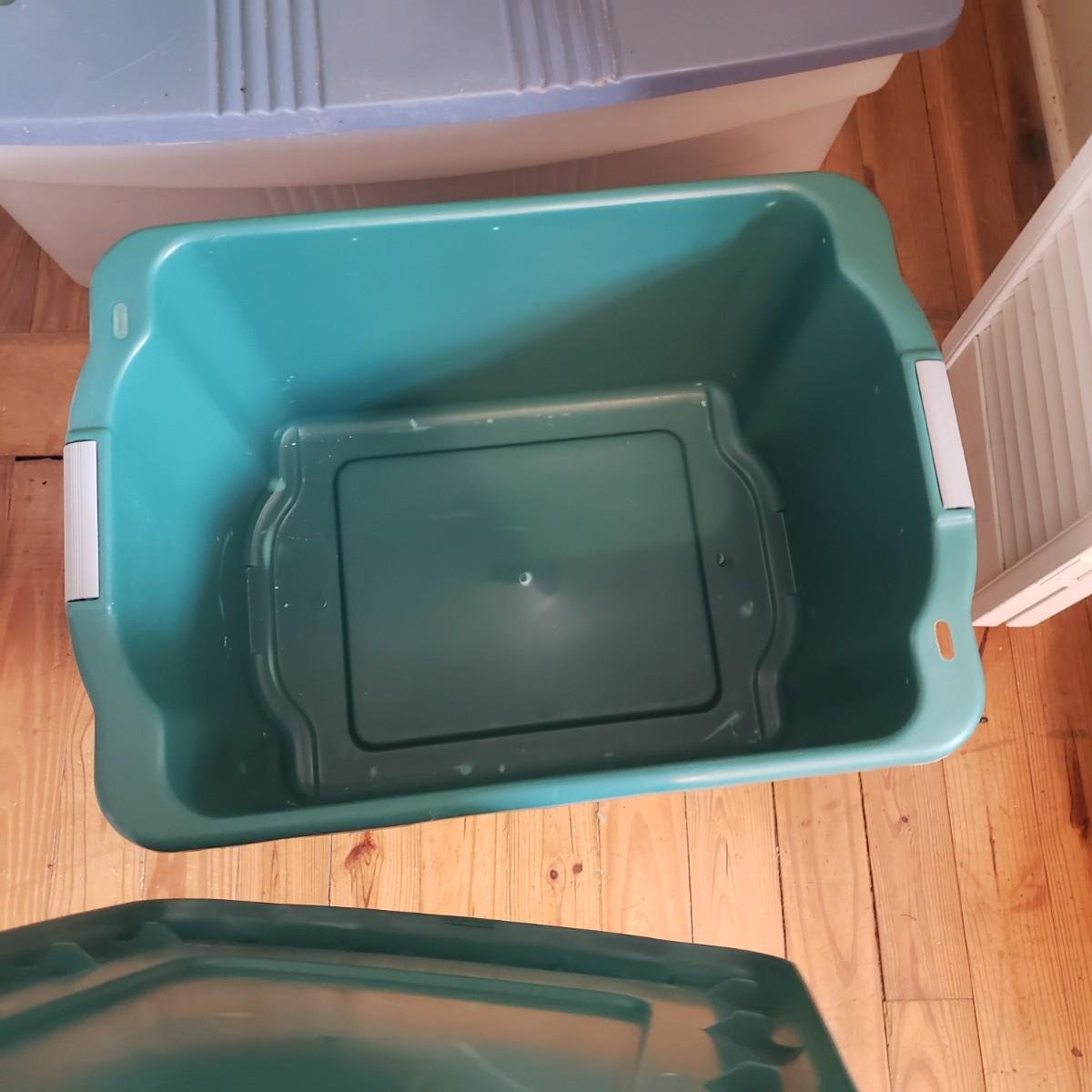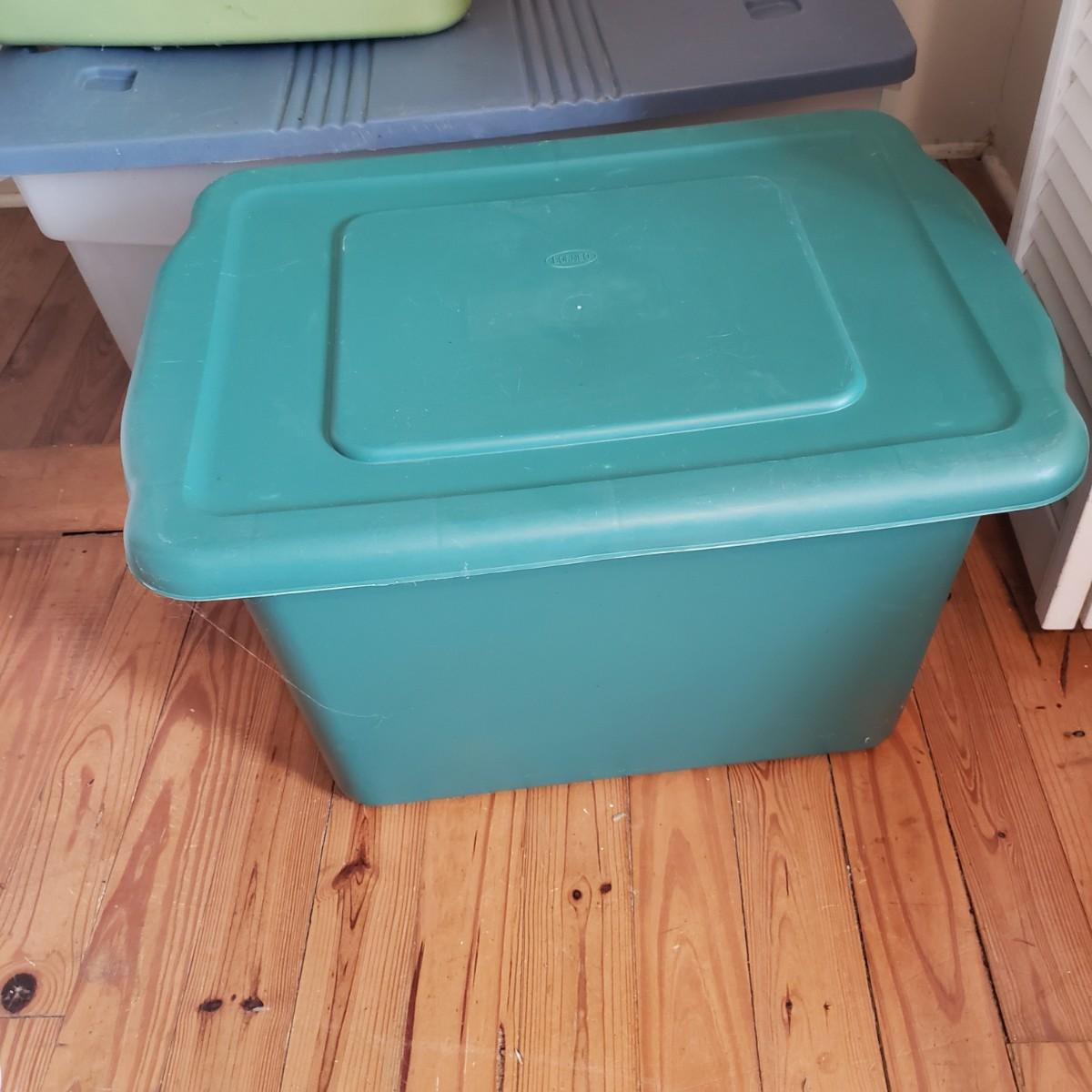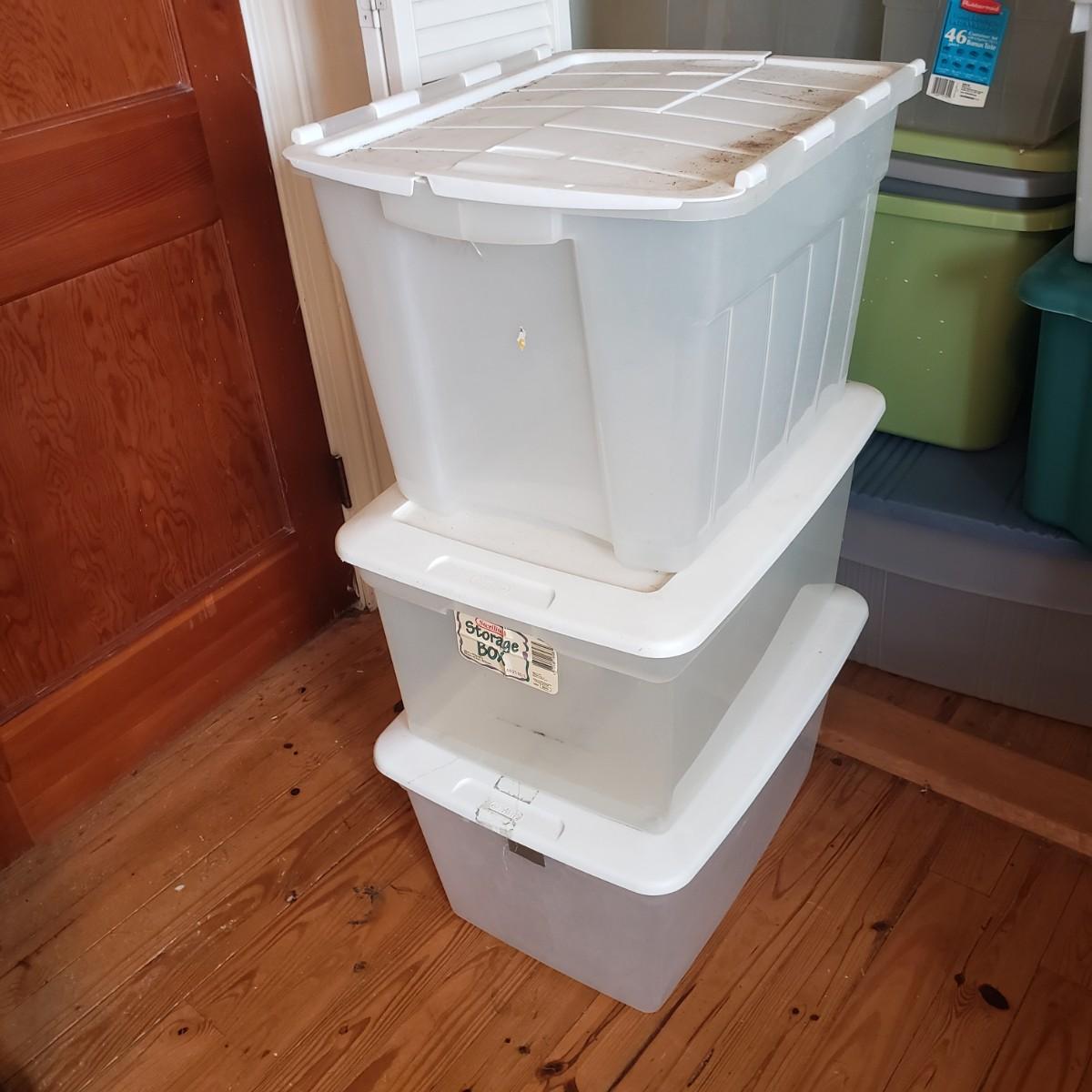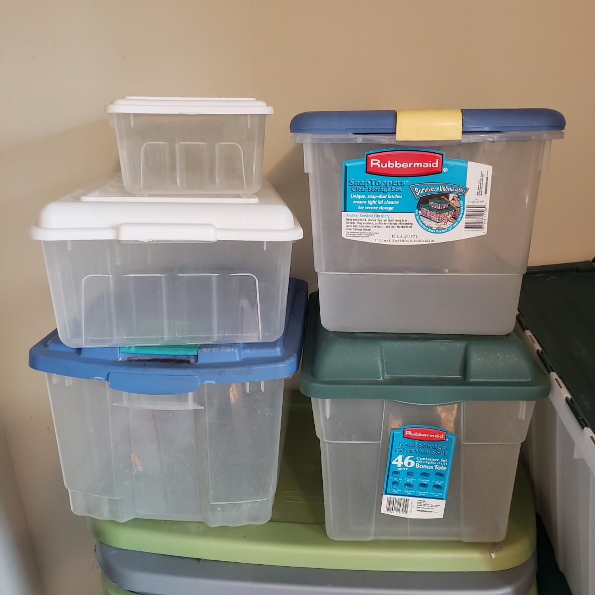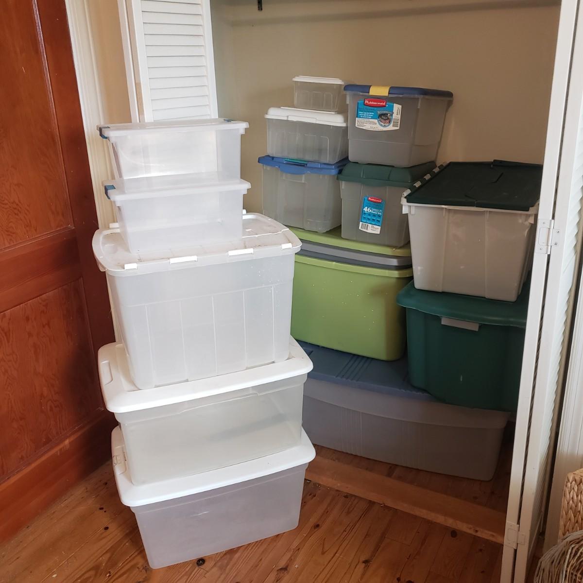 This plastic bin lot has every size you need! The seven small blue lidded Sterlite bins did not make the group shot, but are included! See pictures for sizes and condition. Bins appear to be blemish free, only one bin with the fold together lid was bent, but still shut all the way. The bins could use a washing, as some are dirty.