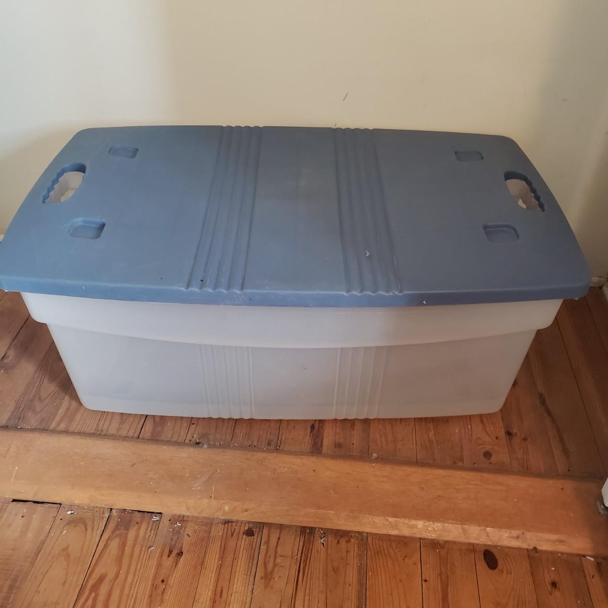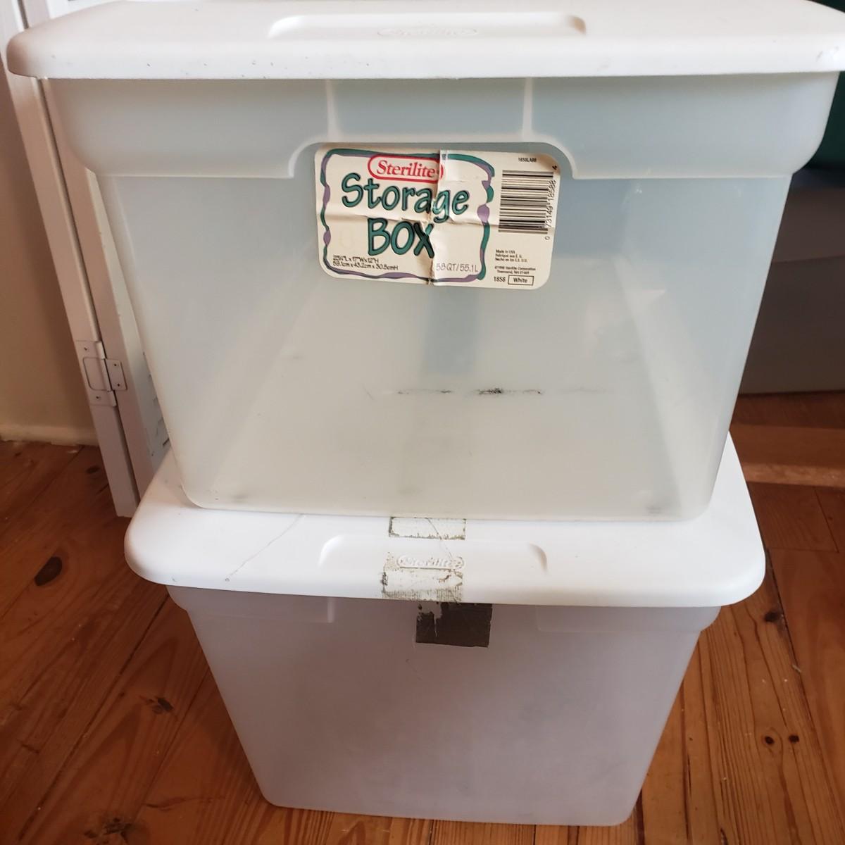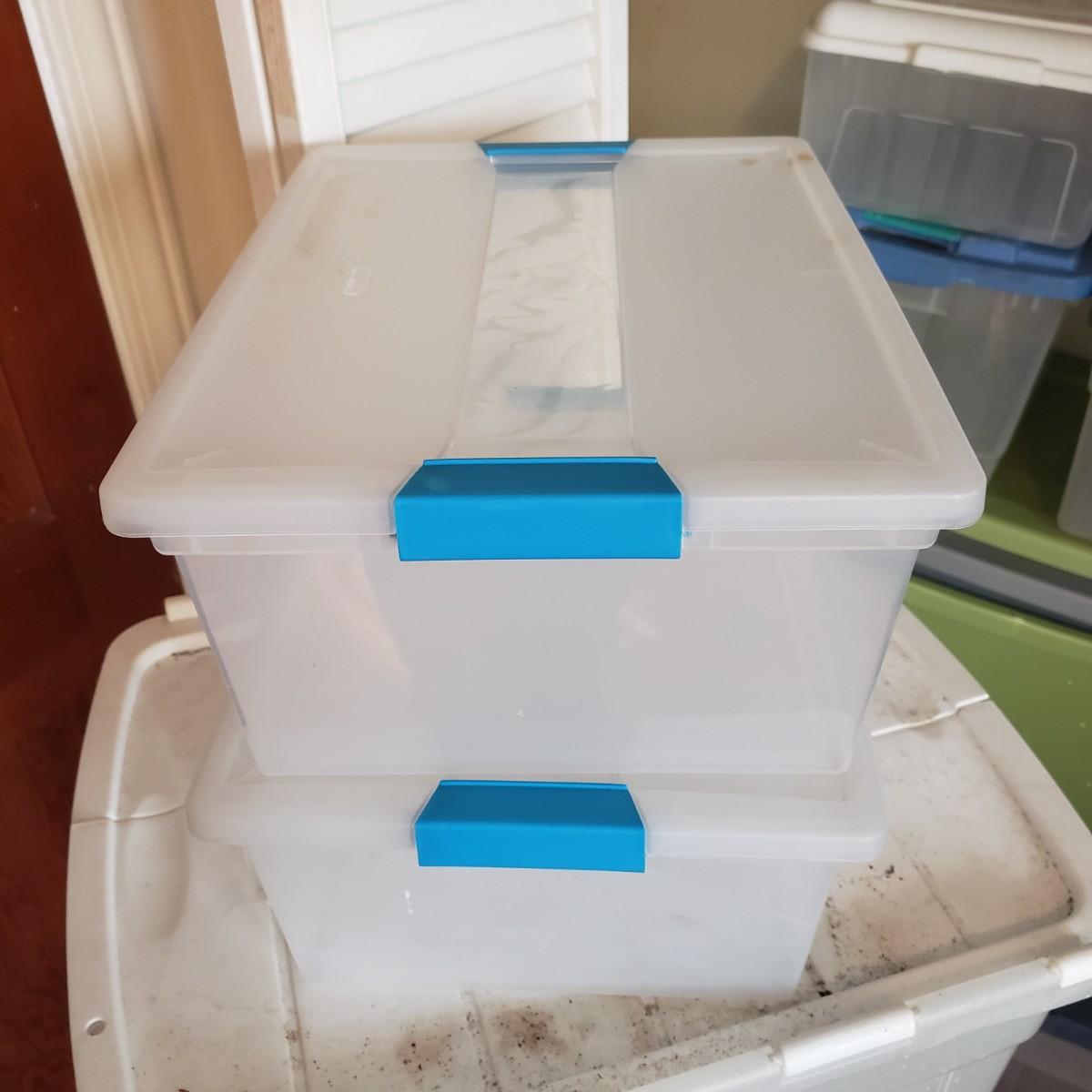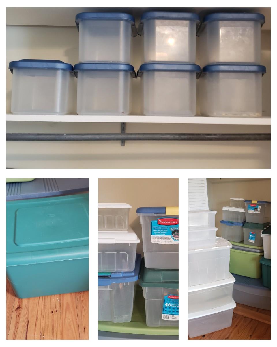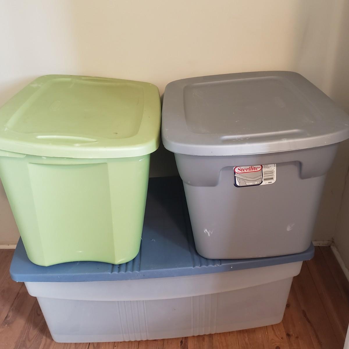 This plastic bin lot has every size you need! The seven small blue lidded Sterlite bins did not make the group shot, but are included! See pictures for sizes and condition. Bins appear to be blemish free, only one bin with the fold together lid was bent, but still shut all the way. The bins could use a washing, as some are dirty.