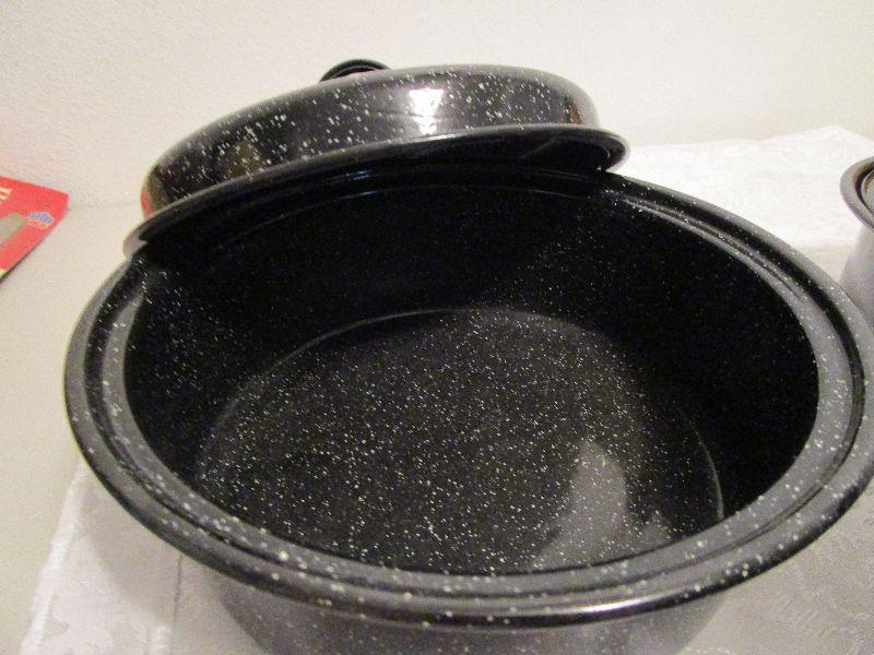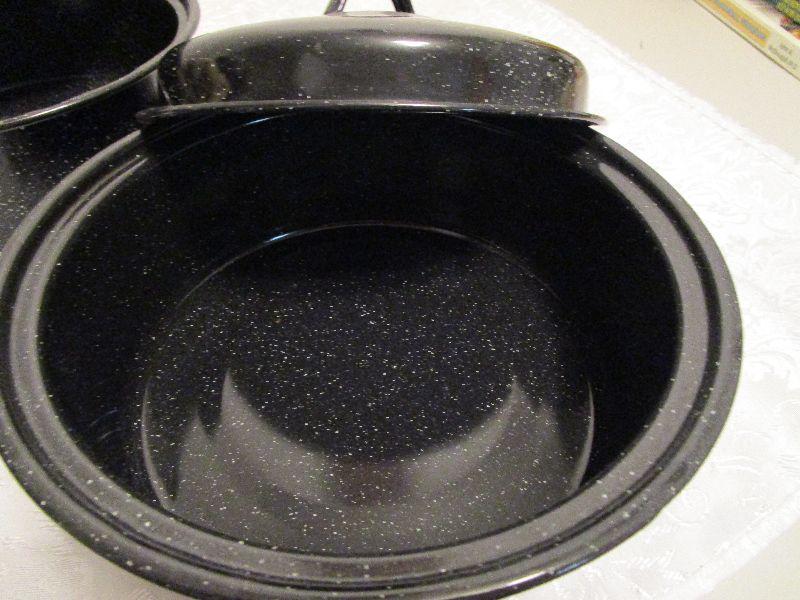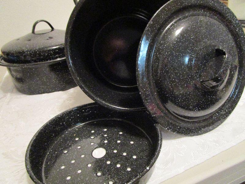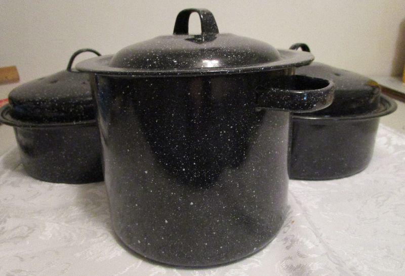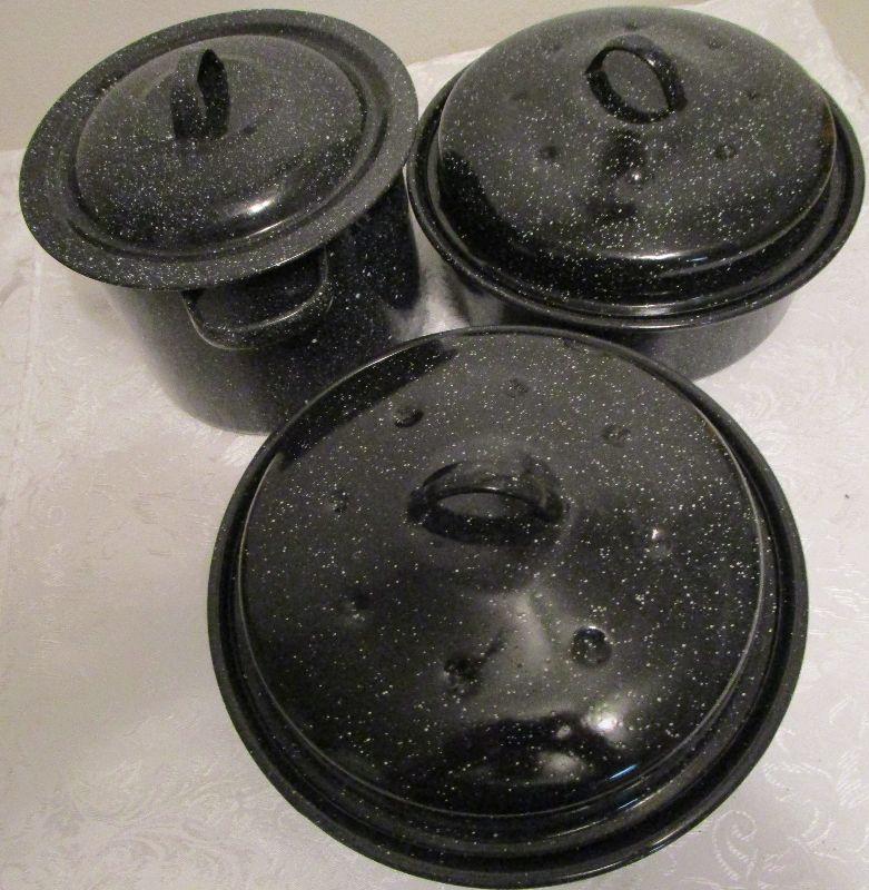 Black speckled 2- 8.5 around 3" deep, 1- 7" around 6" deep with steamer accessory