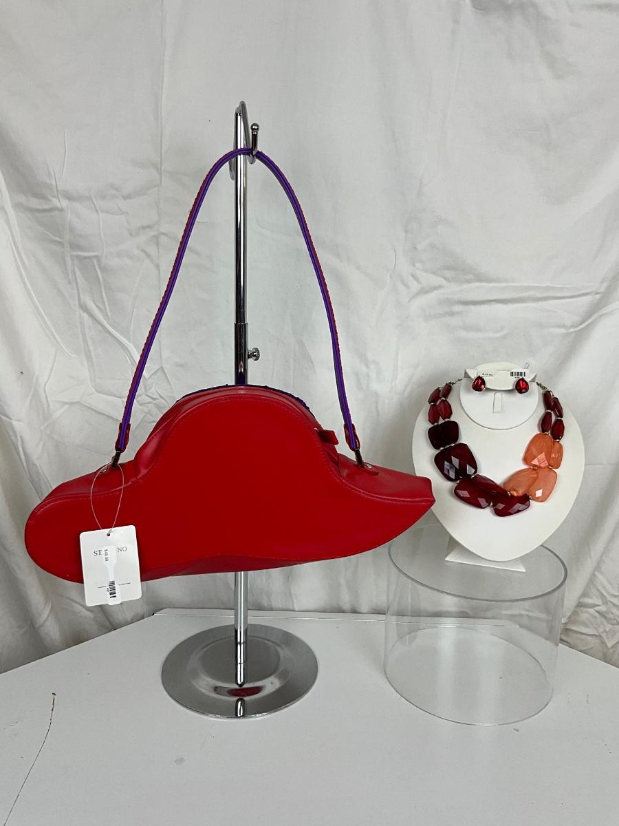 220 Red Hat Lady Handbag with Red/Pink Stone Necklace and Earring Set