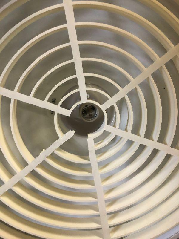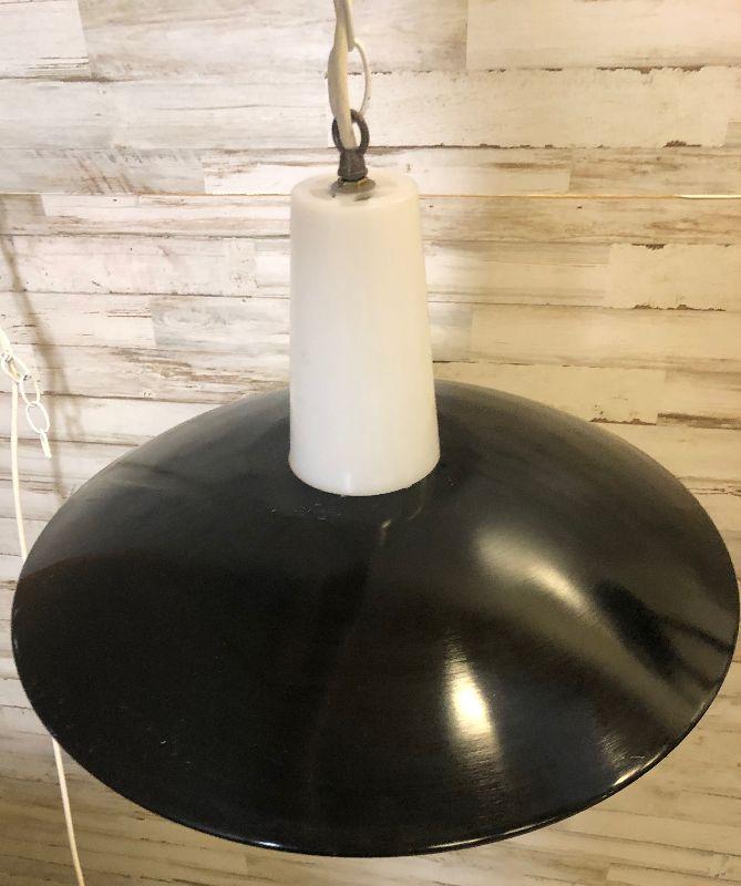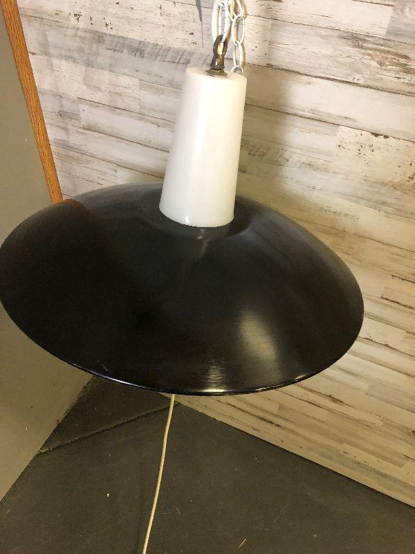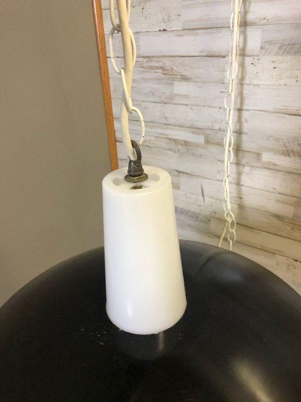 Hight with cone 10" Black Shade Diameter 18" MDM 1 Has broken pieces BUT We have all the parts Black Metal and white Plastic Chain and cord included