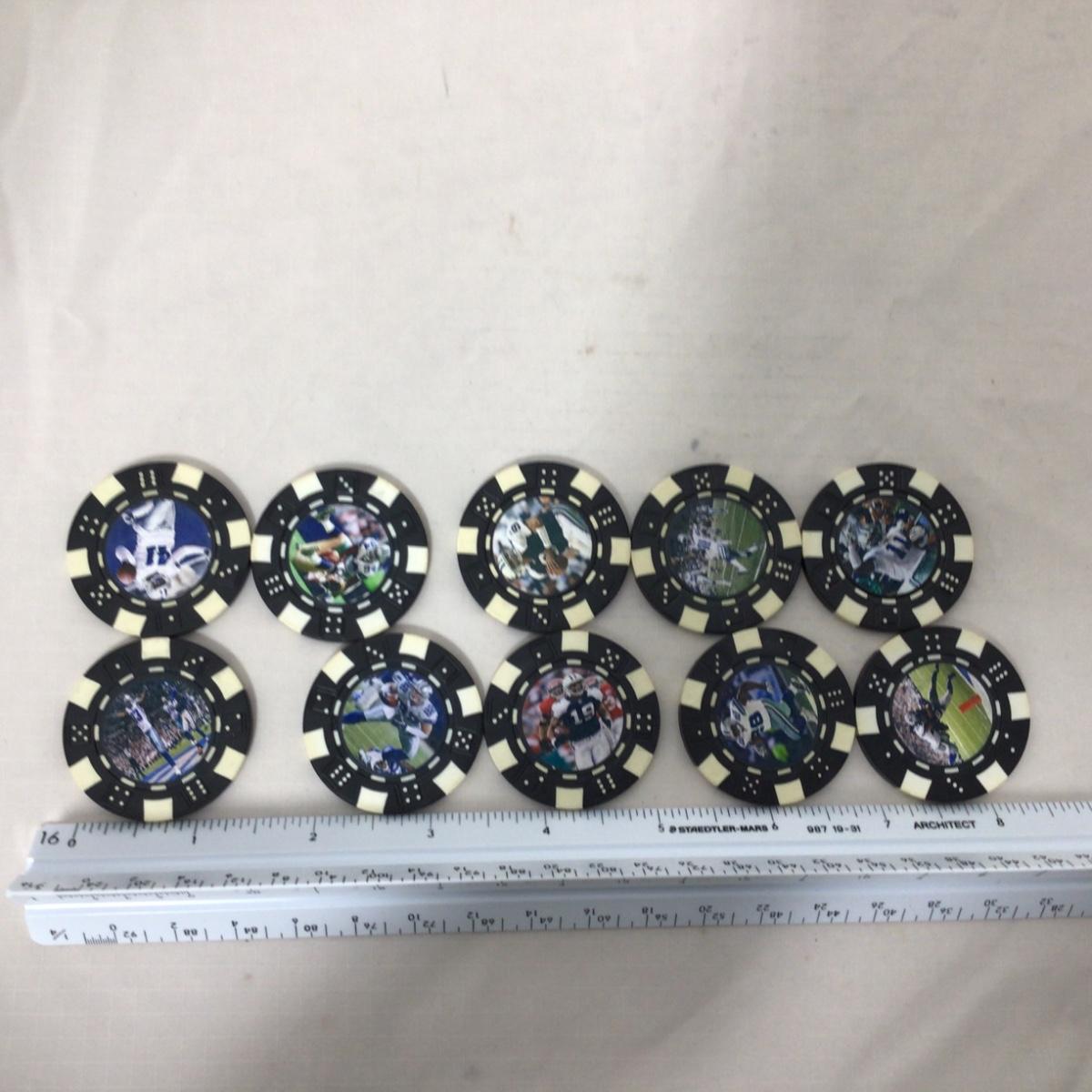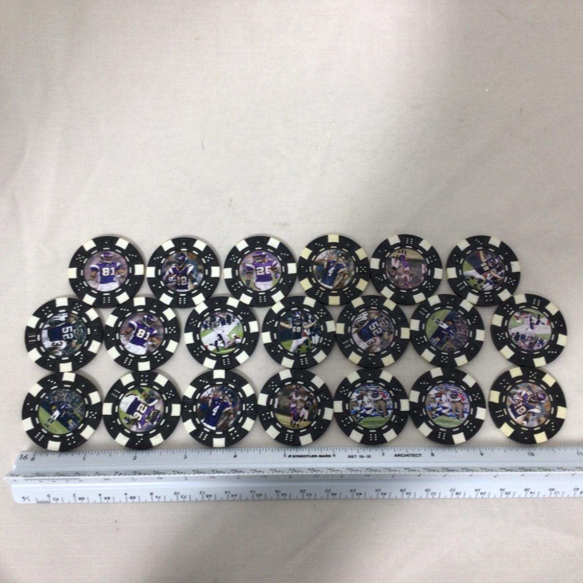 40 total poker chips. 10 Packers, 10 Cowboys, and 20 Vikings chips. Please see photos for details and condition. ::: Shipping is available on this lot. If you require shipping you must let us know at the close of the auction. We will coordinate with you after the item has been won. Shipping fees will include insurance up to or exceeding the value of all items being mailed. If you have any questions regarding this lot please contact the auctioneer either via this website, by direct email or by phone. PICK UP TIMES and other important information can be found in the TERMS and DESCRIPTION of the auction. Please take a look for pertinent information. Thanks!