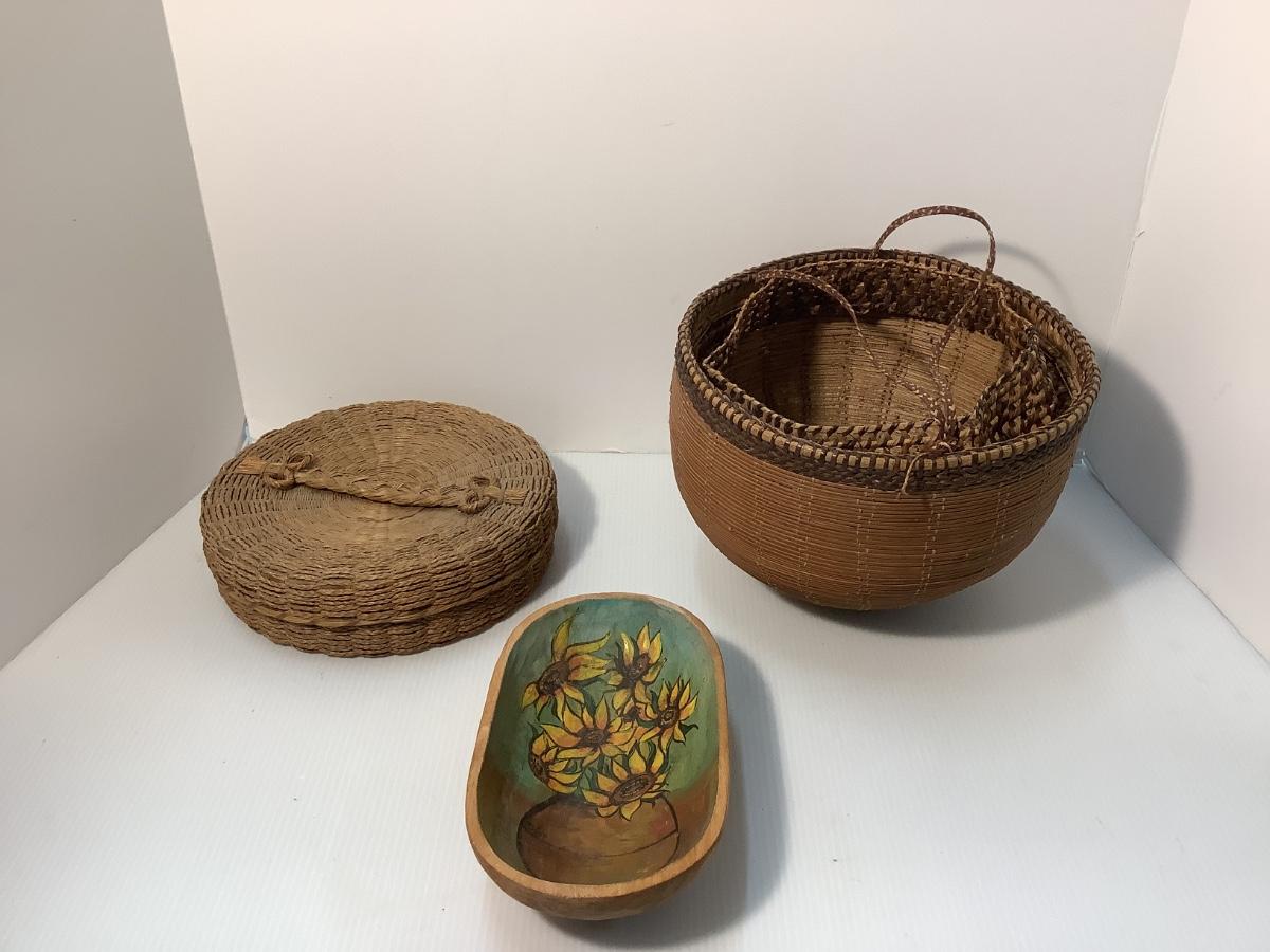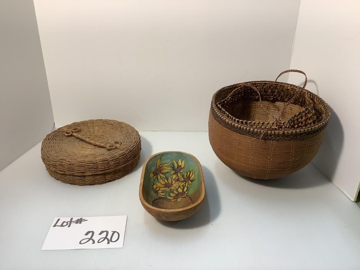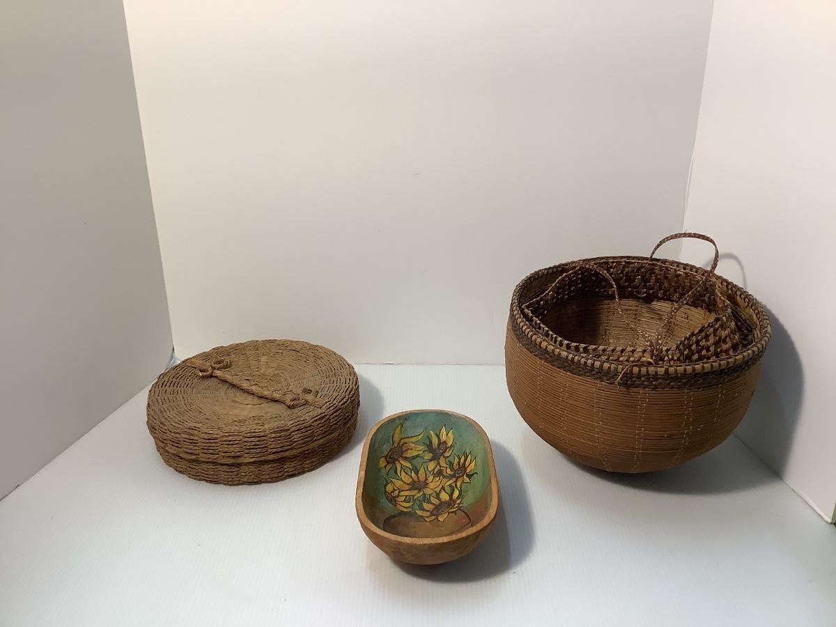 220  Vintage Pine Needle Baskets/Hand Painted Hanging Wooden Bowl