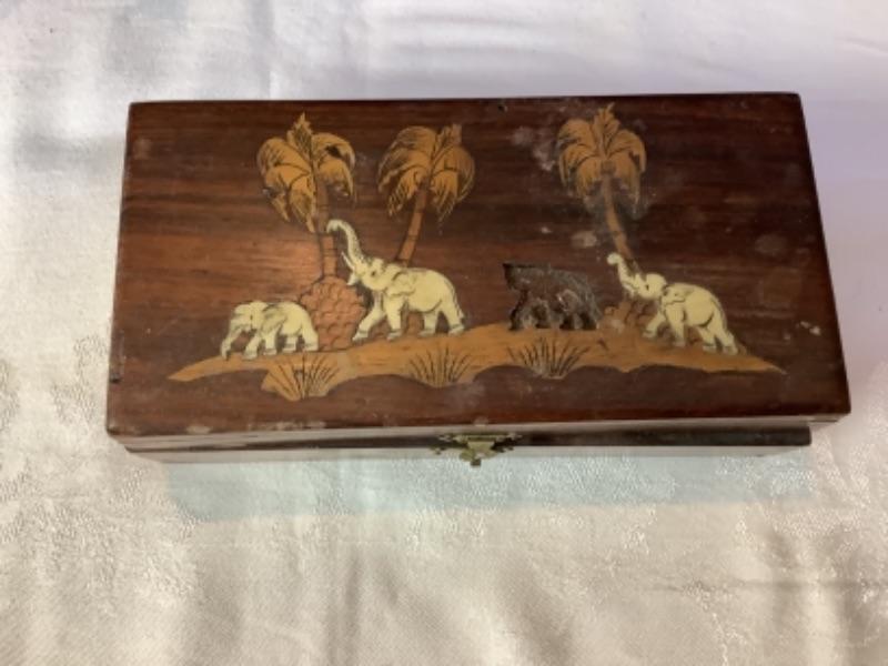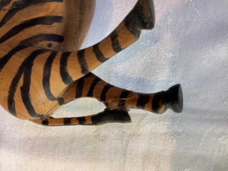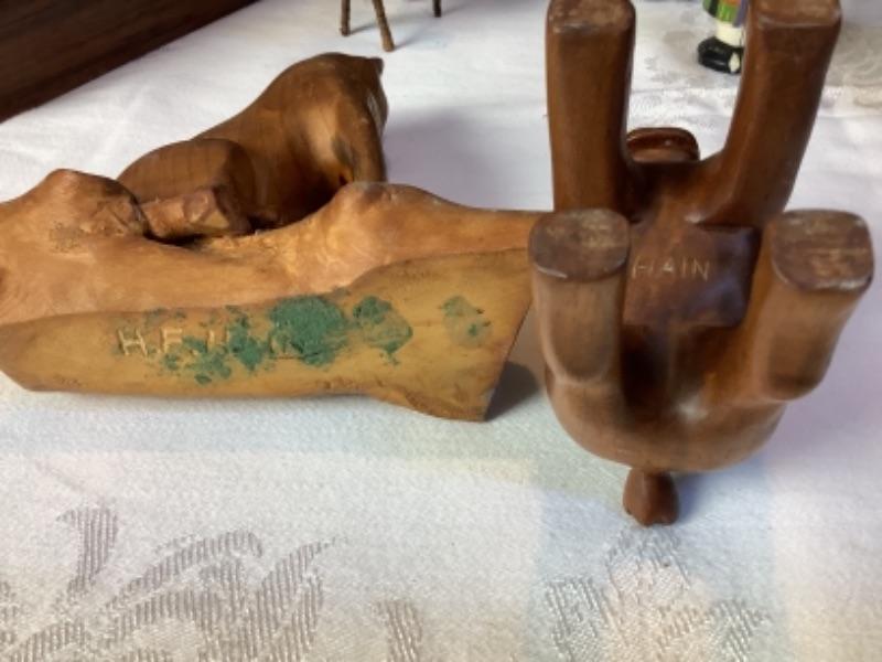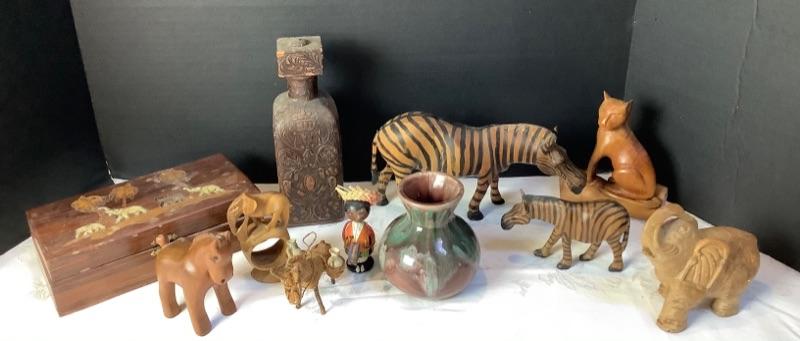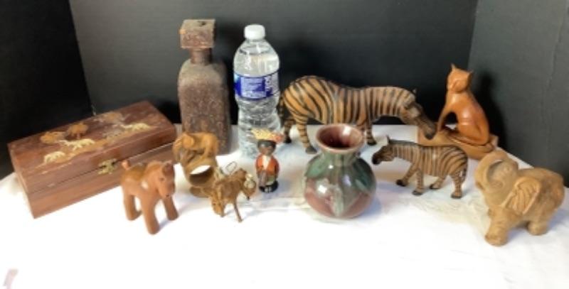 Carved wood donkey and lioness are signed Hain and H.F. Hain, Pottery vase stamped Forry 401, leather covered bottle DaVinci Boutique , Small wooden box with Elephant and Palm Tree inlay has some damage (see photos) and more