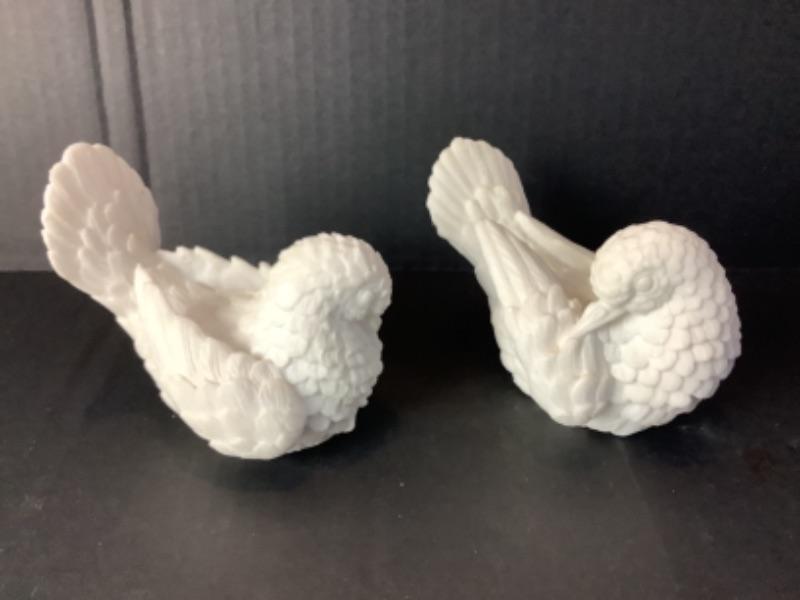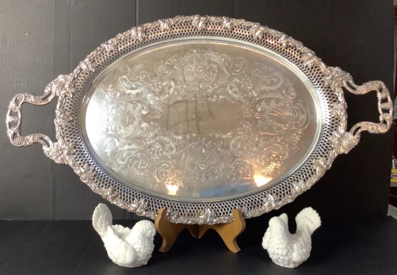 Large ornate silver plate tray28-1/2” long and 17” wide. Pair of white decorative birds made in Italy