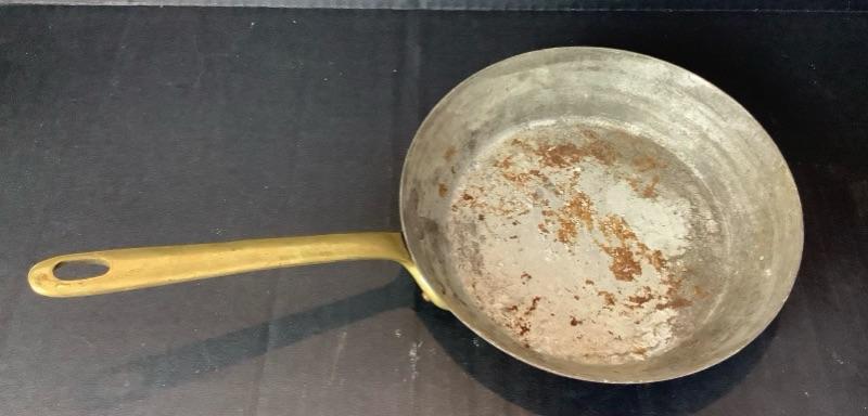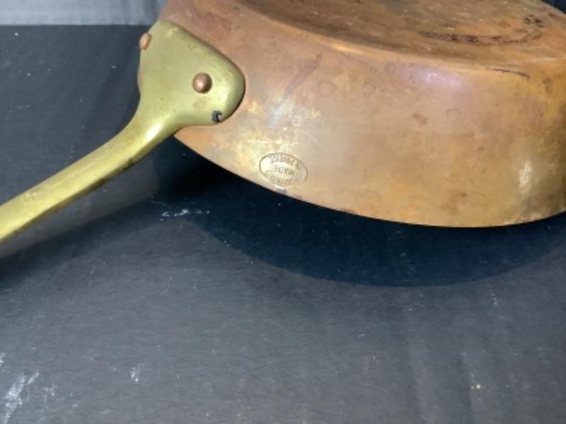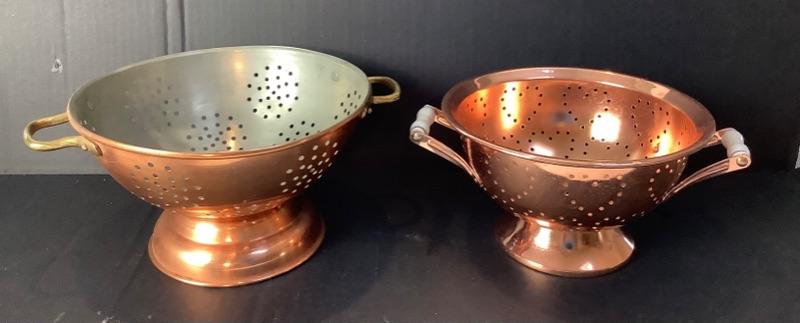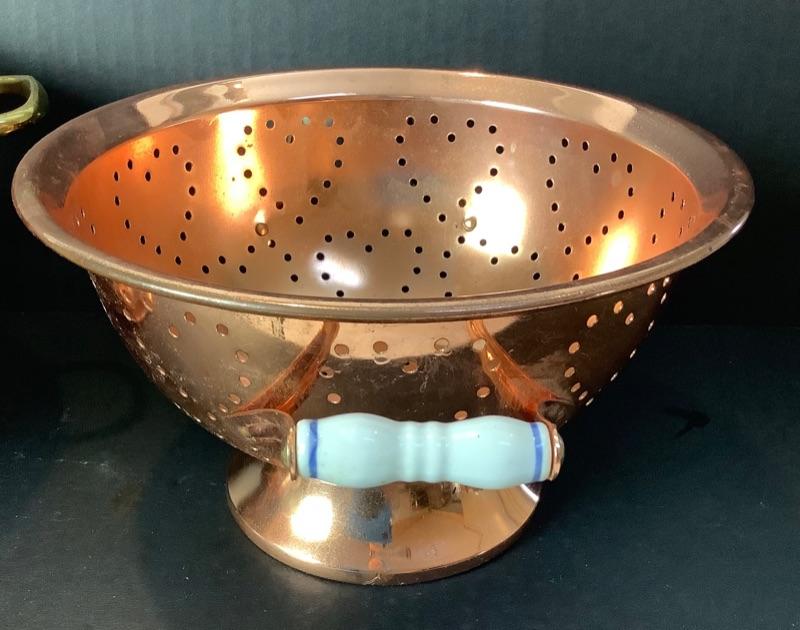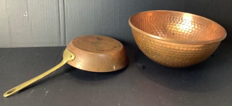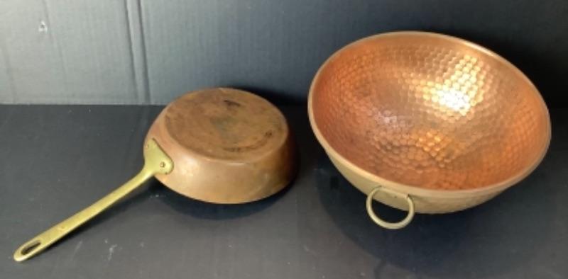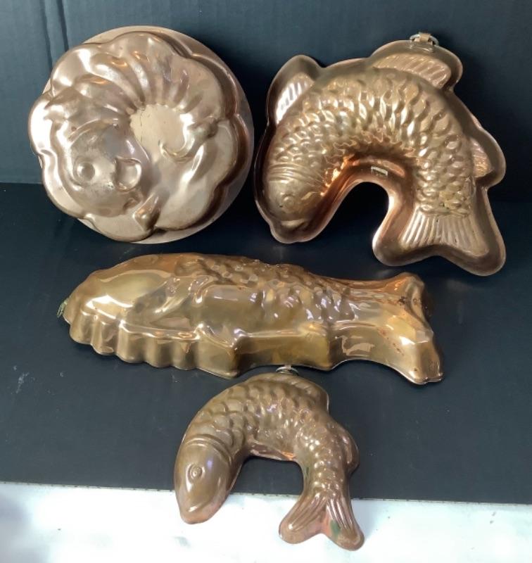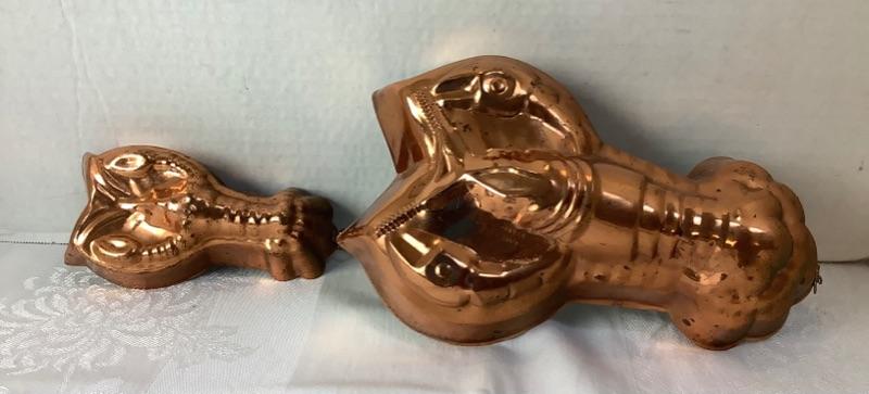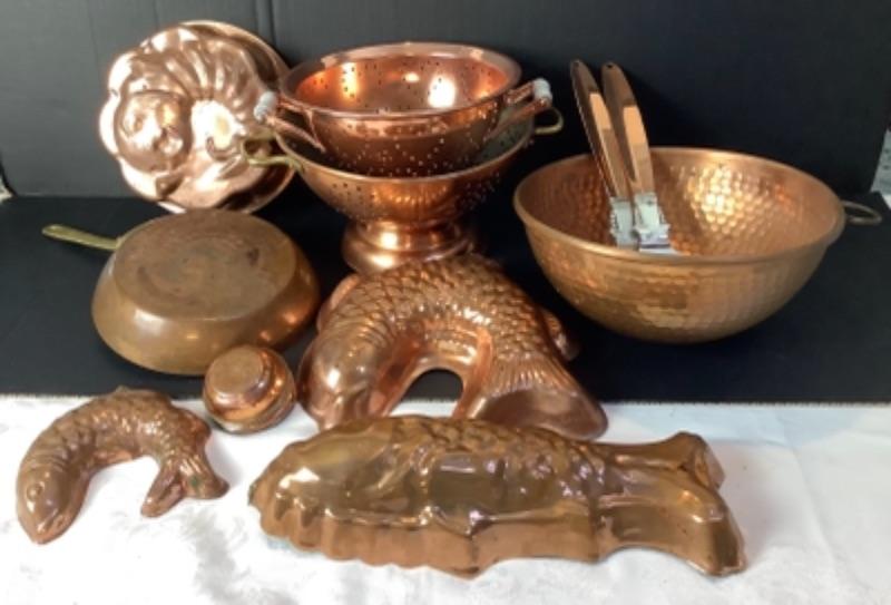 Lot of assorted copper. 4 Copper fish molds, 2 copper colanders- 1 has porcelain handles, Hammered copper bowl, small copper sauté pan by Harvard France very damaged but will make a nice wall hanging (see photos), 2 serving utensils and 5 butter bowls by Coppercraft Guild and 2 copper lobster molds