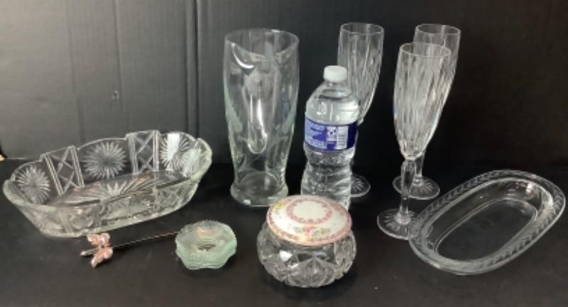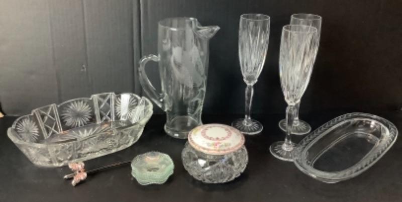 3 crystal champagne glasses, cut glass dish with hand painted porcelain lid, etched glass Wheat pattern pitcher, etched glass oval dish, cut glass bowl and bowl