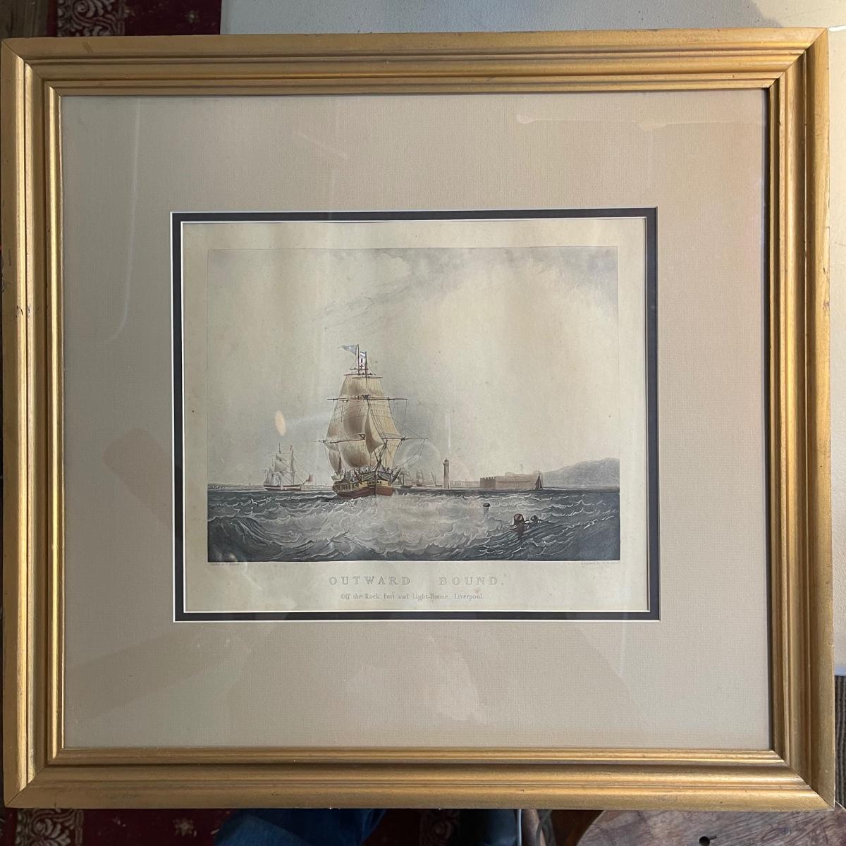 Antique Engraving By Henry Papprill “Outward Bound. In wooden frame. Engraving has some foxing & slight warping. See pics for details. Made in England.