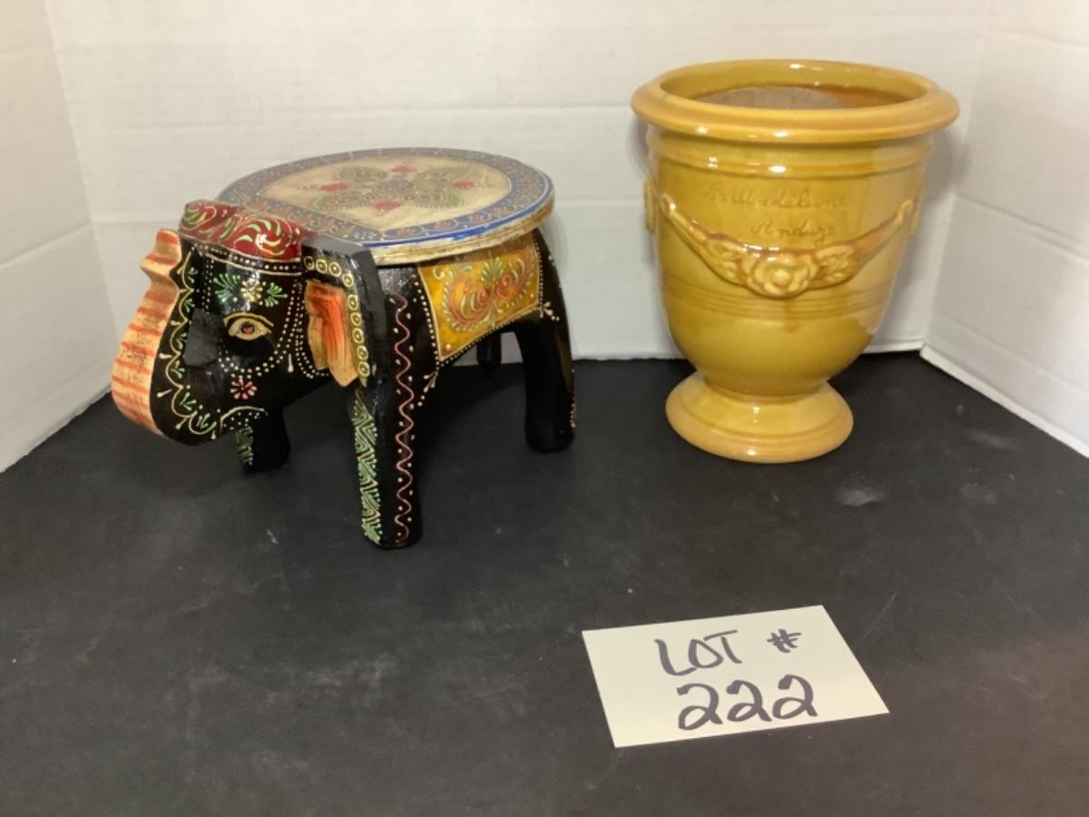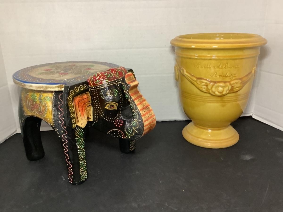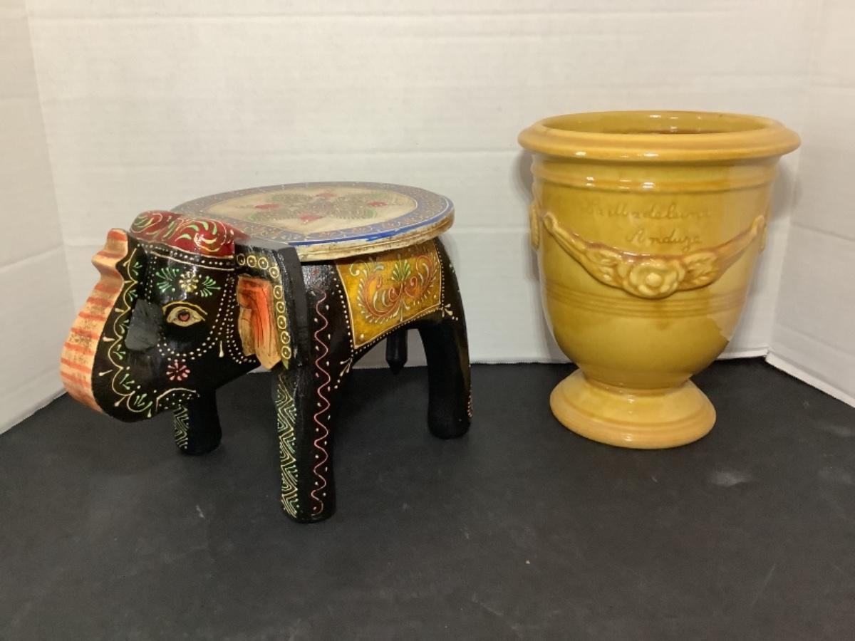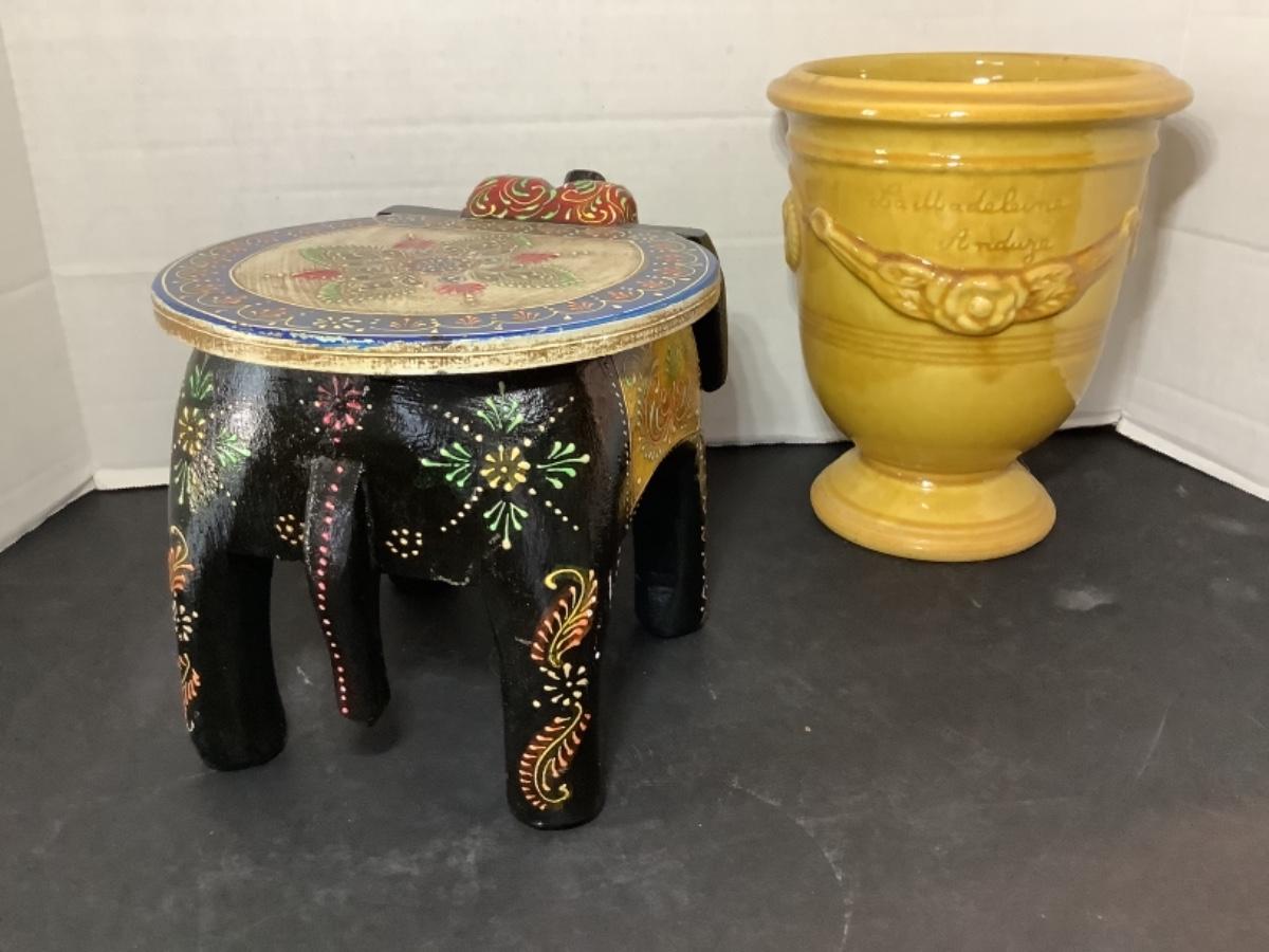 222. Asian Inspired Wooden Elephant Stand / Glazed Pottery Urn