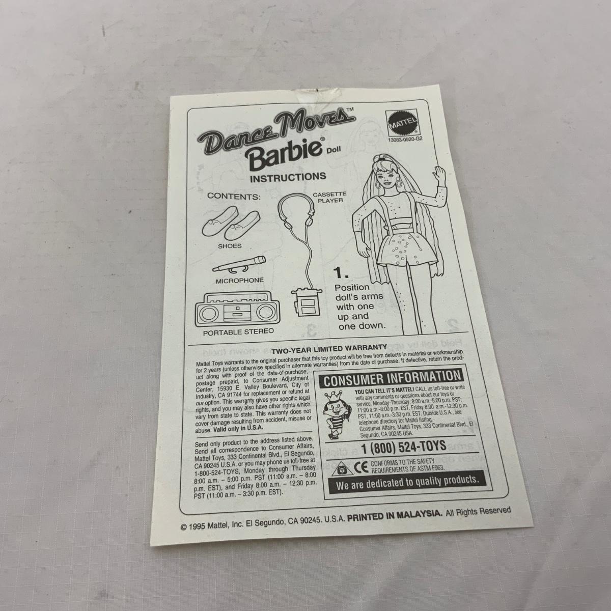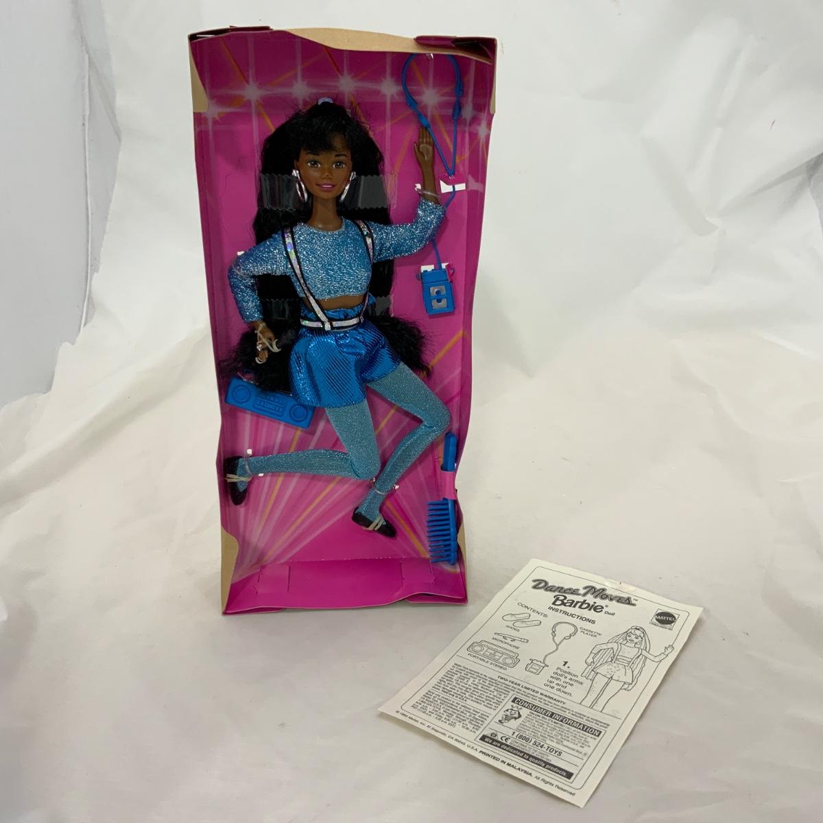 Dance Moves Barbie, produced by Mattel in 1995. She has lost her outer box (presumably to damage) but she has the original instructions on how to use the doll, and is firmly fastened into the package. Her outfit is pretty great too! Please see photos for details and condition. !!! Proceeds from this auction will be donated to the NEW COMMUNITY SHELTER in Green Bay, Wisconsin. Please see Sale Description to the Left for more information. !!! ::: Shipping is available on this lot. If you require shipping you must let us know at the close of the auction. We will coordinate with you after the item has been won. Shipping fees will include insurance up to or exceeding the value of all items being mailed. If you have any questions regarding this lot please contact the auctioneer either via this website, by direct email or by phone. PICK UP TIMES and other important information can be found in the TERMS and DESCRIPTION of the auction. Please take a look for pertinent information. Thanks!