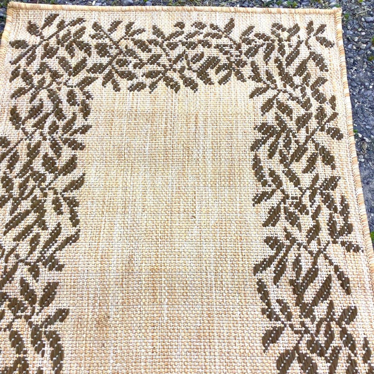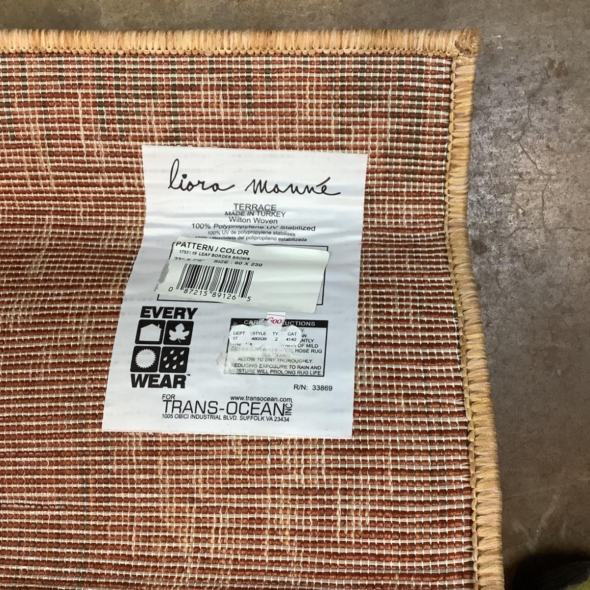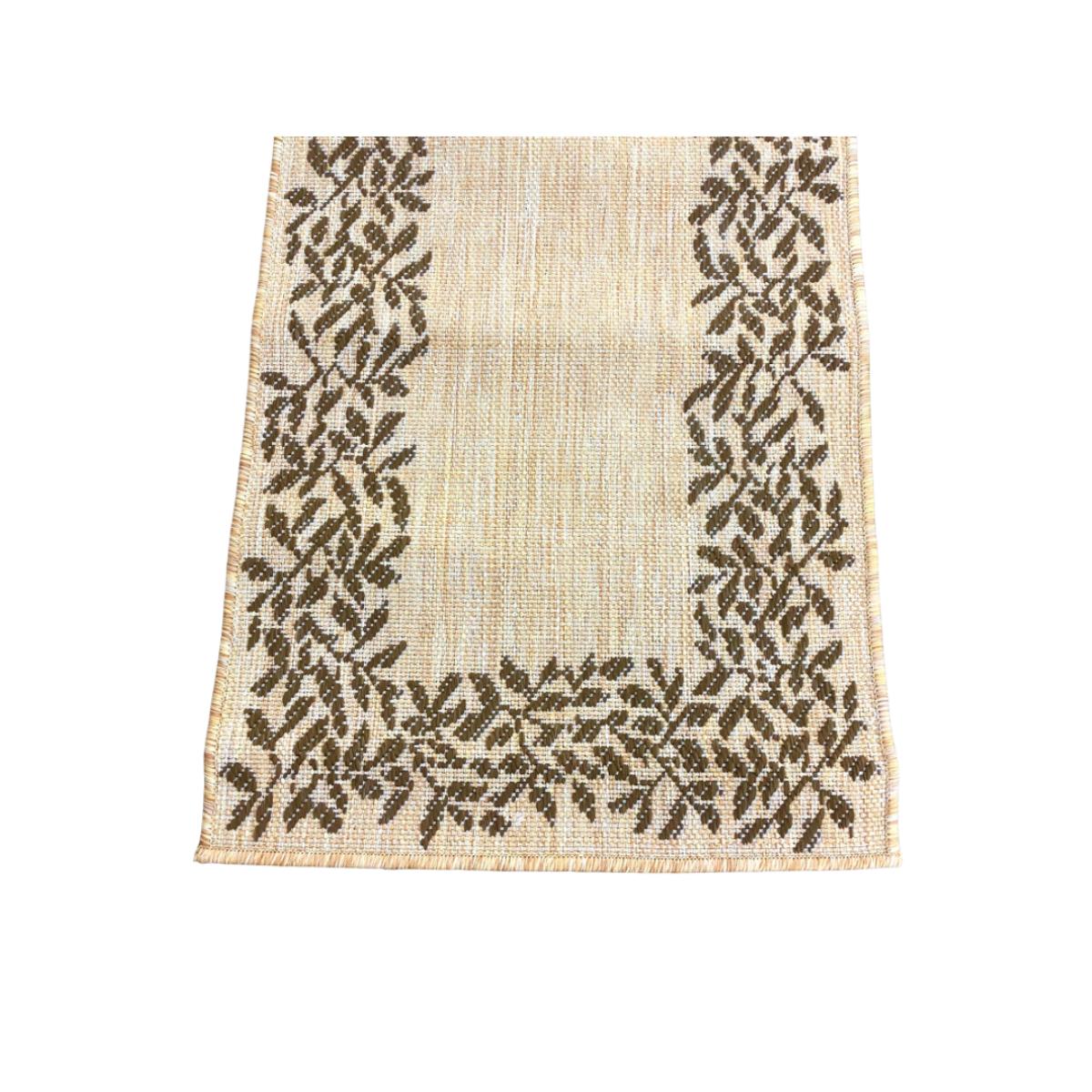 Long tan "Wilton Woven" runner "Terrace" Pattern with dark brown leaf border. Made in Turkey by Liora Manne. Measures 7'6"L, 23"W.