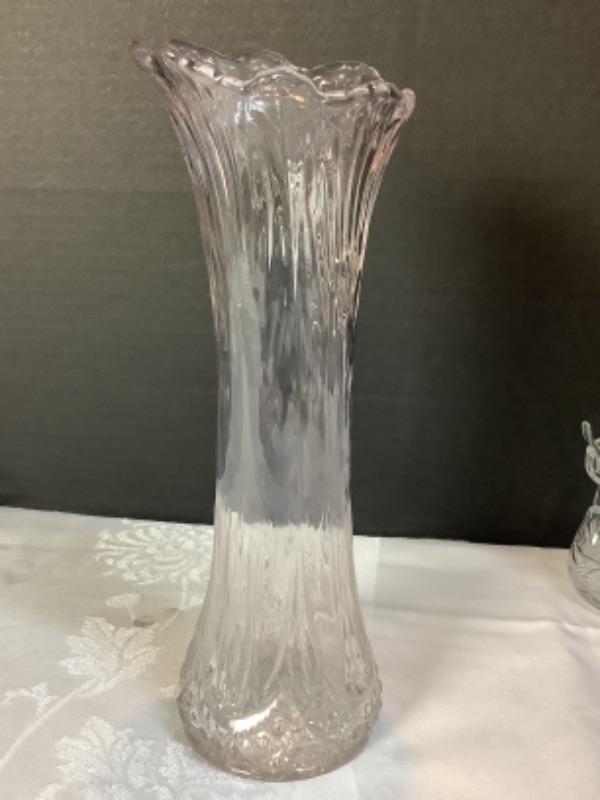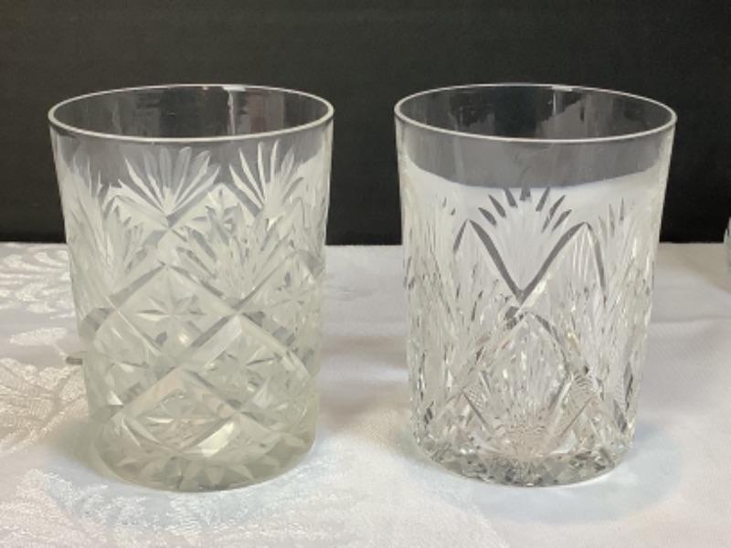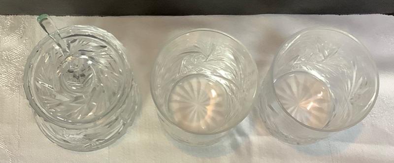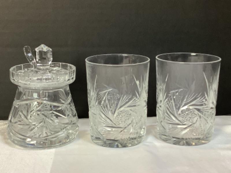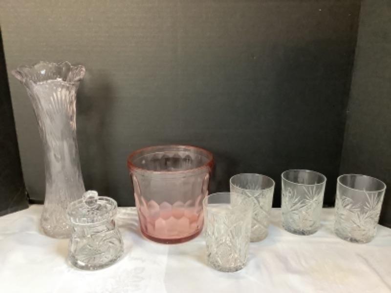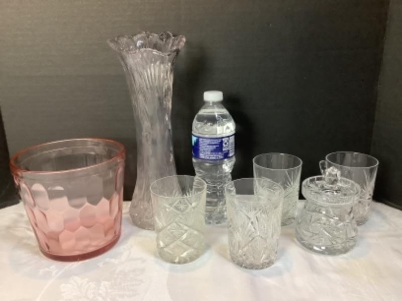 Vintage pink pressed glass ice bucket, vintage pressed glass vase has a light pink tint , pair of vintage cut crystal glasses with matching sugar dish, sugar dish has lid and spoon and two vintage cut crystal glasses