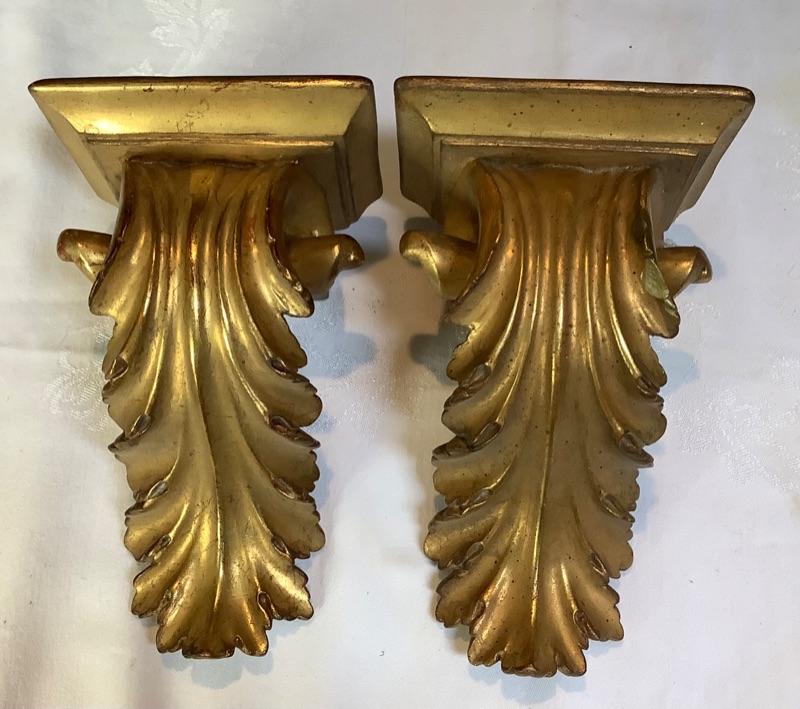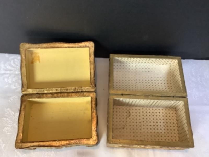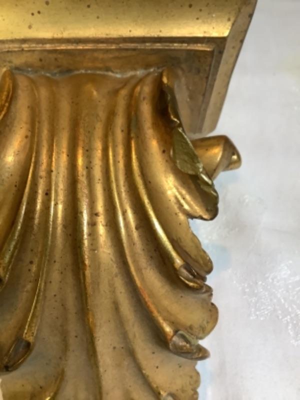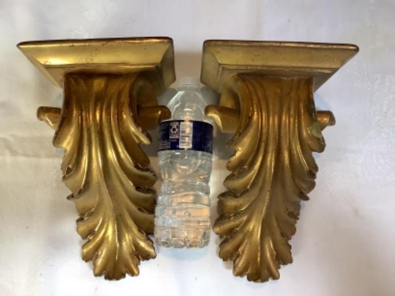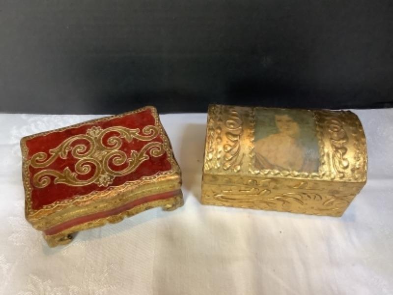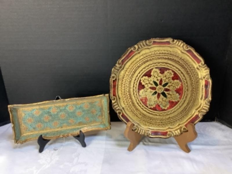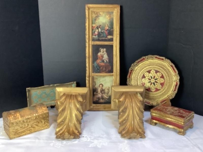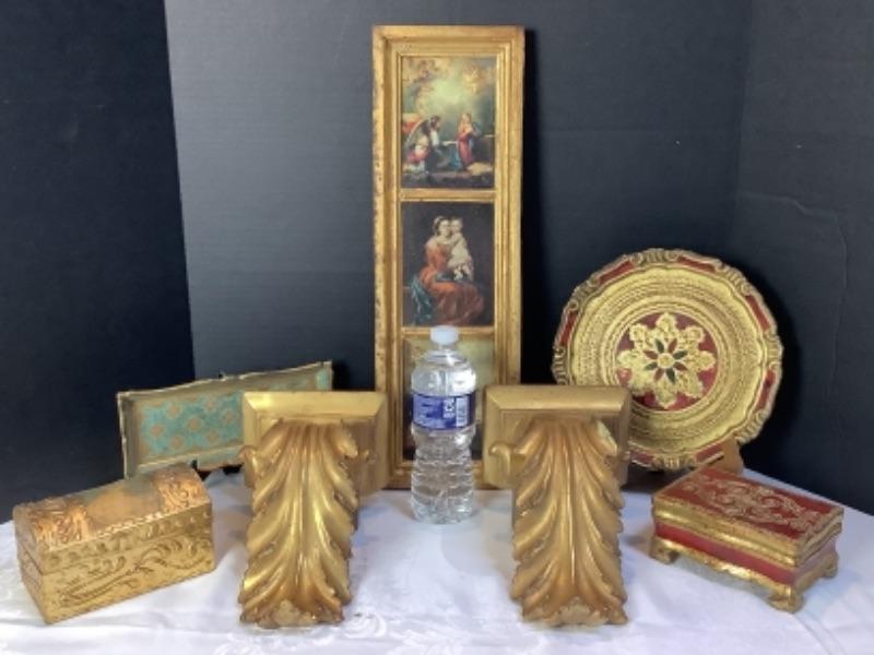 Pair of painted gold terracotta wall shelves- one has a small chip (see photos), Gold framed art Made in Spain, Florentina hand made in Italy plate/round tray, small tray and two small decorative boxes- red and gold box Made In Italy