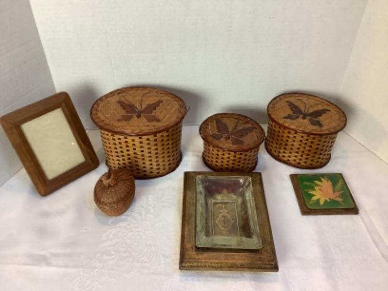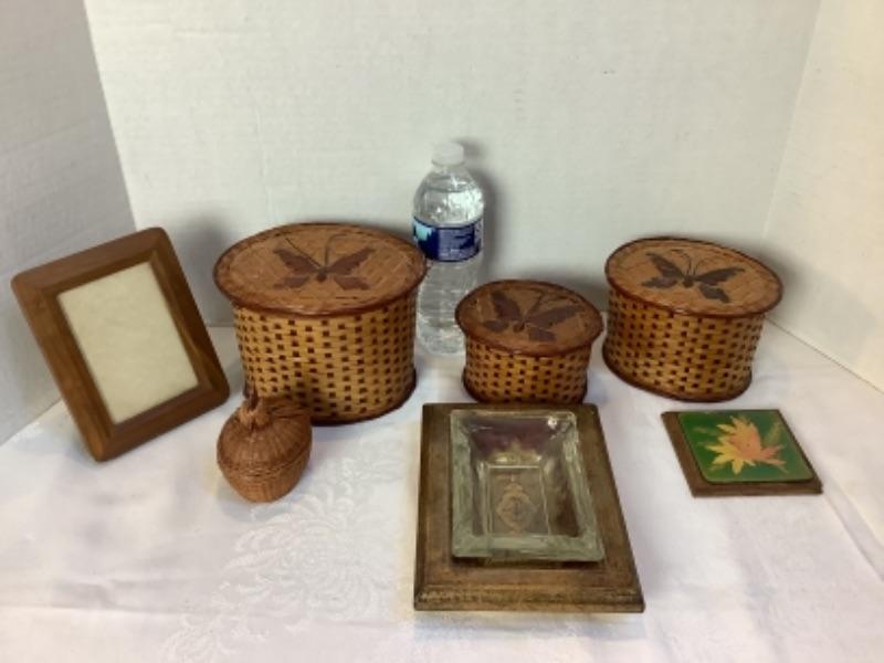 Florentina hand made hand painted ashtray, Wood picture frame, three stacking butterfly baskets and more