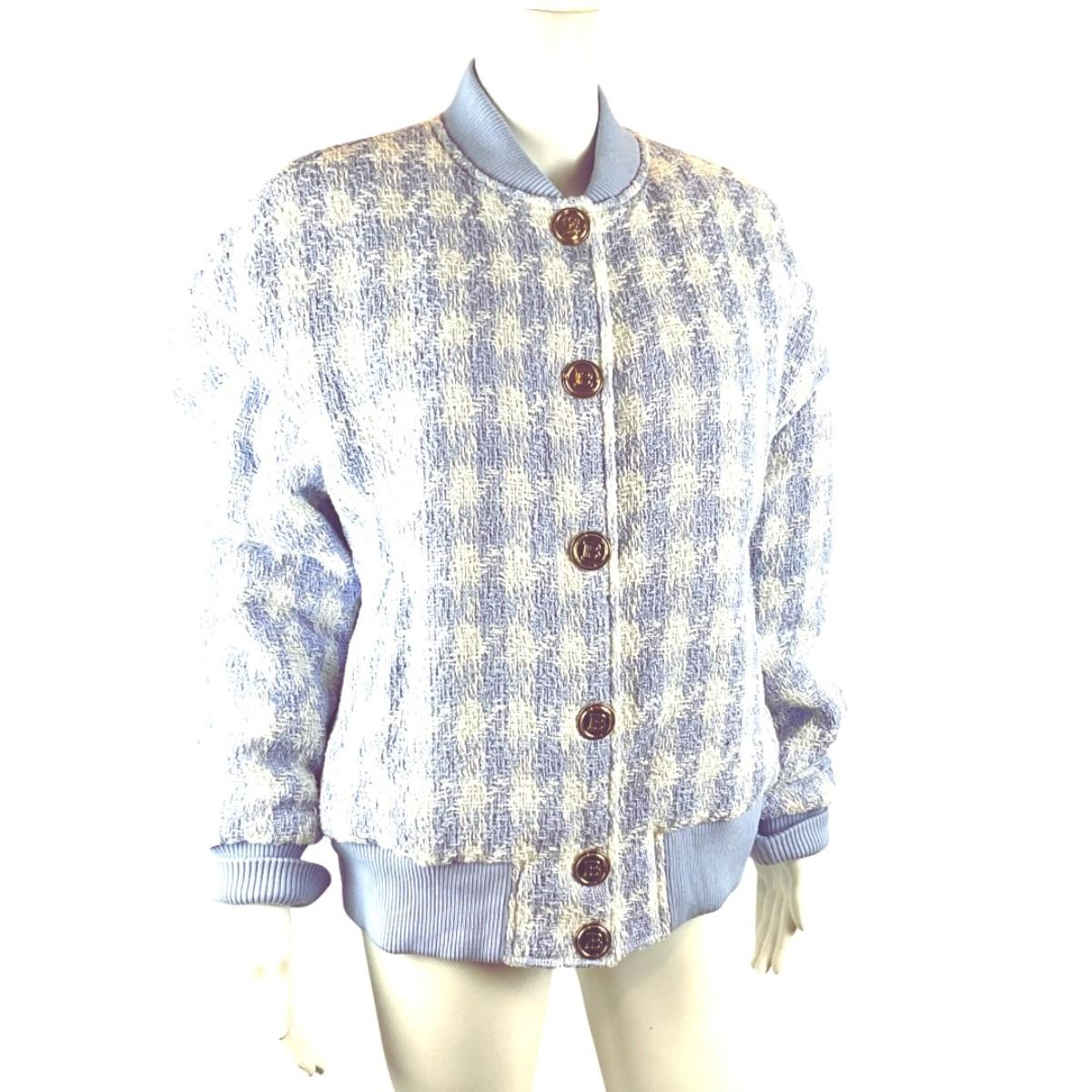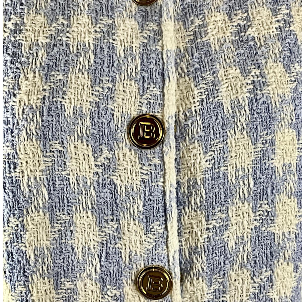 This stunning BALMAIN Paris jacket features an elegant blue and white houndstooth tweed bomber jacket , perfectly tailored for a sophisticated look. The jacket includes luxurious gold-tone buttons embossed with the Balmain logo and mock neck and cuffs Cotton 92%, Polyester 7%, Other Fibers 1