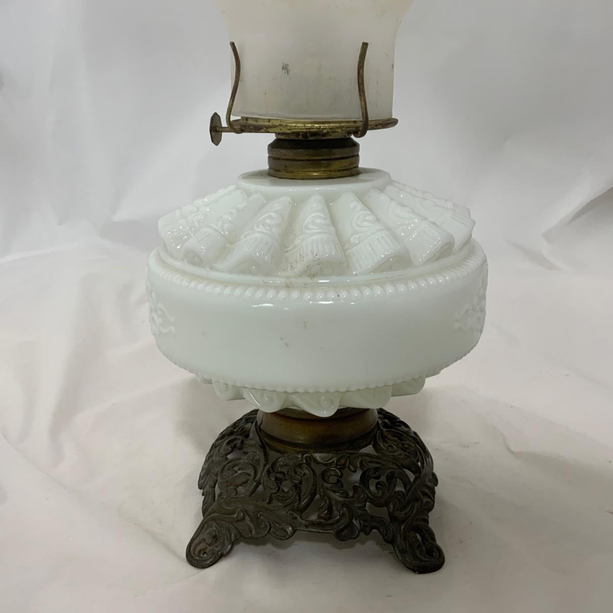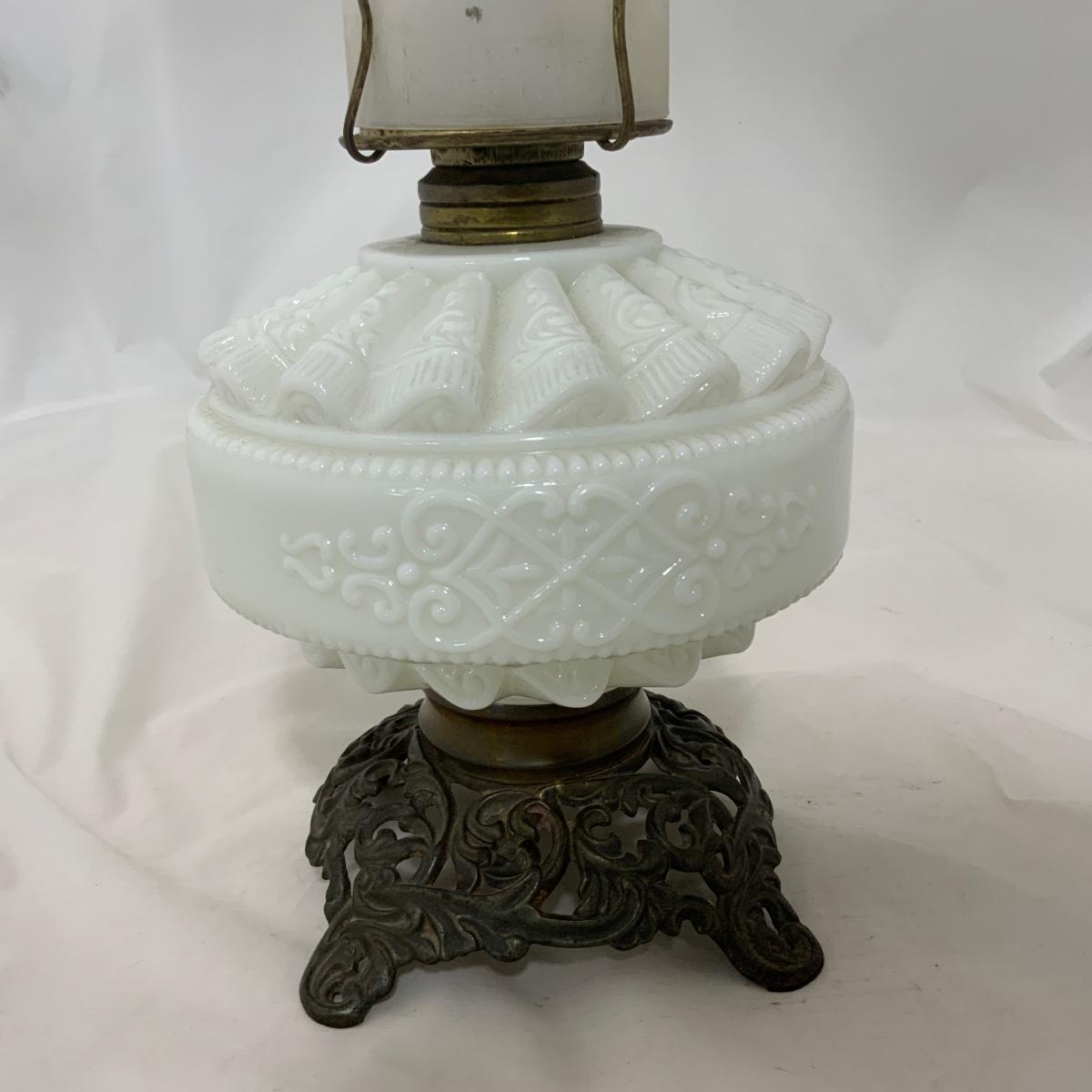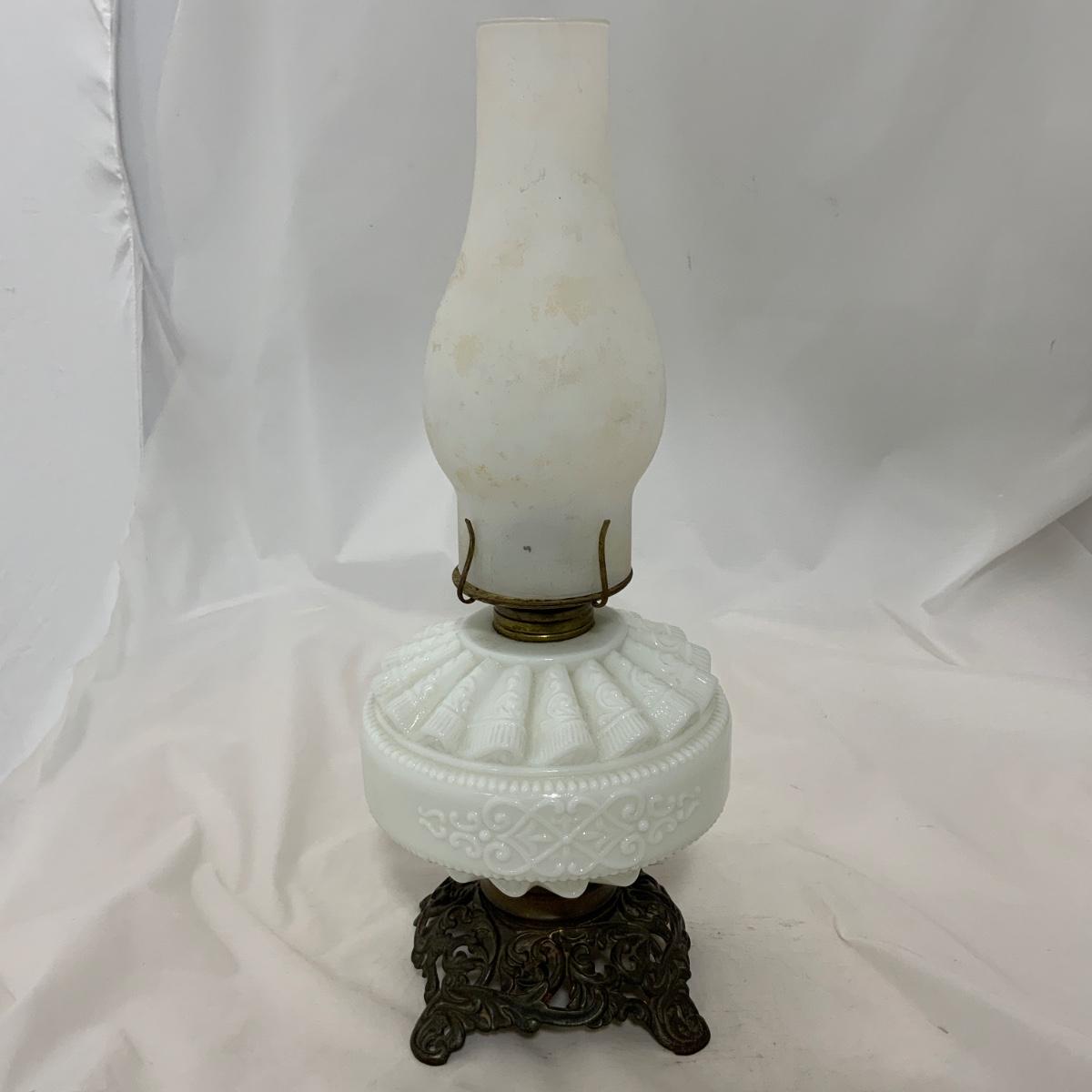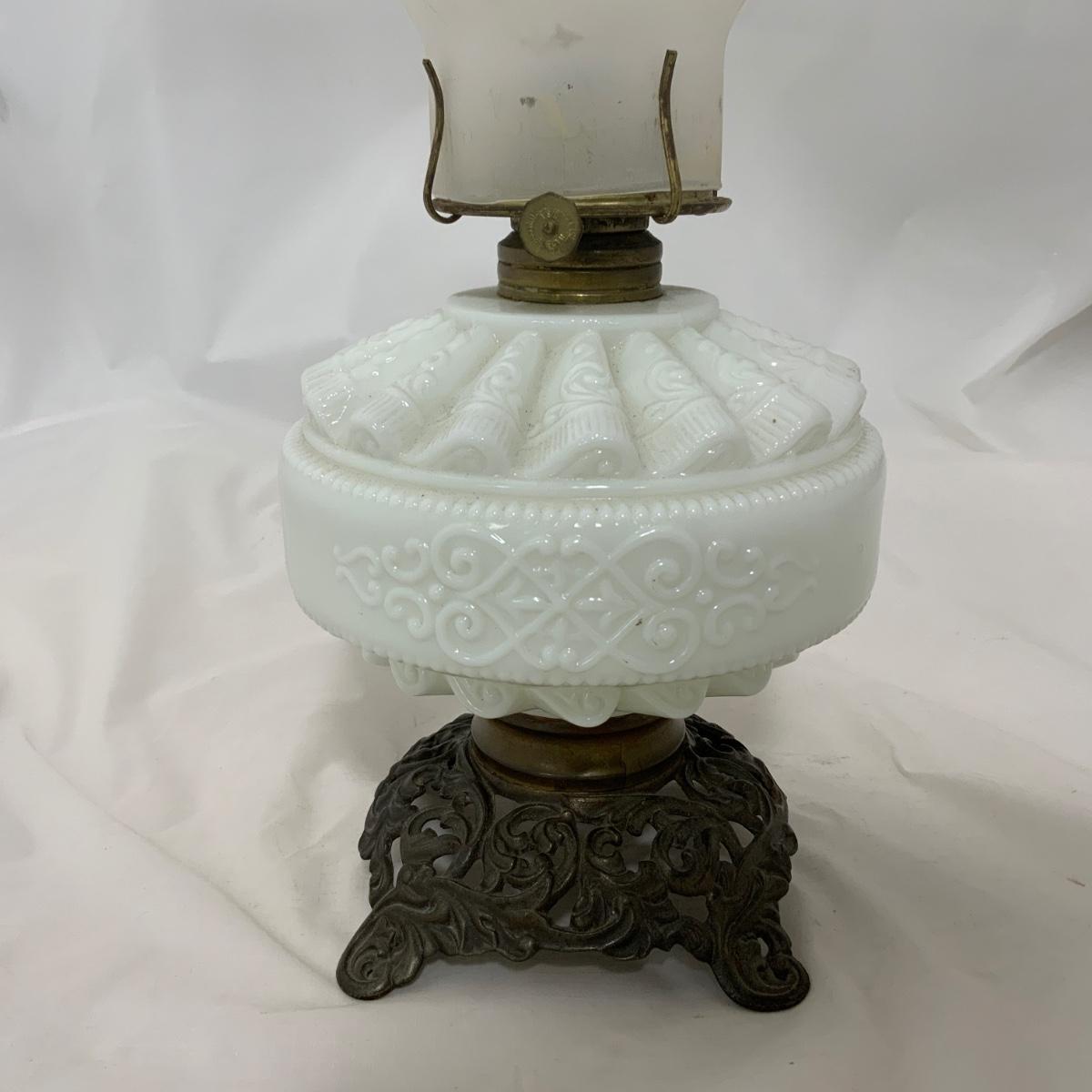 Nice white glass Kerosene Patterned Lamp, circa 1880. The chimney may be a replacement, or maybe you just want to replace it. Either way, you’re right. Measures 16.75” tall and approximately 6.5” wide. Please see photos for details and condition. ::: Shipping is available on this lot. If you require shipping you must let us know at the close of the auction. We will coordinate with you after the item has been won. Shipping fees will include insurance up to or exceeding the value of all items being mailed. If you have any questions regarding this lot please contact the auctioneer either via this website, by direct email or by phone. PICK UP TIMES and other important information can be found in the TERMS and DESCRIPTION of the auction. Please take a look for pertinent information. Thanks!