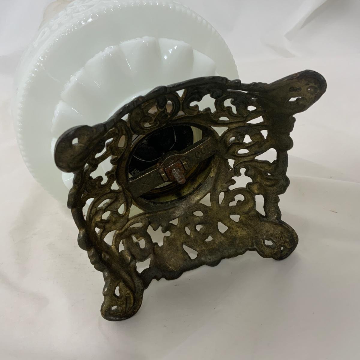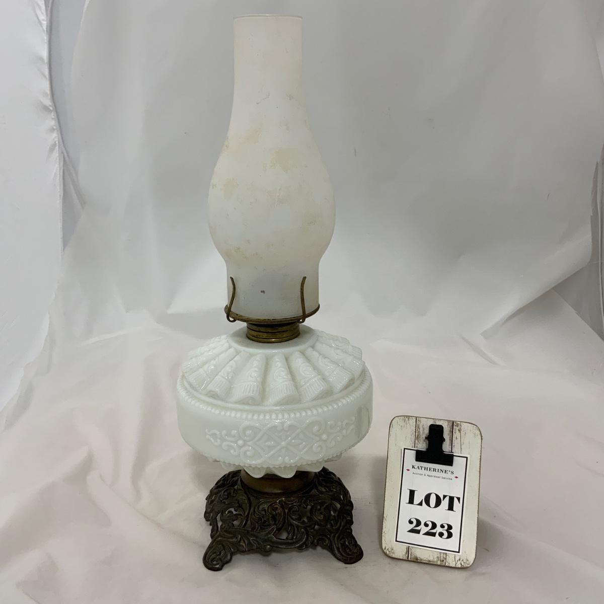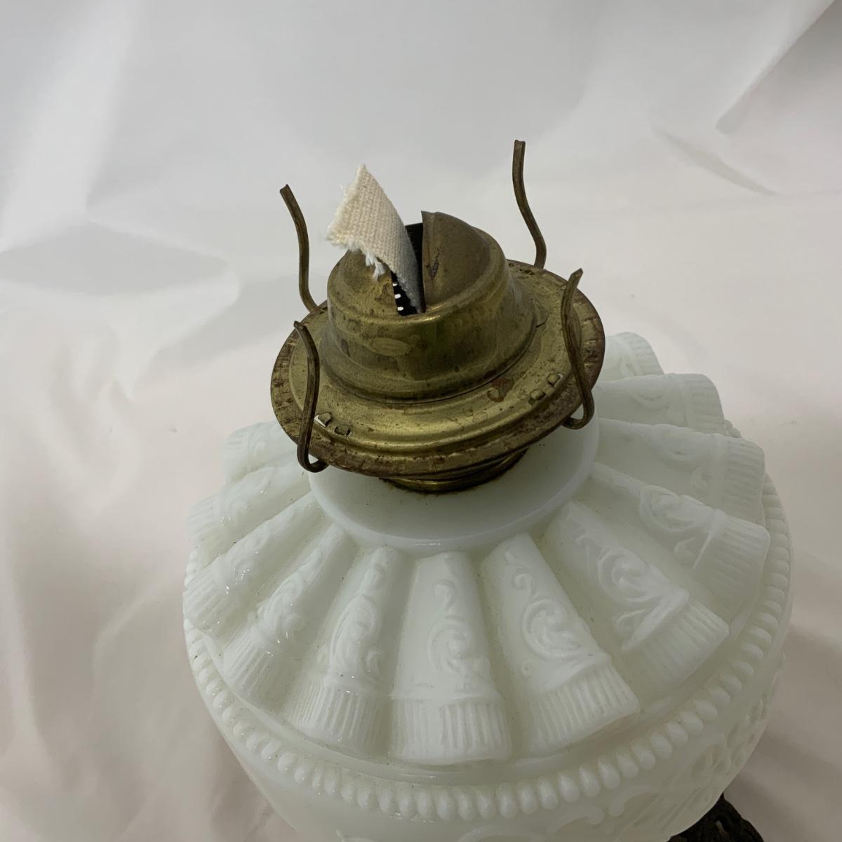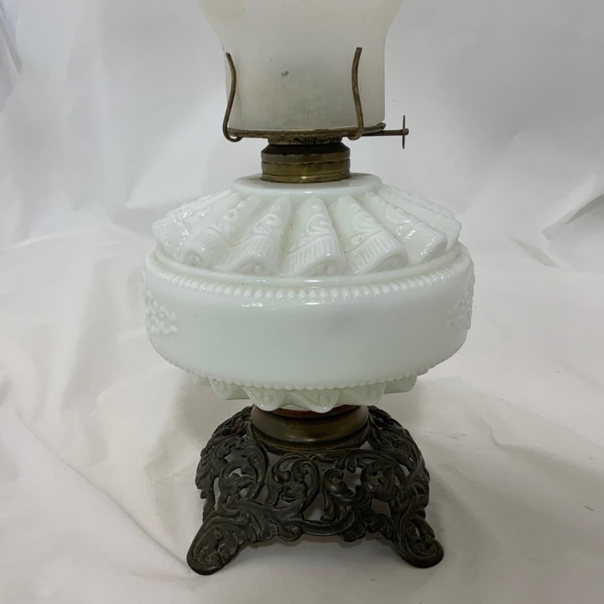 Nice white glass Kerosene Patterned Lamp, circa 1880. The chimney may be a replacement, or maybe you just want to replace it. Either way, you’re right. Measures 16.75” tall and approximately 6.5” wide. Please see photos for details and condition. ::: Shipping is available on this lot. If you require shipping you must let us know at the close of the auction. We will coordinate with you after the item has been won. Shipping fees will include insurance up to or exceeding the value of all items being mailed. If you have any questions regarding this lot please contact the auctioneer either via this website, by direct email or by phone. PICK UP TIMES and other important information can be found in the TERMS and DESCRIPTION of the auction. Please take a look for pertinent information. Thanks!