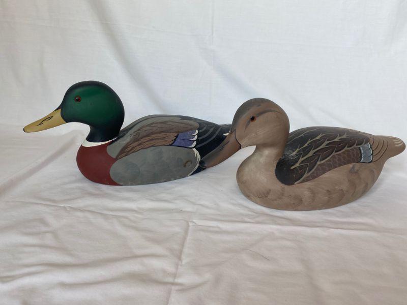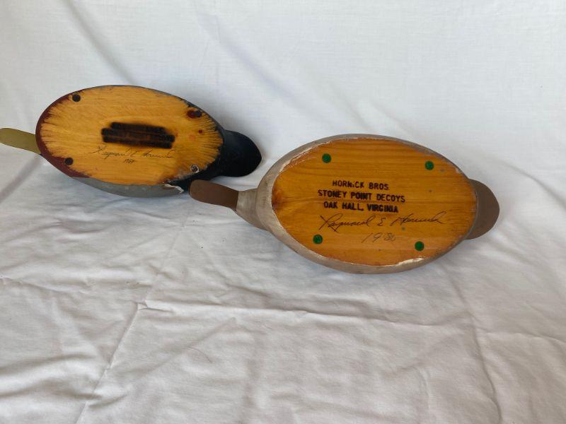 Pair of Hornick Bros. Mallard Decoys 1980 & 1981 Female is 1980 and male is 1981 Marked on bottom Hornick Bros Stoney Point Decoys Oak Hall, Va. Crack in male body. Measuring 15" x 6.5"