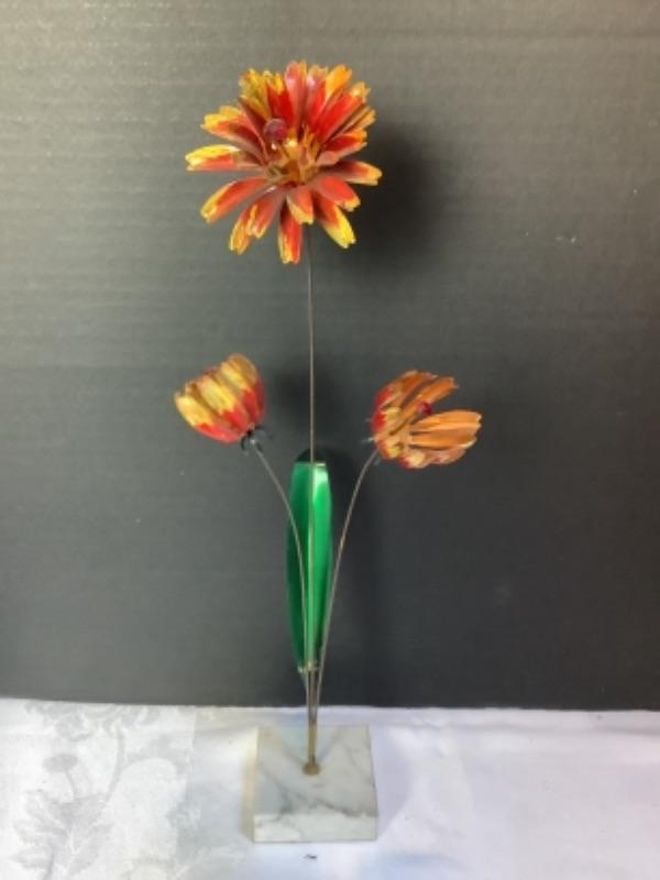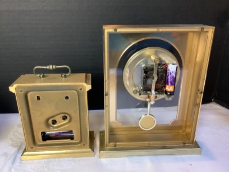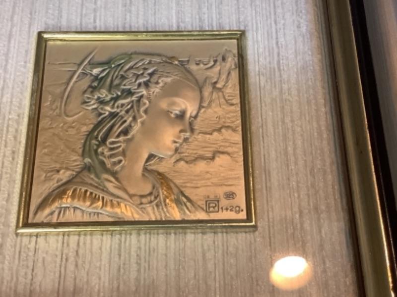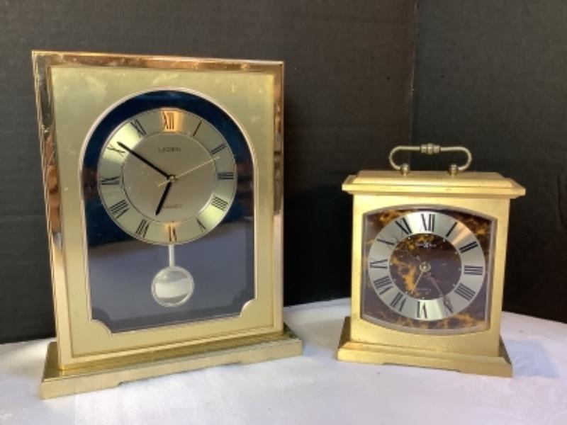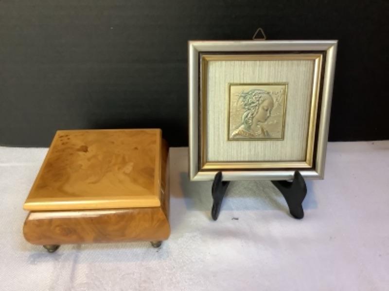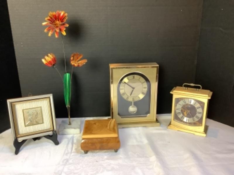 Vintage Italian Lastro Argento creations artistically .925 sterling silver framed portrait 4-1/2” x 4-1/2” in excellent condition, small wooden trinket box , Enamel flower with marble base, Howard Miller brass clock- missing batetery cover, Linden brass clock- missing back cover (see photos)
